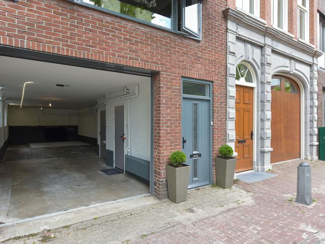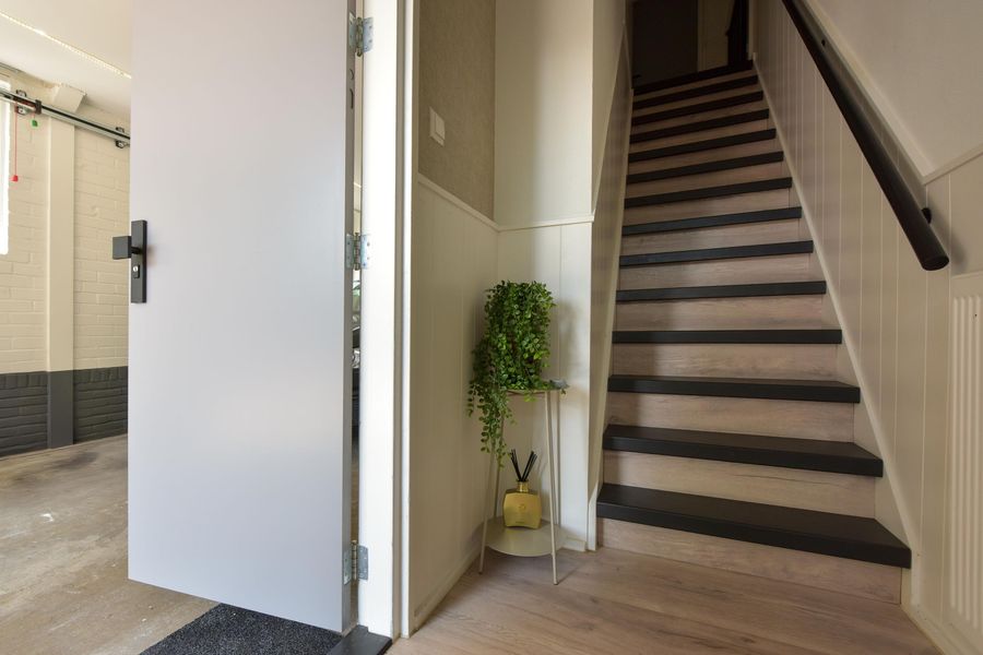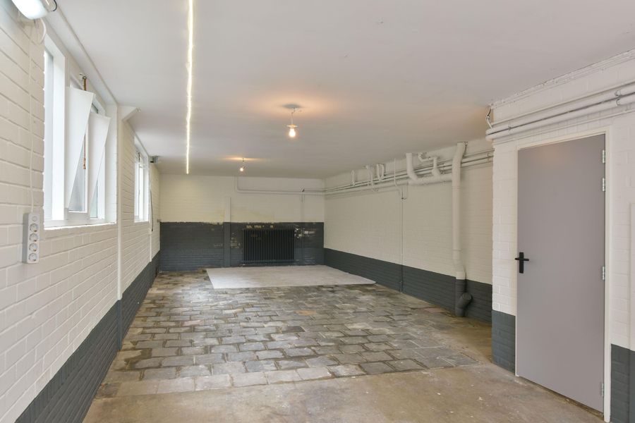 Op de begane grond bevindt zich de hoofdentree, waar je via stalen deuren toegang krijgt tot de trap naar de woonruimte boven. Naast deze hoofdentree vind je de elektrische deur waarachter zich de garage bevindt waar je drie auto’s kunt stallen. Deze ruimte is dermate groot dat je ook kan besluiten om te kijken naar mogelijkheden om deze in tweeën te delen voor bijvoorbeeld bedrijfsruimte aan huis, waarbij er tóch nog ruimte blijft om ook de auto aan huis te stallen. Dit is toch wel luxe te noemen in een binnenstad waar een parkeerplaats vinden altijd een uitdaging is.