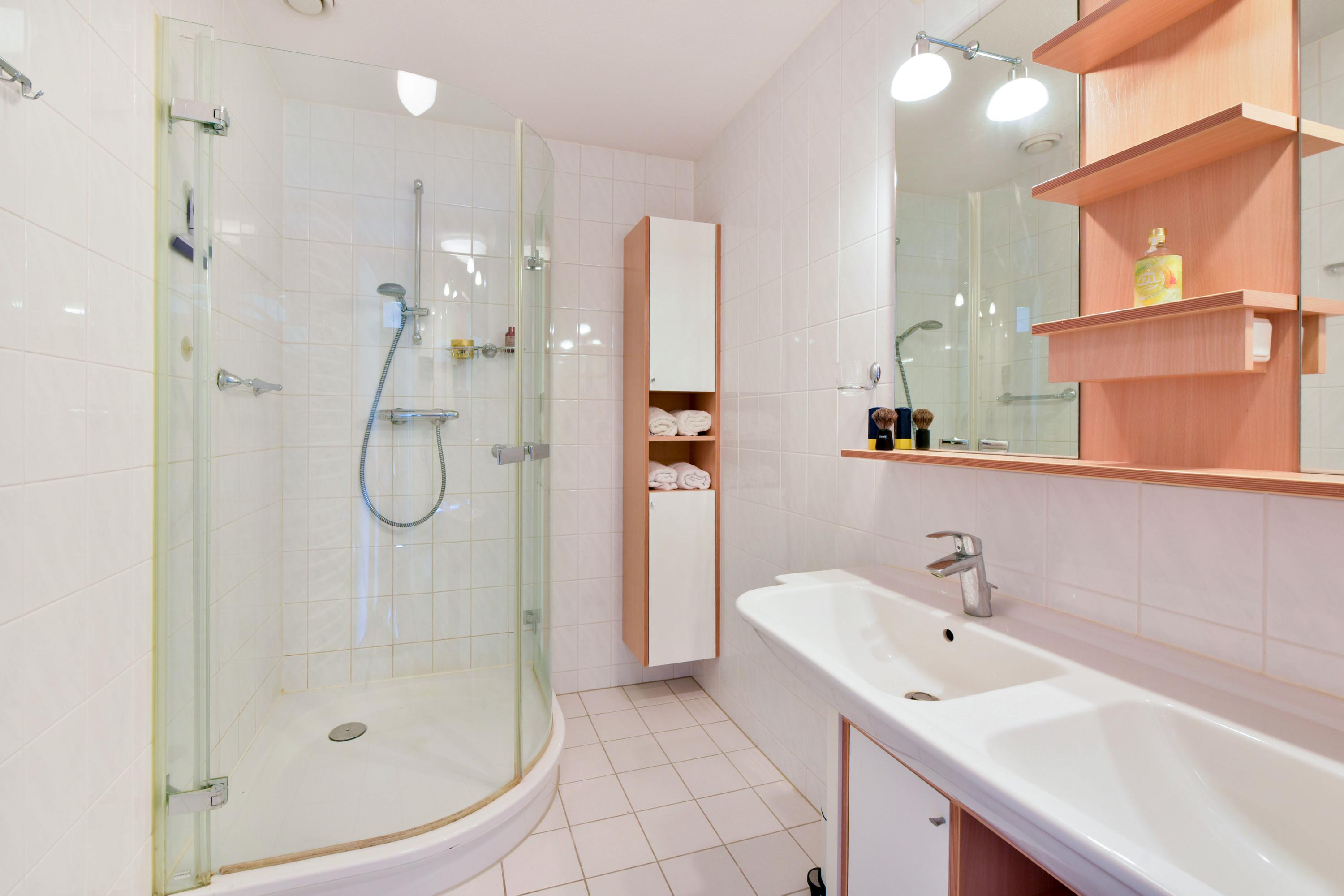 - Nette badkamer met douchecabine, dubbele wastafel en een separaat wandcloset;
