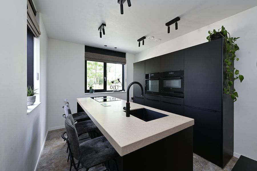 - Luxe zwarte keuken met inductiekookplaat, stoomoven, combi-oven, koelvries, quooker en bar;