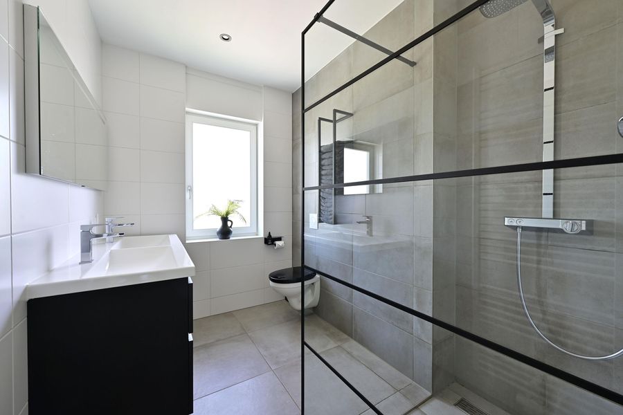 - Badkamer met inloopdouche, dubbel meubel, wandcloset en vloerverwarming;