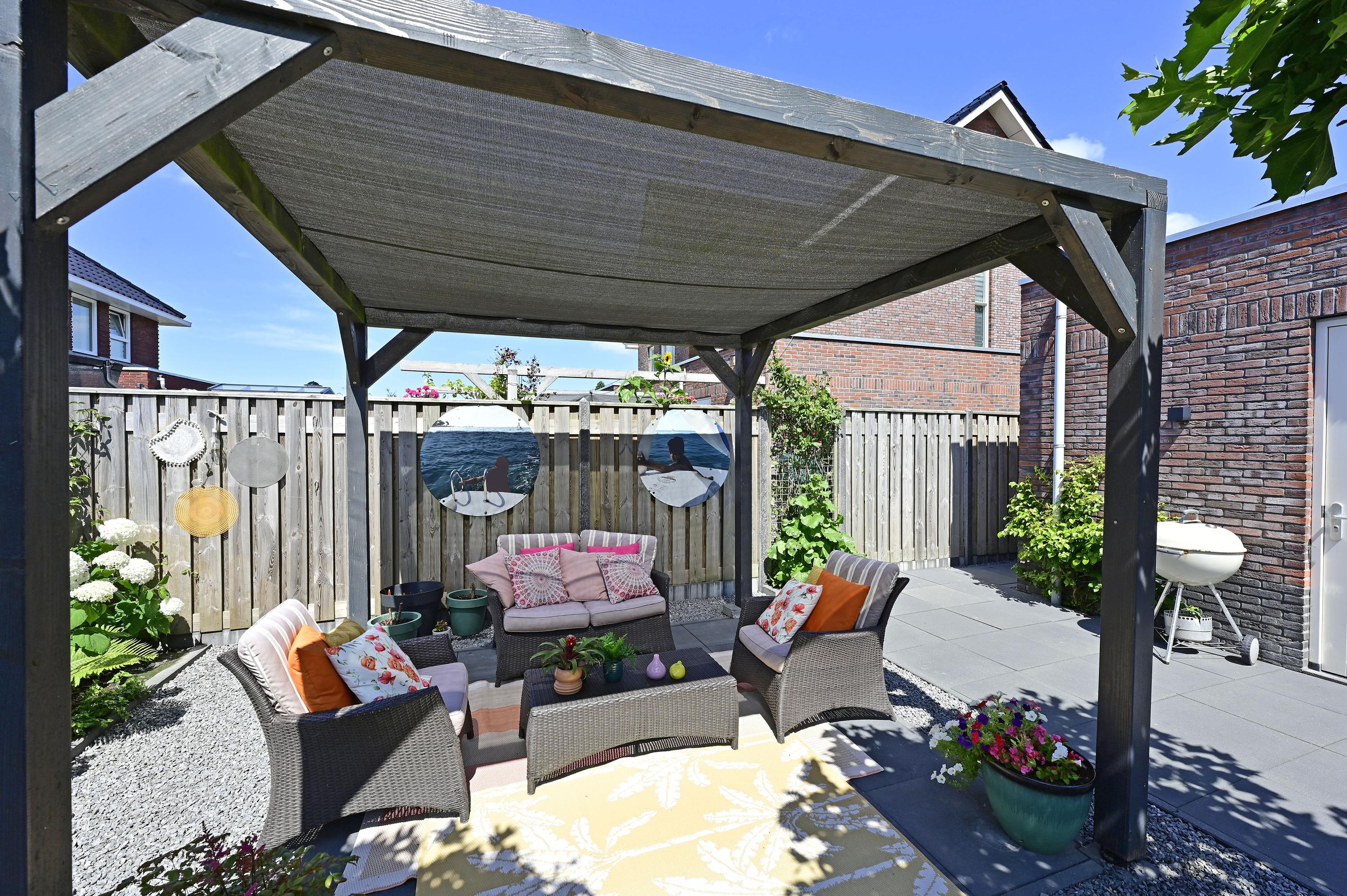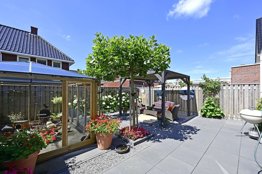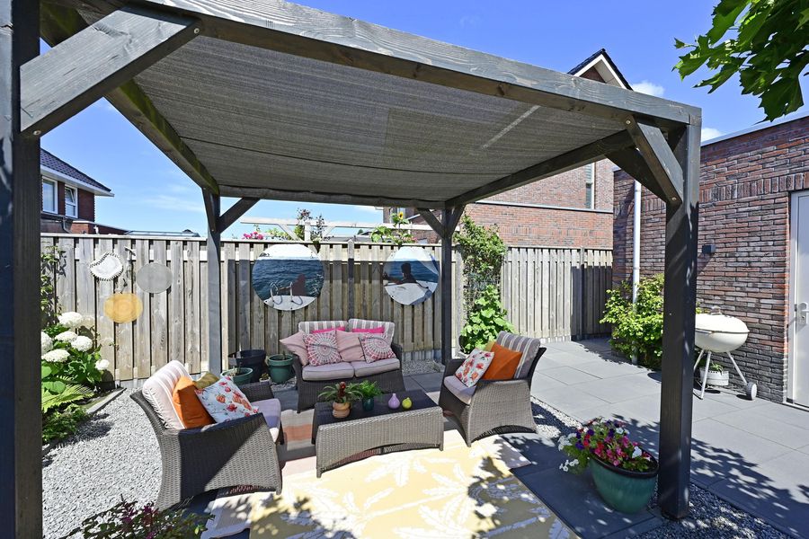 En dan die tuin... Wat een heerlijke plek! Gelegen op het zuidwesten, prachtig aangelegd en echt helemaal af. Met luxe bestrating, mooie beplanting, een breed zonnescherm en een stijlvolle overkapping kun je hier het hele jaar door genieten.