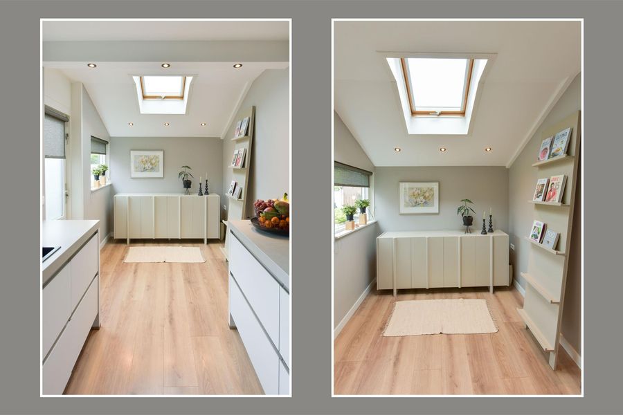 De keuken is absoluut een blikvanger: strak, modern en praktisch. Met een robuust werkblad, spoelbak, nieuwe combi-oven, koel-vriescombinatie, vaatwasser en een slimme dubbele opstelling heb je hier alles wat je nodig hebt. Dankzij de doorgetrokken berging is de ruimte verrassend groot én heerlijk licht, onder meer dankzij het dakraam.