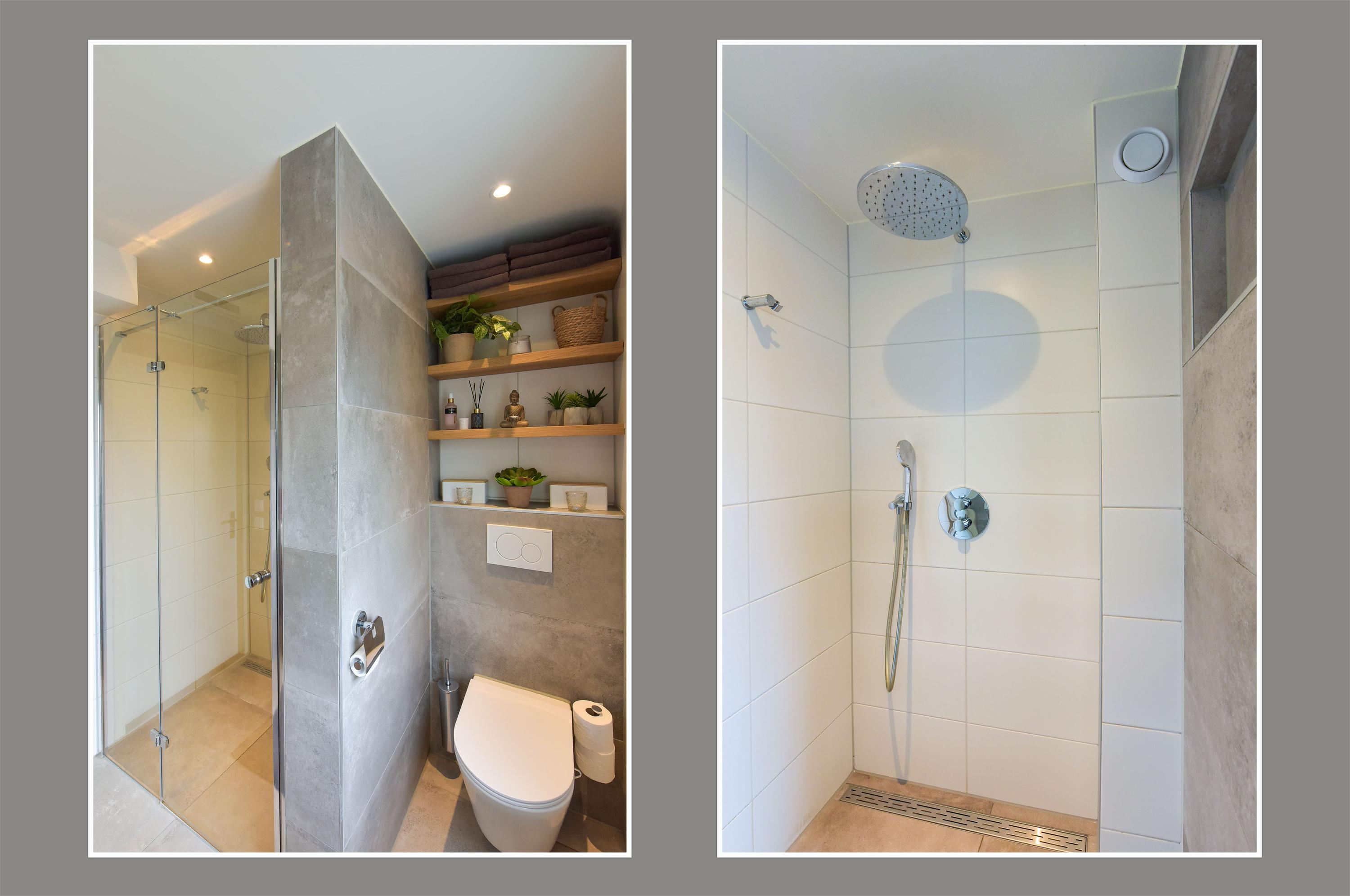 - Moderne badkamer met fraaie grijstinten, douchecabine, wastafelmeubel en wandcloset;