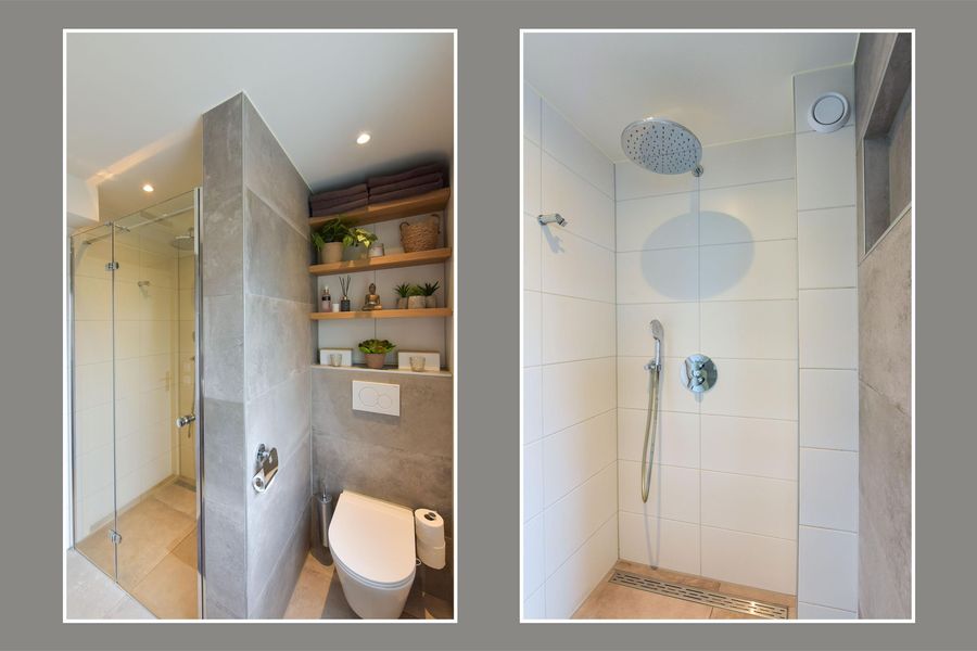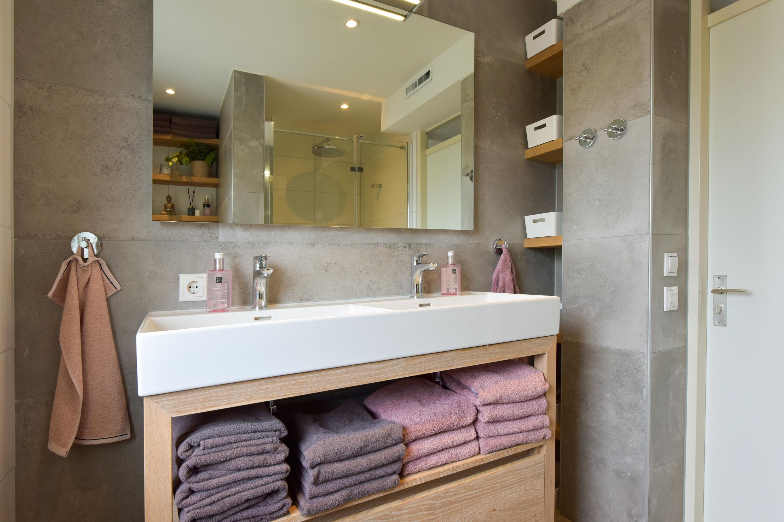 De badkamer is stijlvol afgewerkt met grijstinten en biedt een douchecabine, wandcloset en wastafelmeubel. Alles nog relatief recent, dus geen zorgen over onderhoud of toekomstige kosten.