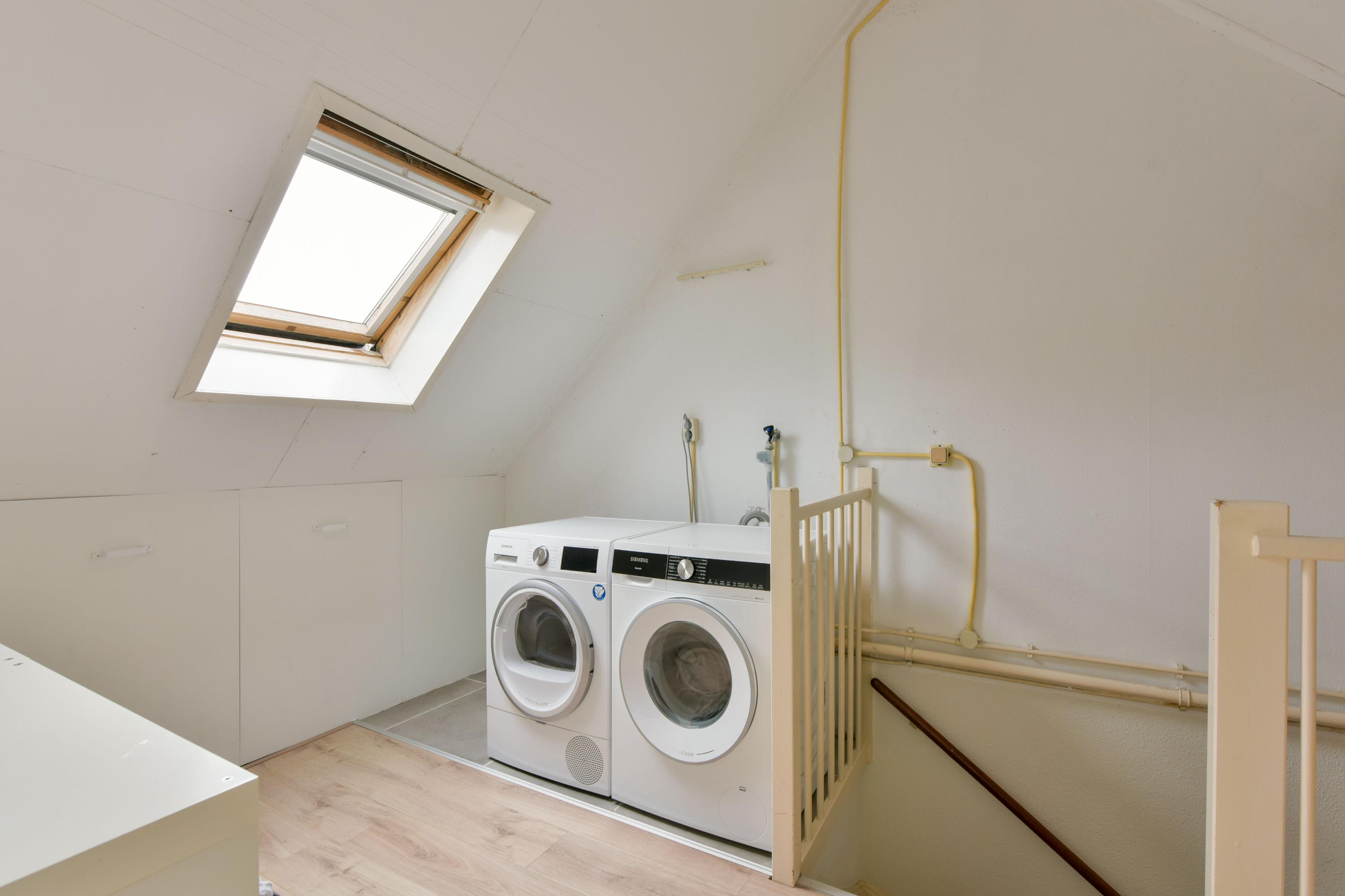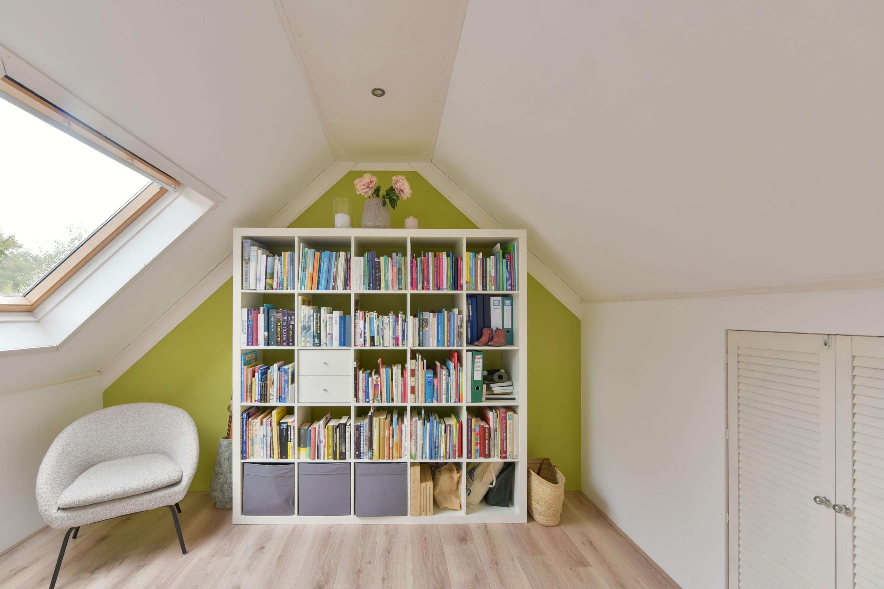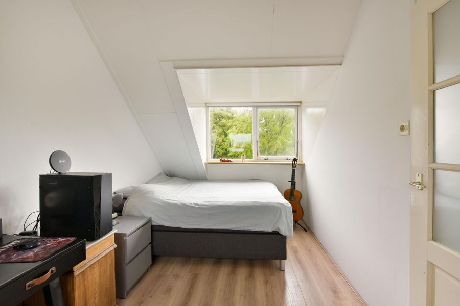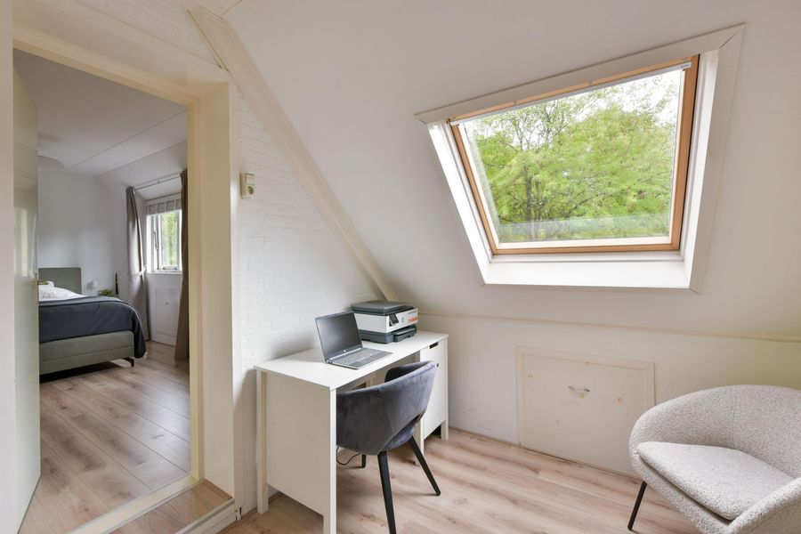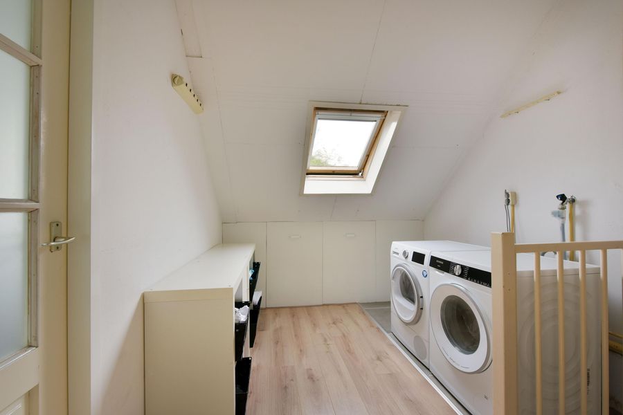 Op zolder is een ruime vierde slaapkamer gecreëerd met dakkapel. De overloop biedt plek aan de wasmachine, droger en hetelucht-cv-installatie. Net als op de eerste verdieping is ook hier een mooie doorlopende laminaatvloer aanwezig.