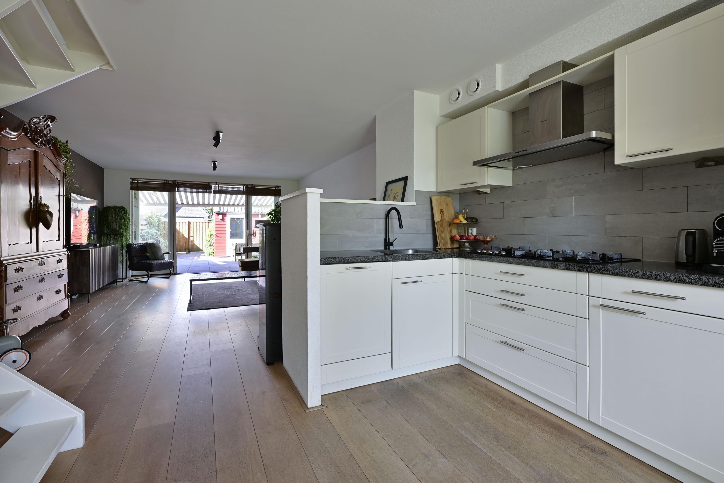 De keuken is praktisch en tijdloos uitgevoerd. De witte fronten in combinatie met het chique zwarte aanrechtblad zorgen voor een moderne uitstraling. Je beschikt hier over een koelkast, vriezer en een 5-pits gasfornuis – ideaal voor dagelijks gemak én voor de thuiskok. De keuken is compact maar slim ingedeeld en past perfect bij de rest van het interieur.
