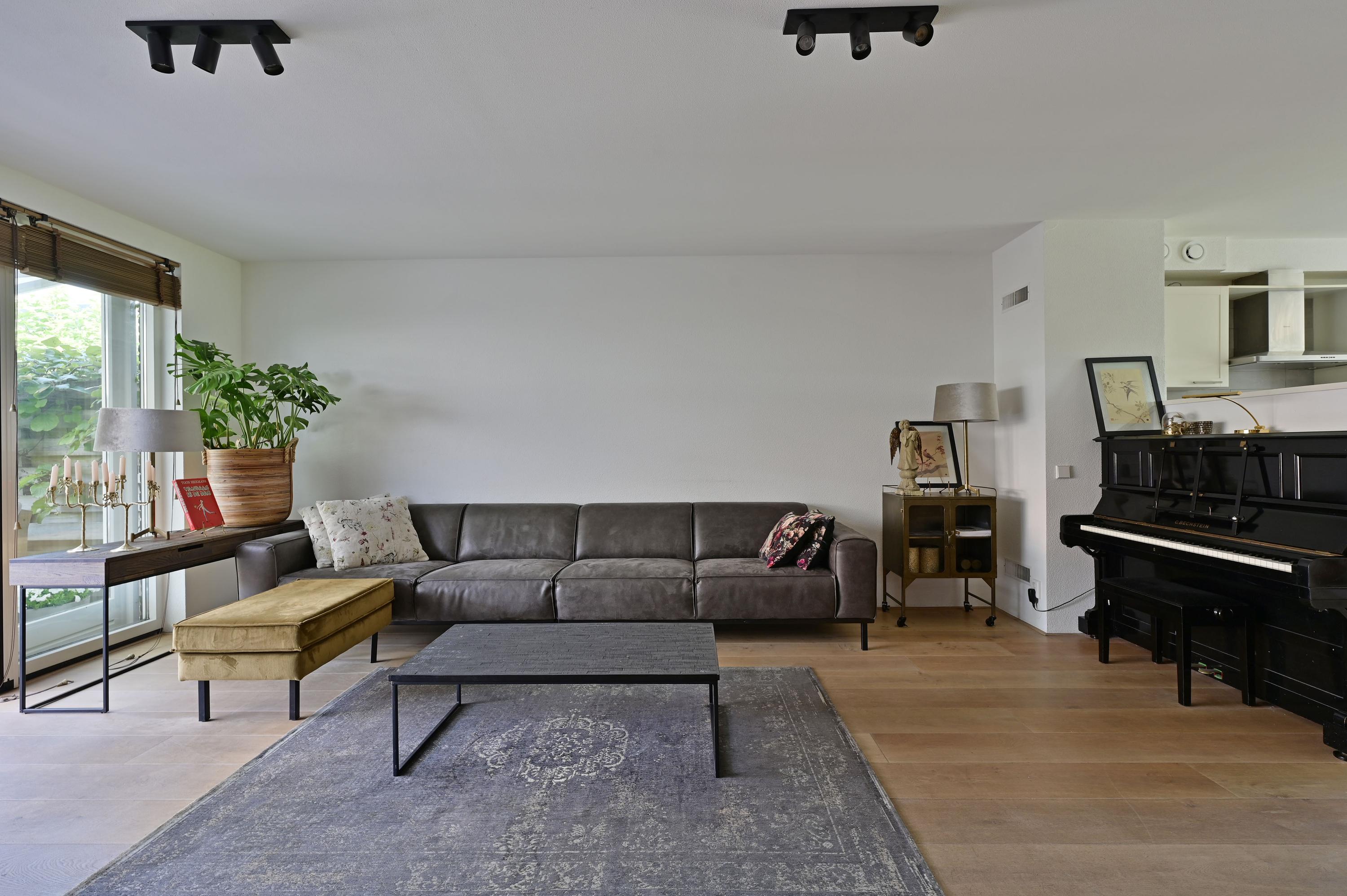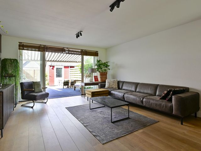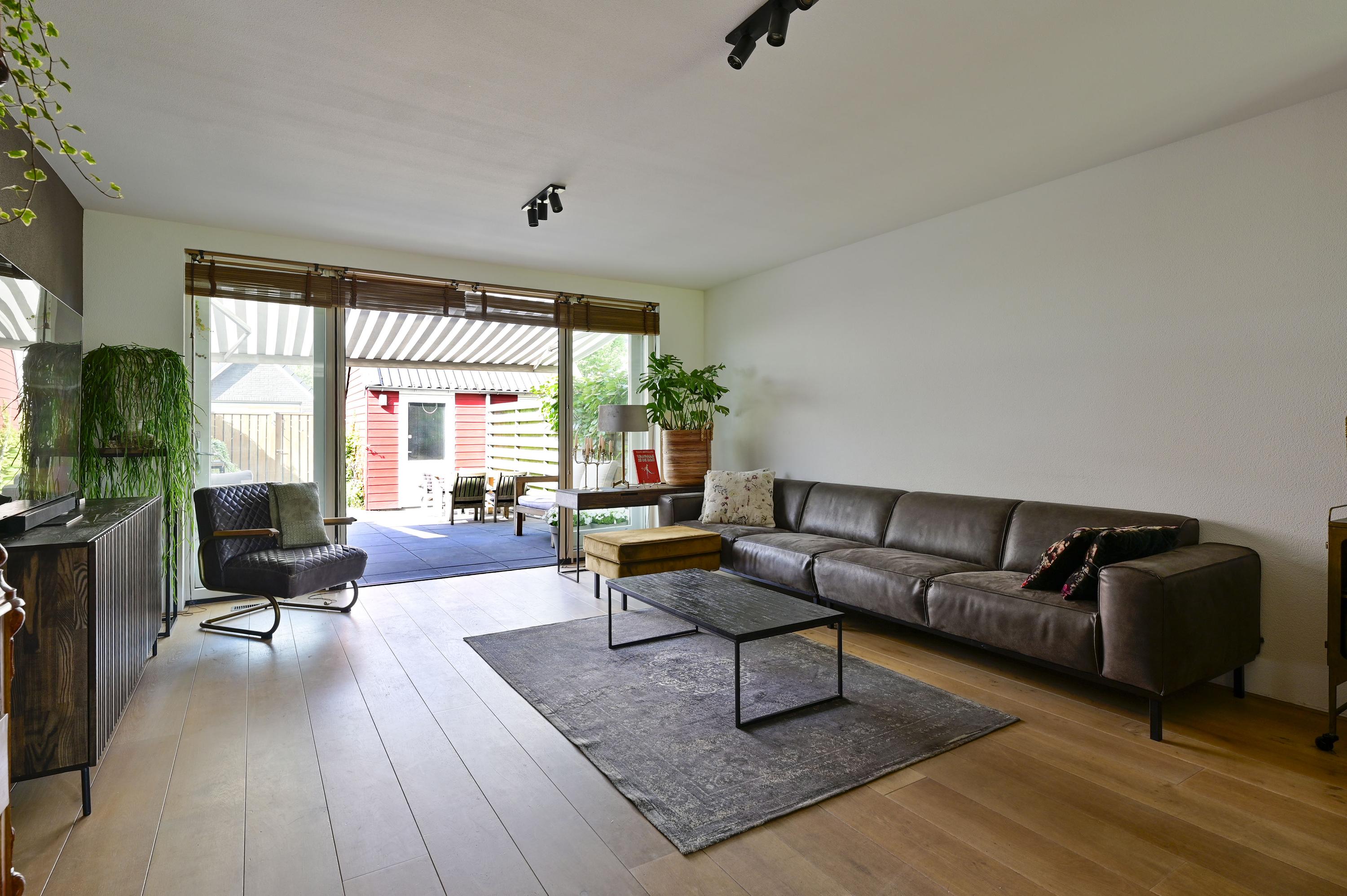 - Sfeervolle woonkamer met openslaande deuren en houten vloer;