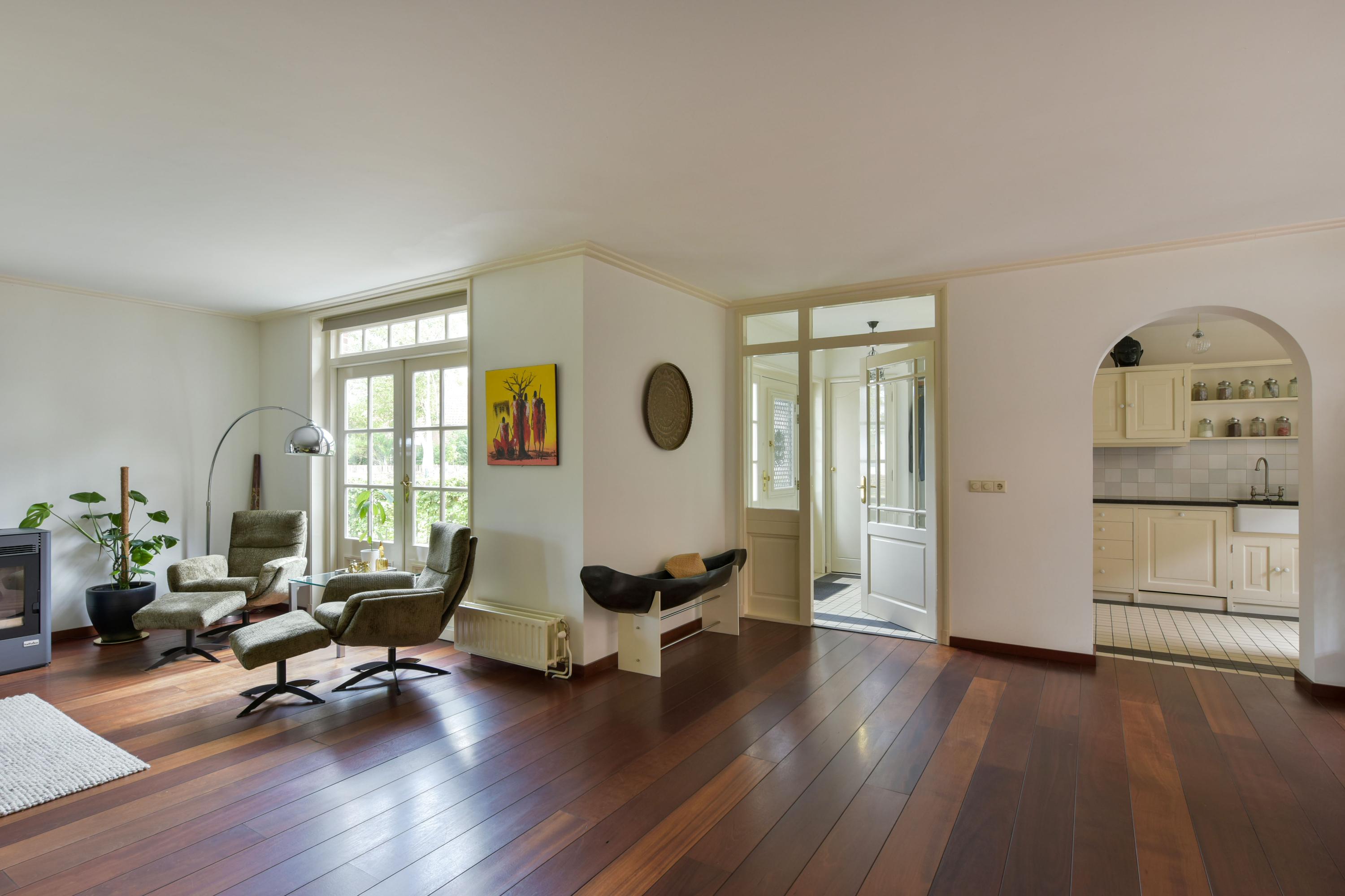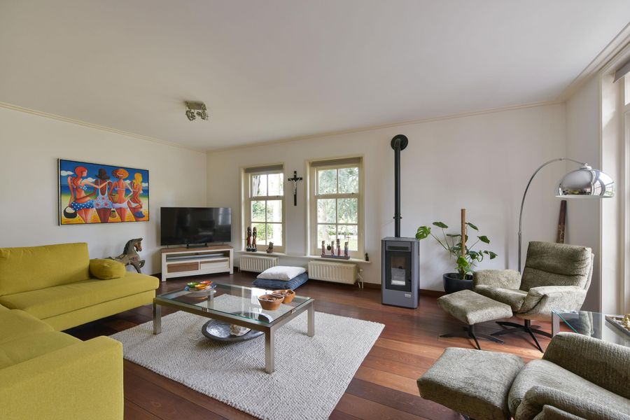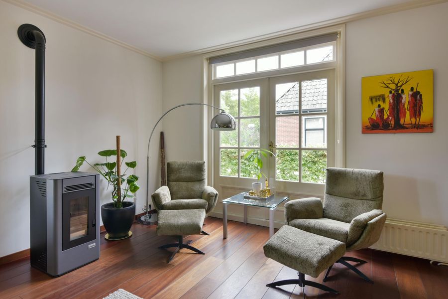- Gezellige woonkamer met pelletkachel en Jatoba houten vloer;