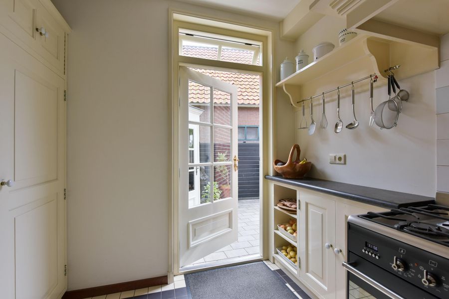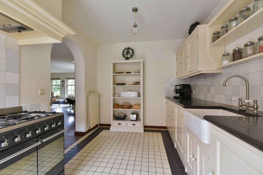 De keuken is er eentje om verliefd op te worden. Met een landelijke uitstraling, een natuurstenen werkblad, een grote vierkante spoelbak en een prachtig losstaand 6-pits fornuis met brede oven. Het geheel maakt het een fijne plek om te koken. Via de tuindeur loop je zó de zonnige tuin in, heerlijk!