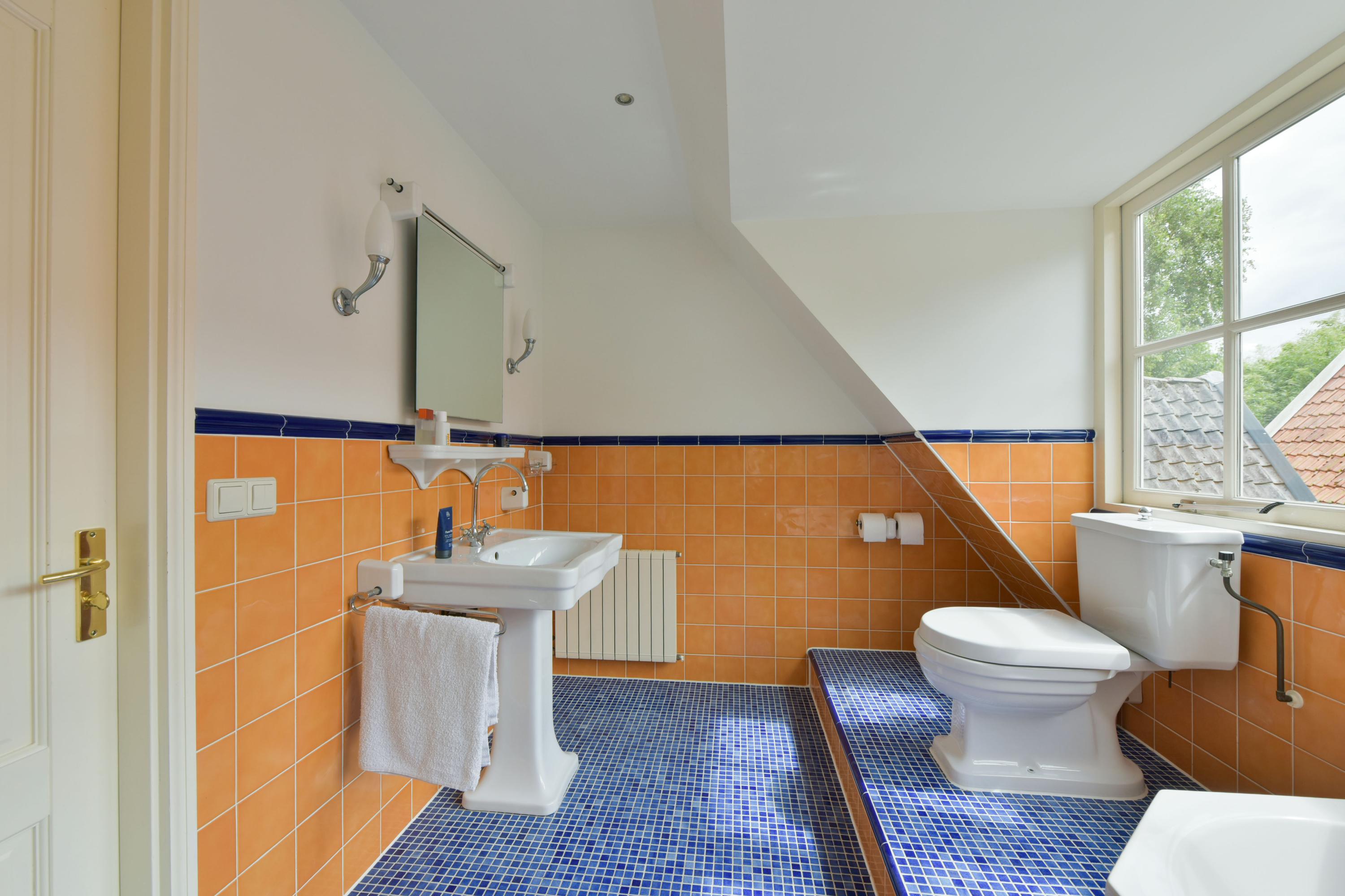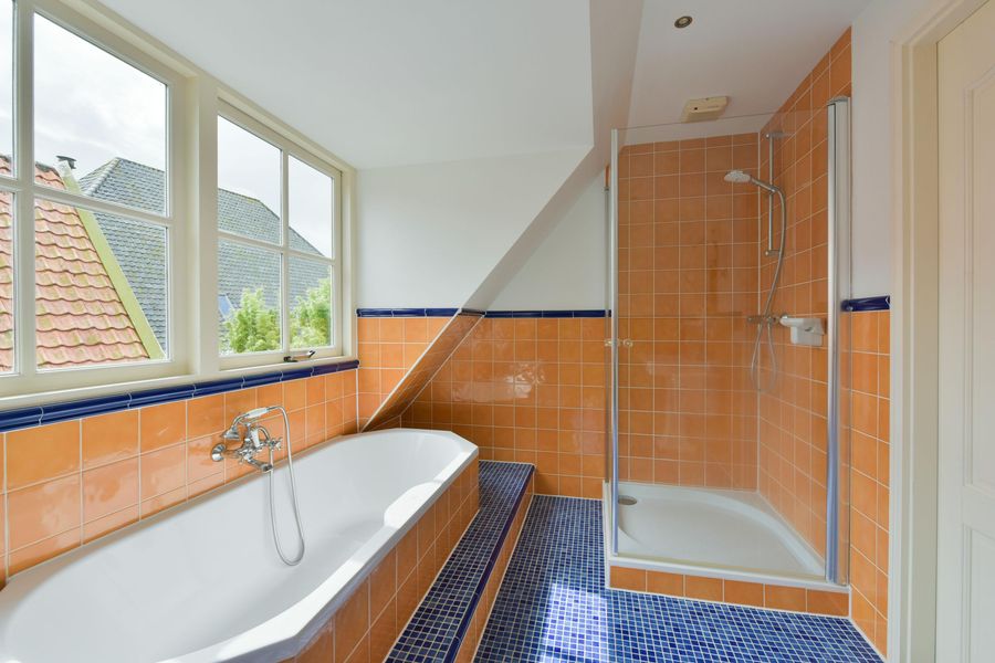 - Grote badkamer met ligbad op verhoging, douche, toilet en wastafel;