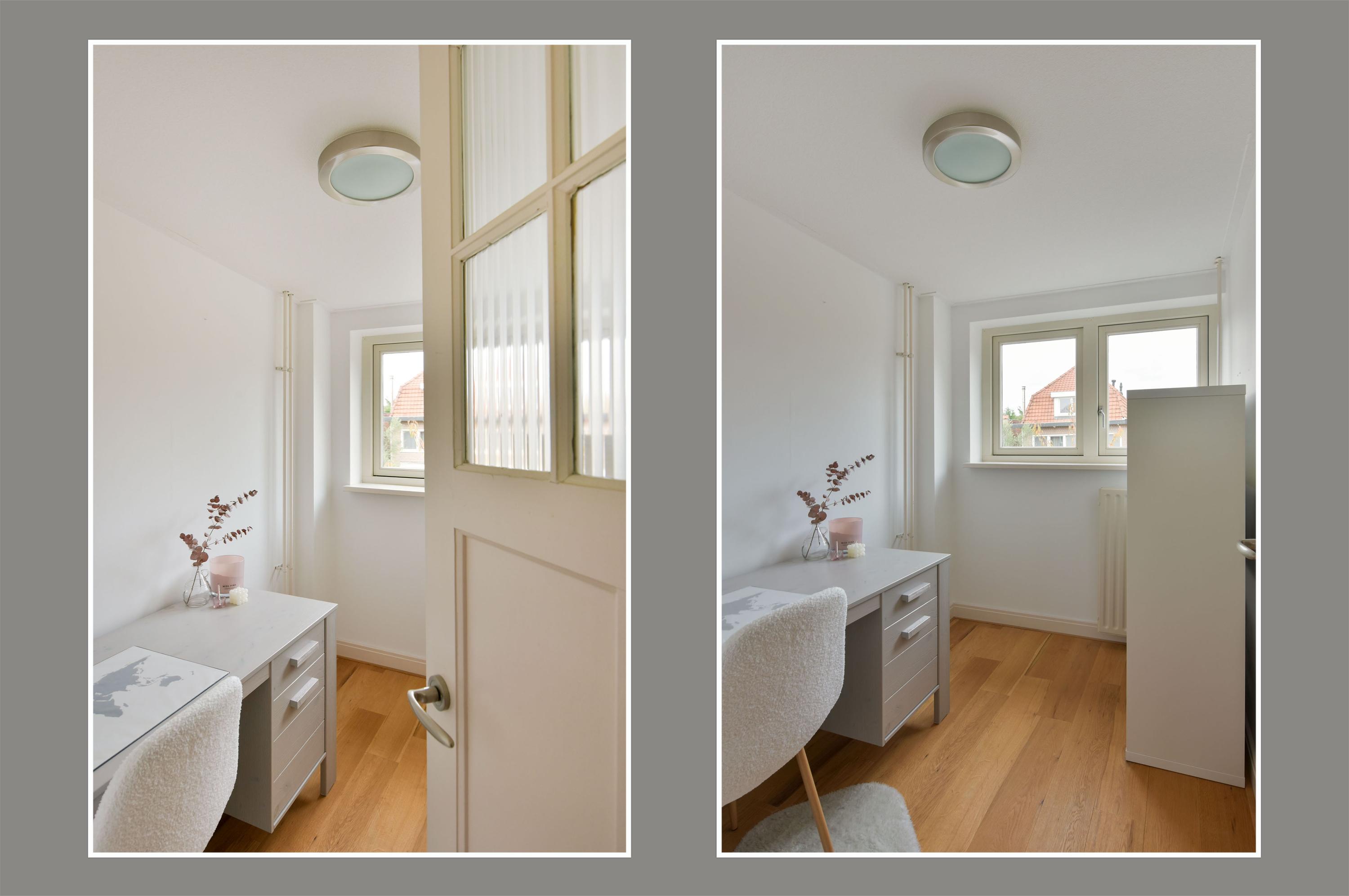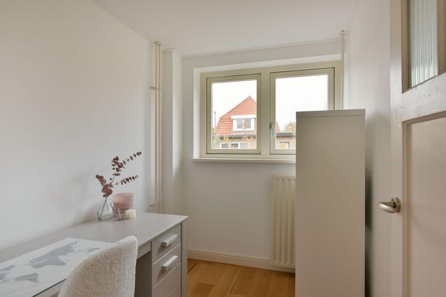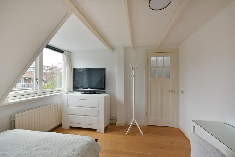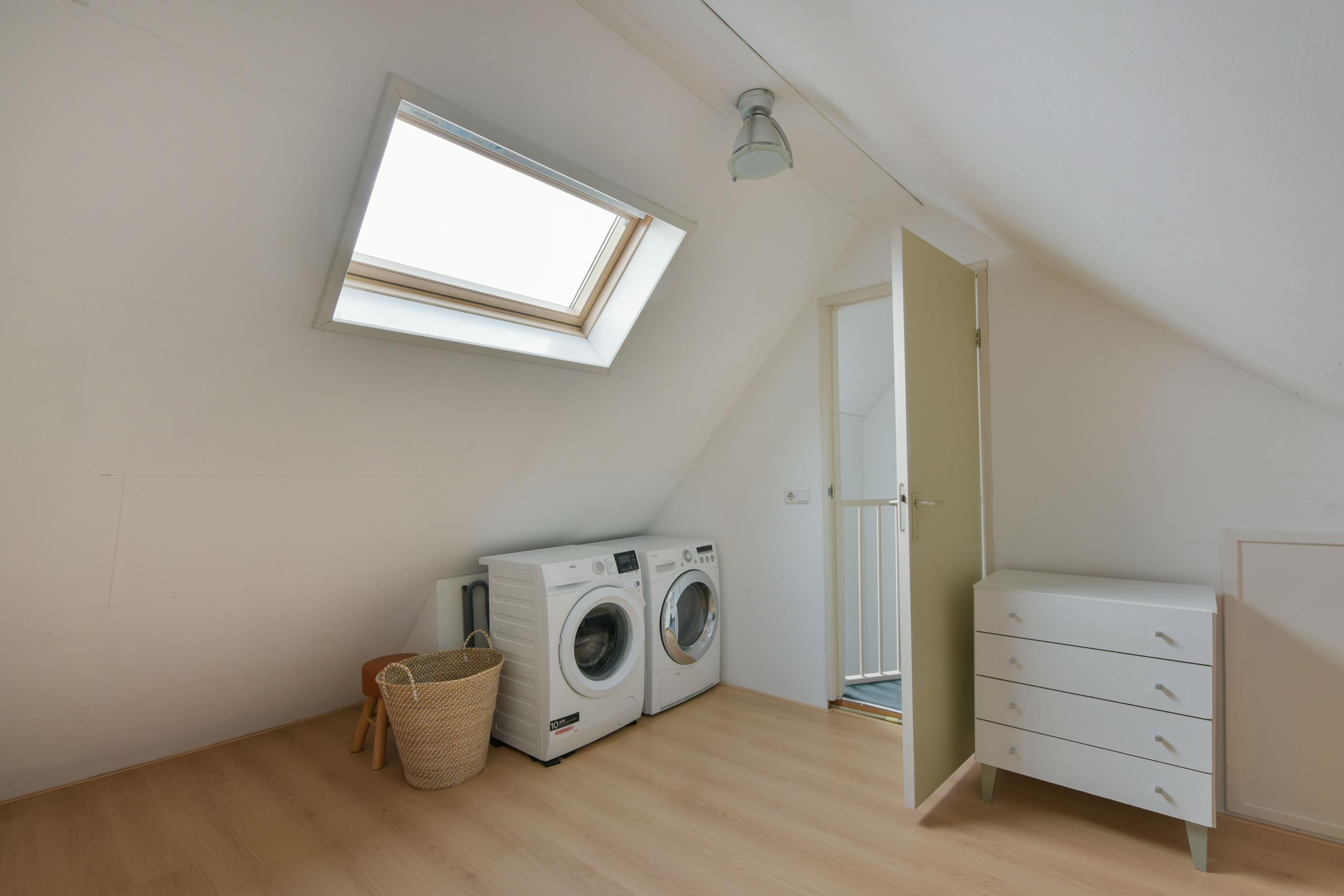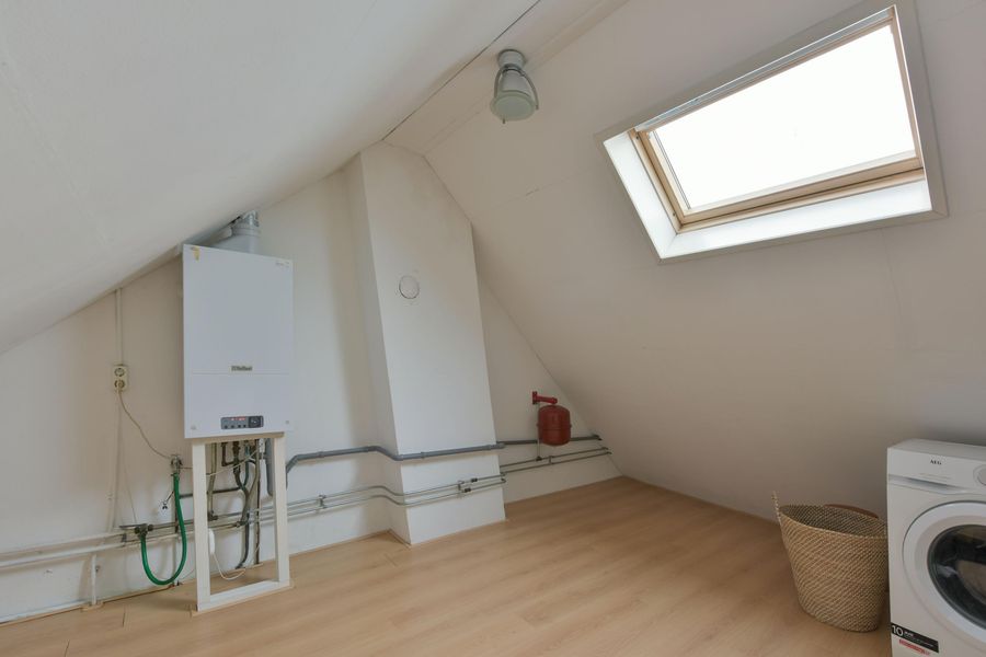 Op de eerste verdieping bevinden zich drie fijne slaapkamers waarvan de master bedroom met balkon en inbouwkast. Verder een luxe badkamer met inloopdouche - speels en ruimtelijk door de enorme hoogte -, een wandcloset en een wastafelmeubel. De vaste trap leidt naar de tweede verdieping, waar je nog een praktische ruimte vindt evenals de aansluiting voor je wasmachine en droger. Deze ruimte is prima te gebruiken voor een 4e slaap- of werkkamer, eventueel te vergroten met een dakkapel.