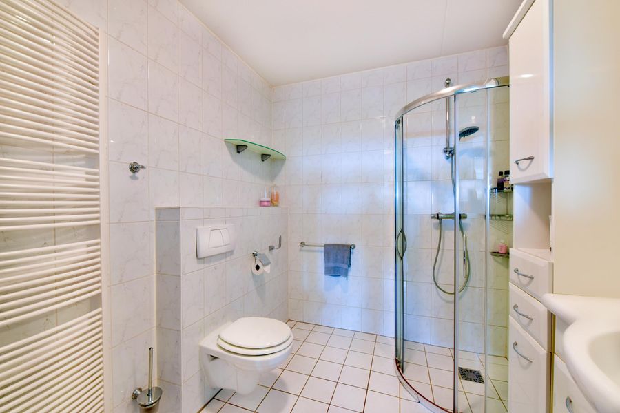 - Nette badkamer met douchecabine, wastafelmeubel en wandcloset;