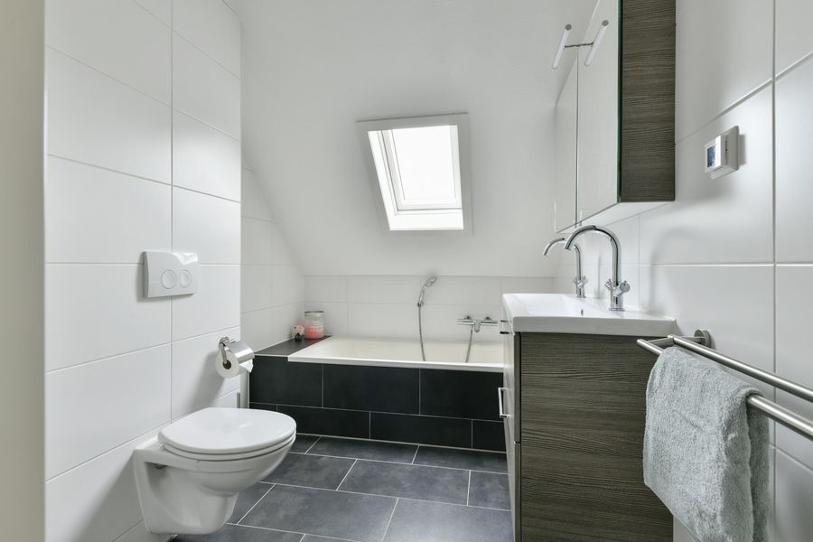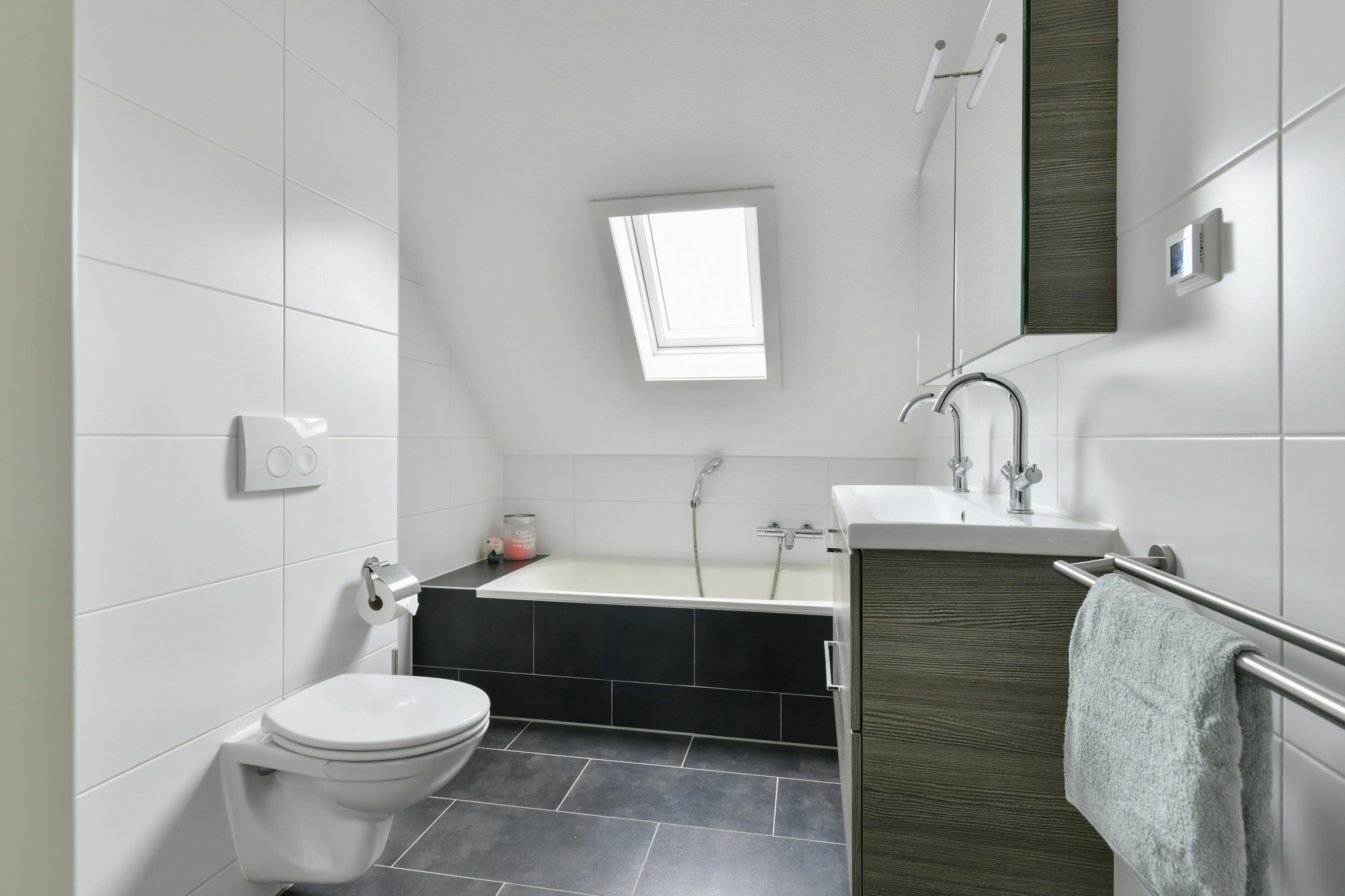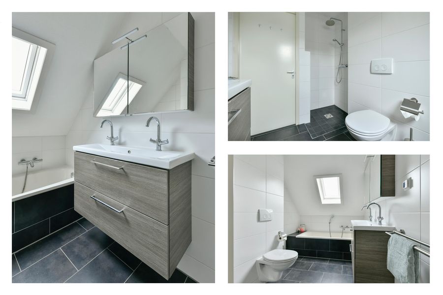 - Badkamer met ligbad, douche, dubbele wastafel, dakraam en elektrische vloerverwarming;
