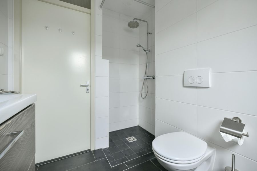 - Ligbad, toilet, dubbele wastafel, wastafelmeubel en inloopdouche