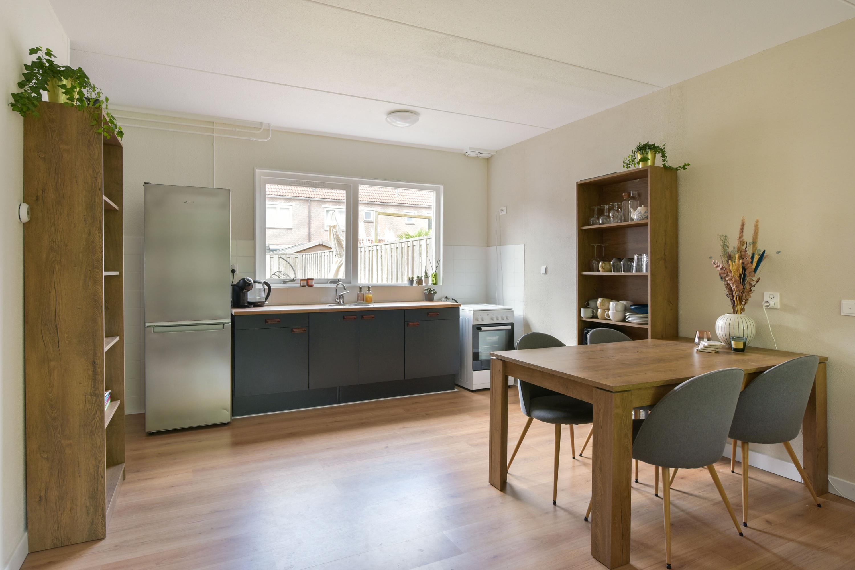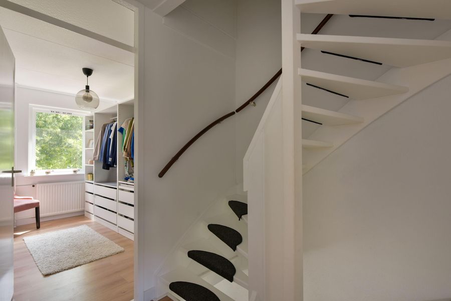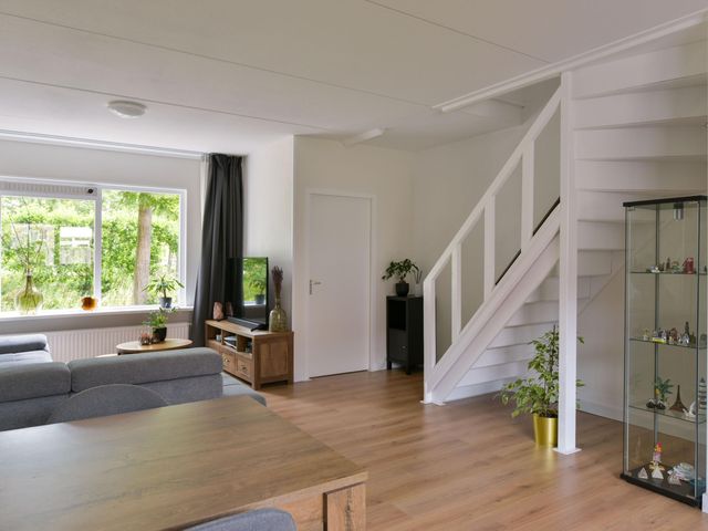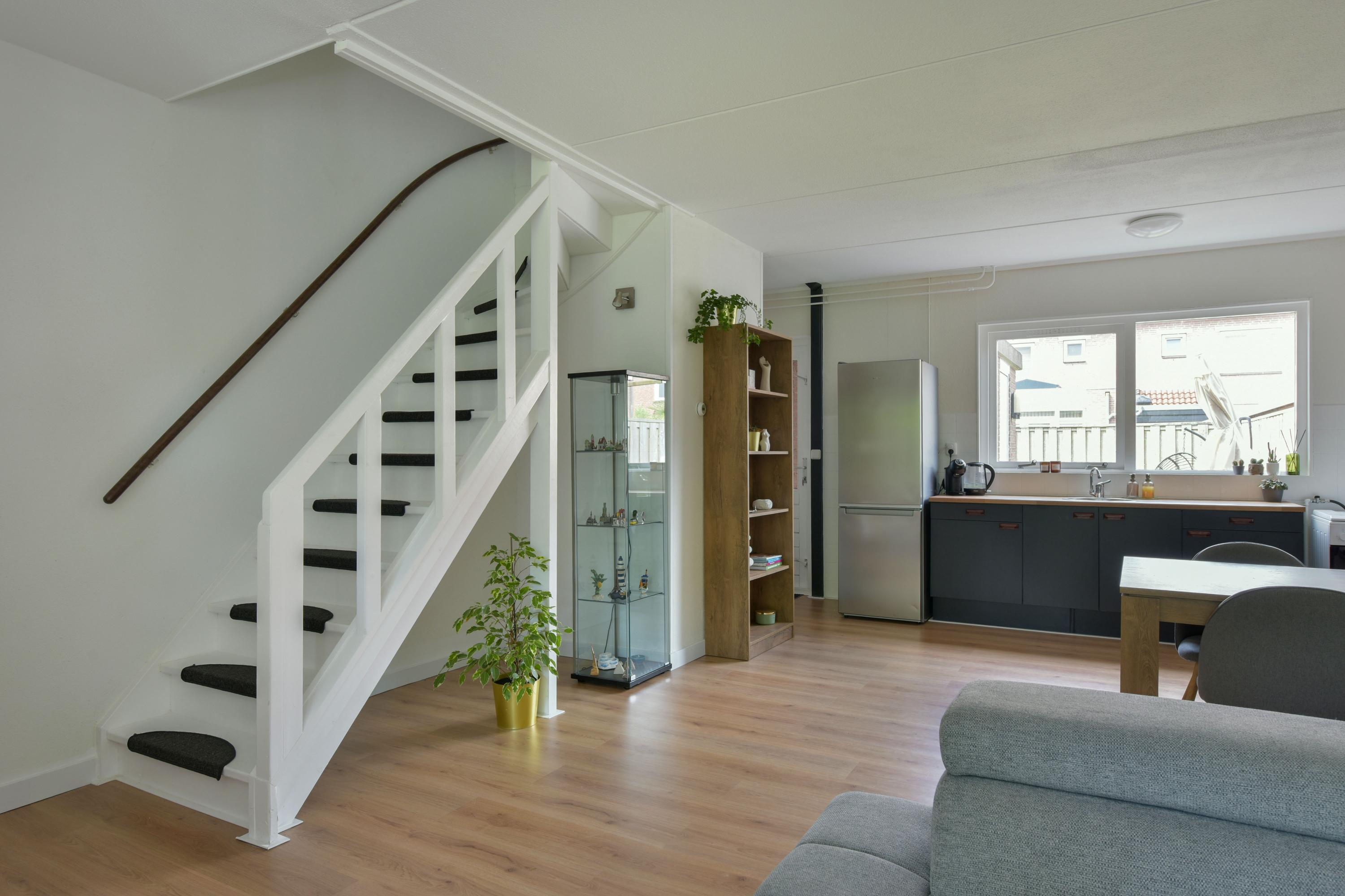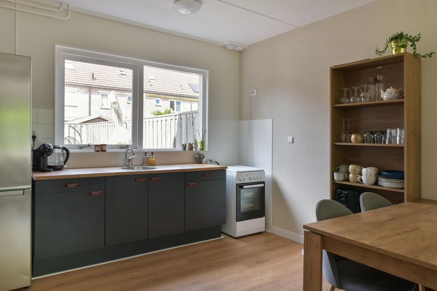 Binnen stap je in een lichte woonkamer met vrij uitzicht. Aan de achterzijde vind je een zwarte keuken met uitzicht over de tuin. Een zonnige achtertuin en dus een heerlijke plek voor een ontspannen momenten in de zon, knusse borrelavonden of een goed boek in alle rust. De stenen berging is perfect voor fietsen, gereedschap of hobbyspullen.