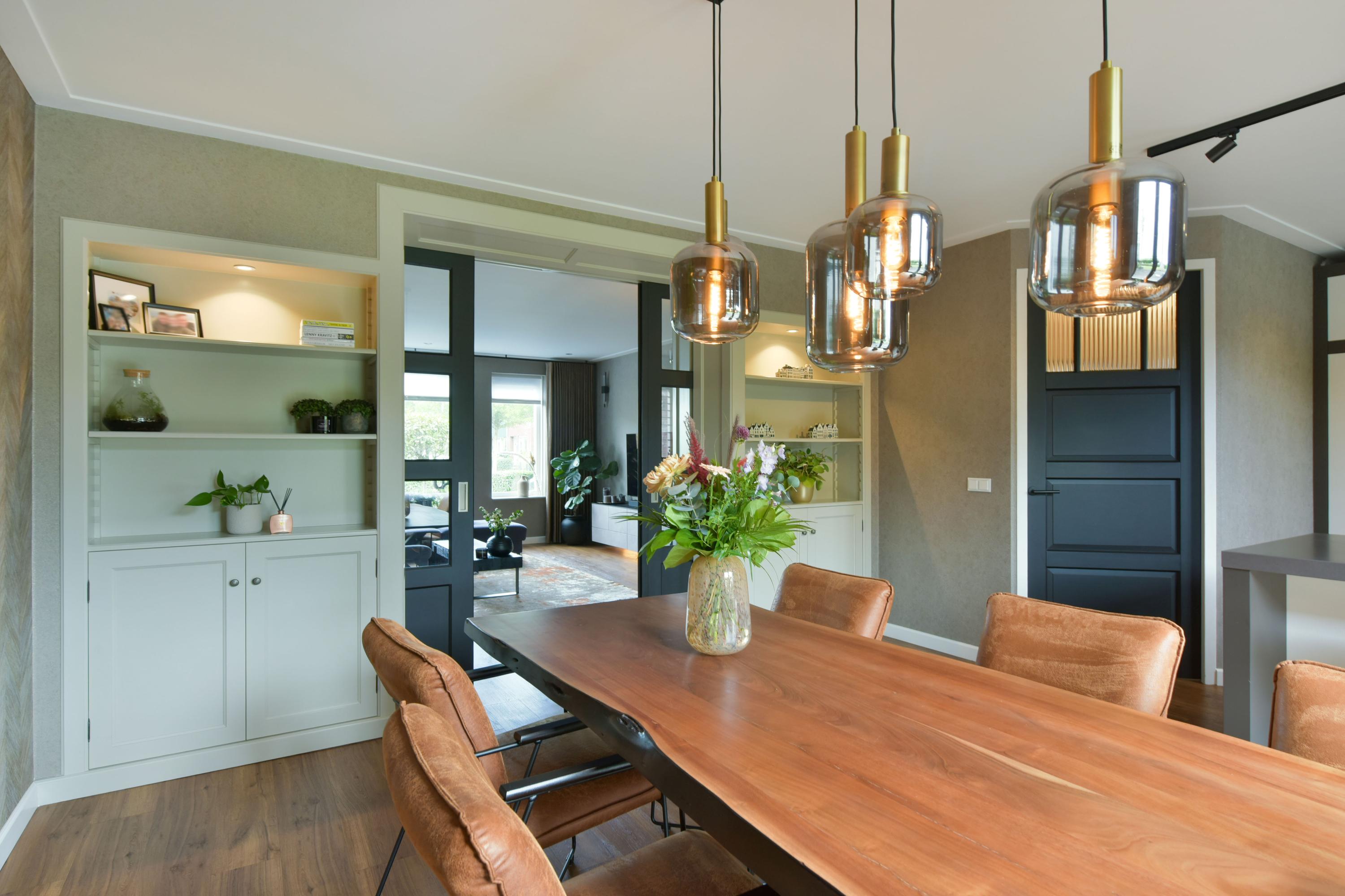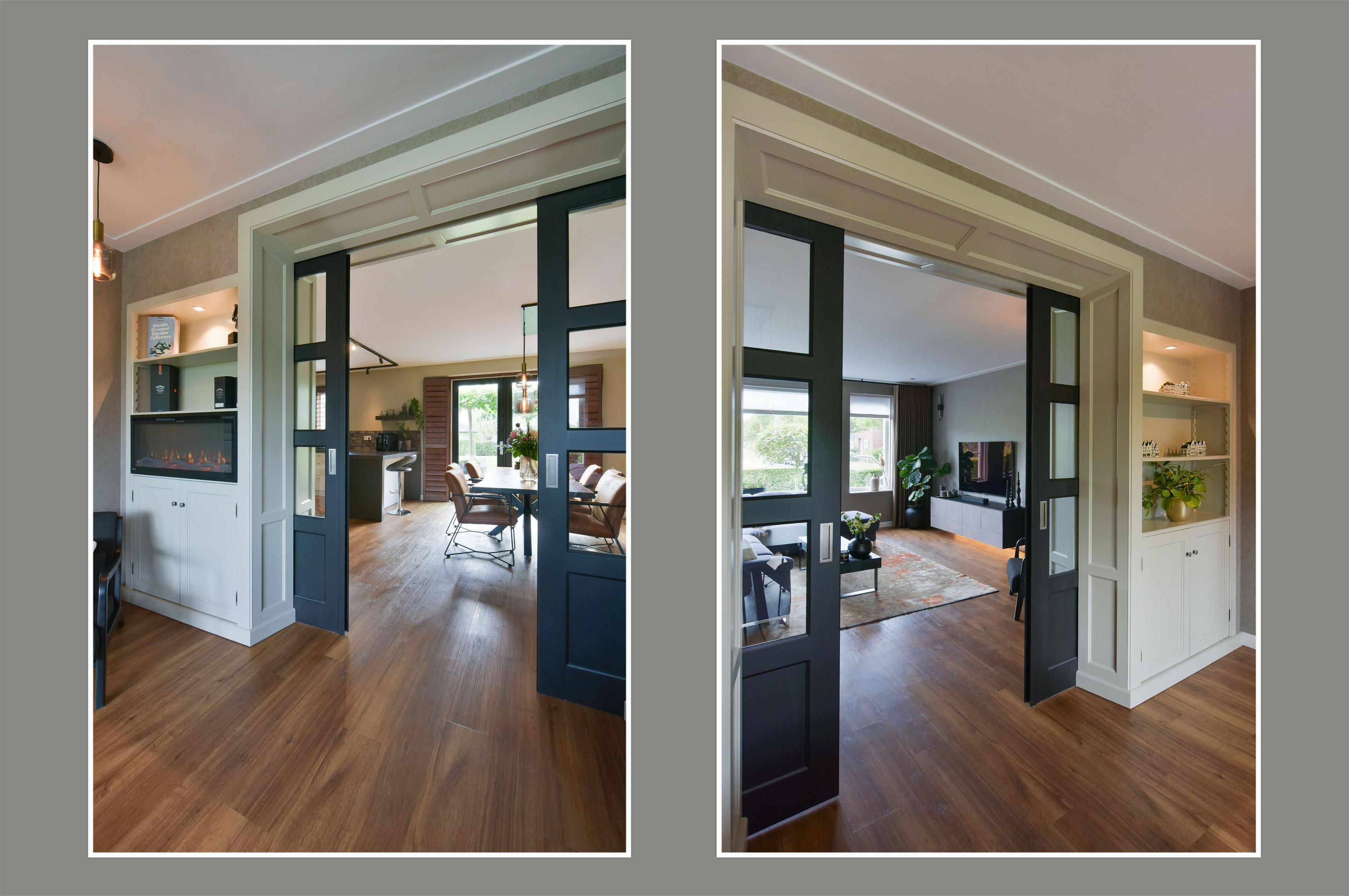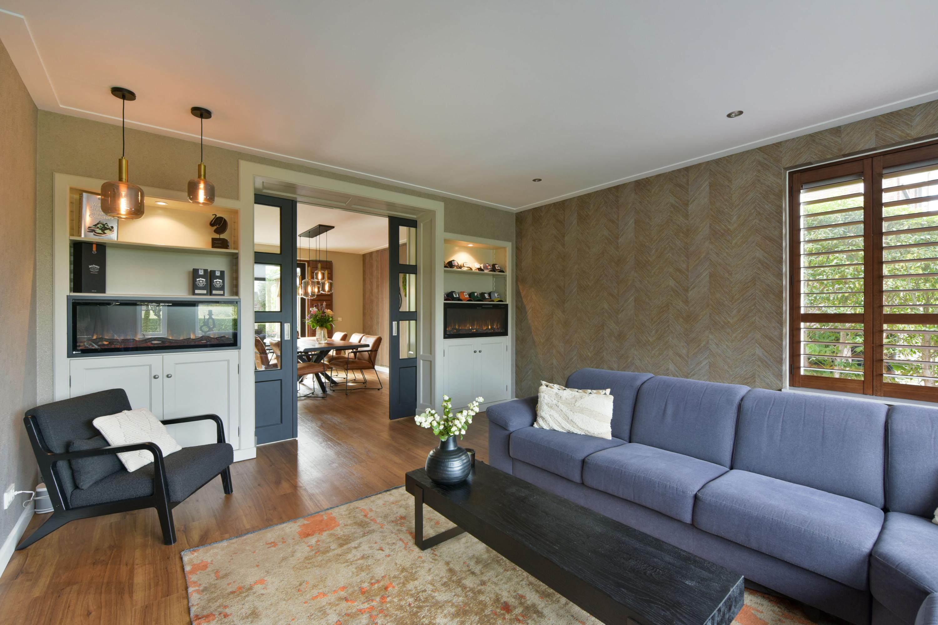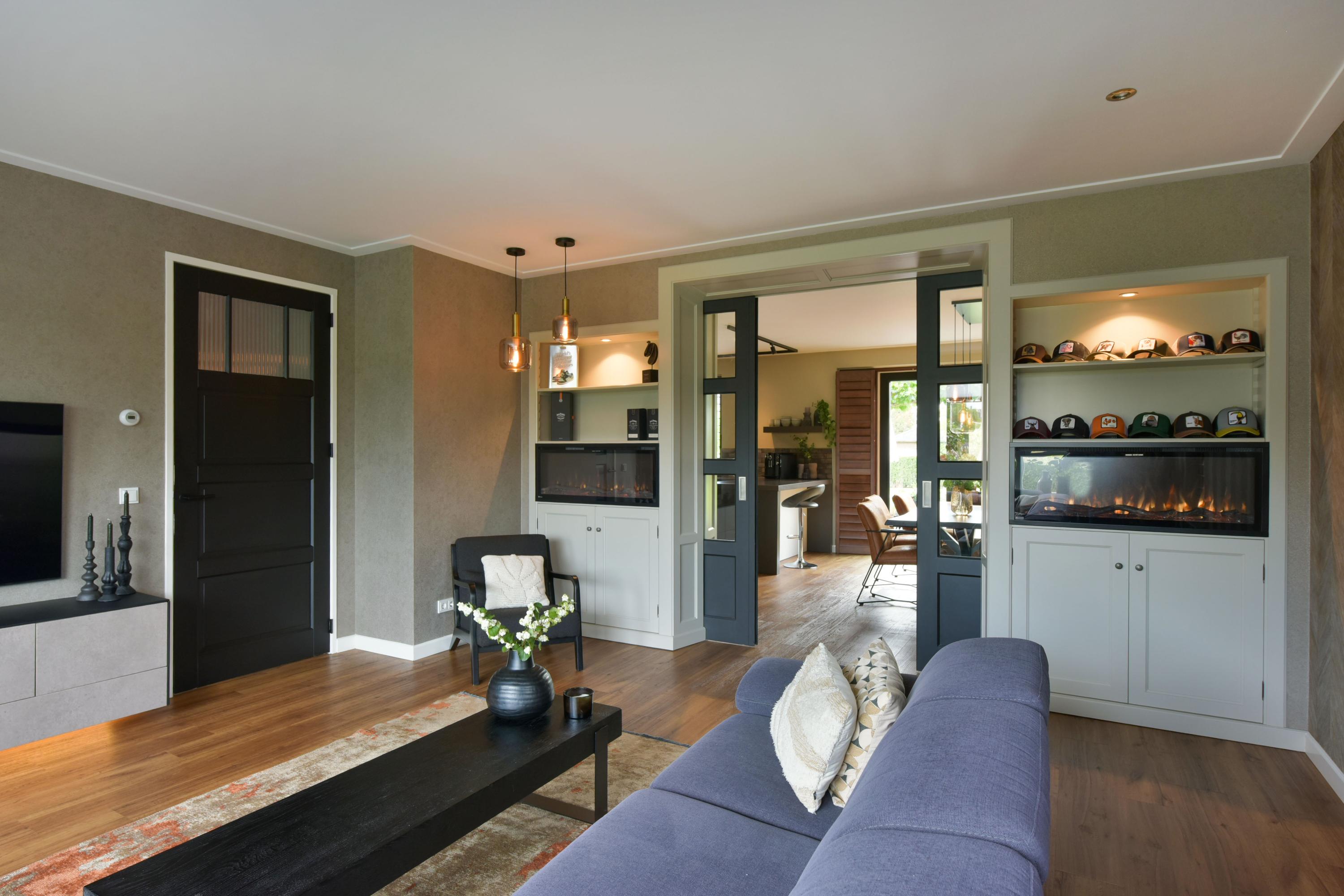 - Zeer ruime woonkamer met vloerverwarming, elektrische haarden en maatwerk ensuite-deuren;