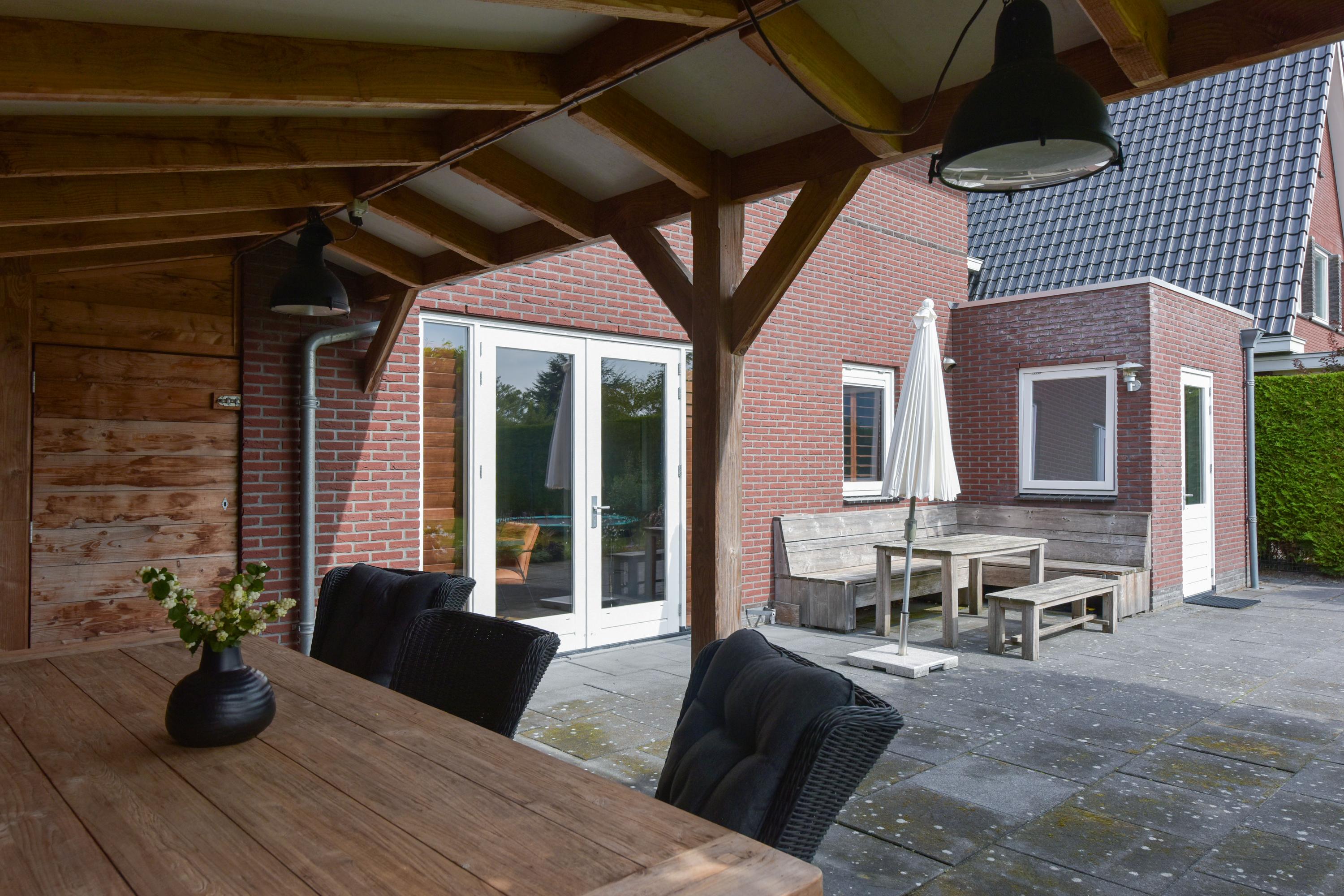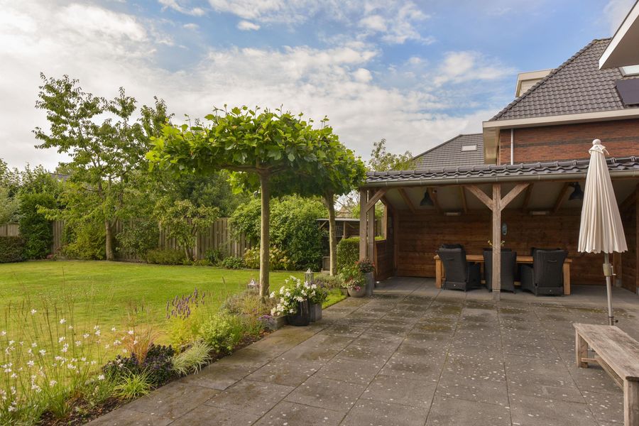 - Veranda van 21 m², groot gazon, borders, bomen en fijne terrassen;