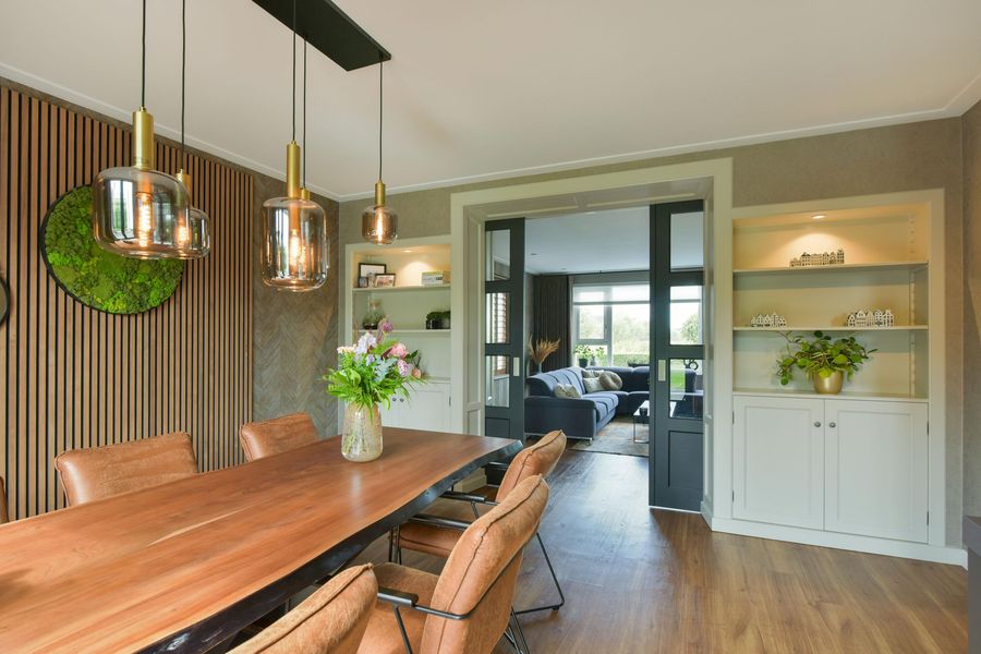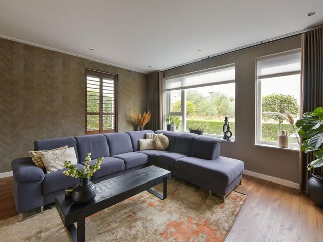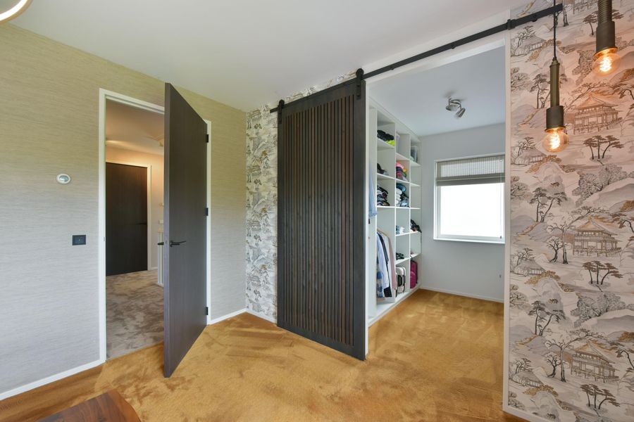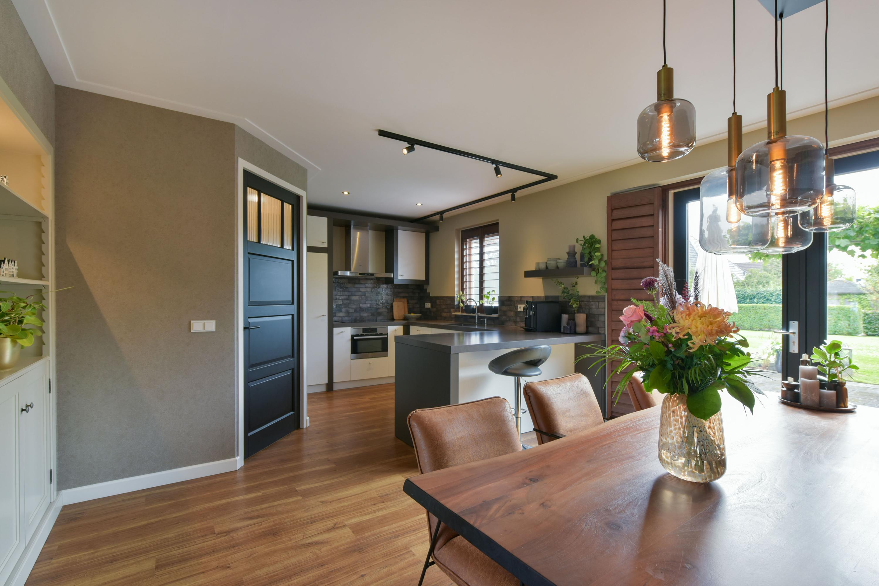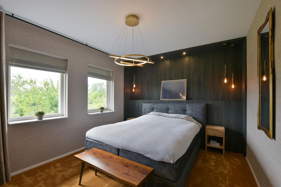 De woning is van binnen strak afgewerkt en straalt een warme sfeer uit. Denk aan prachtig behang, strak gestucte wanden en plafonds met dimbare inbouwspots, vloerverwarming, stijlvolle kleurencombinaties en op maat gemaakte kasten rondom de ensuite-deuren in de woonkamer en woonkeuken.