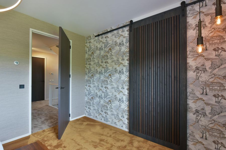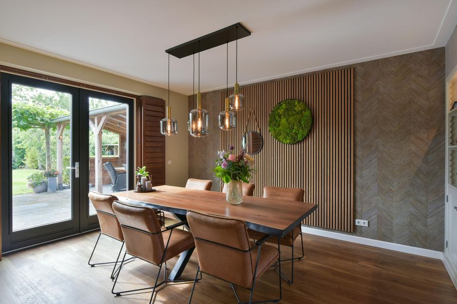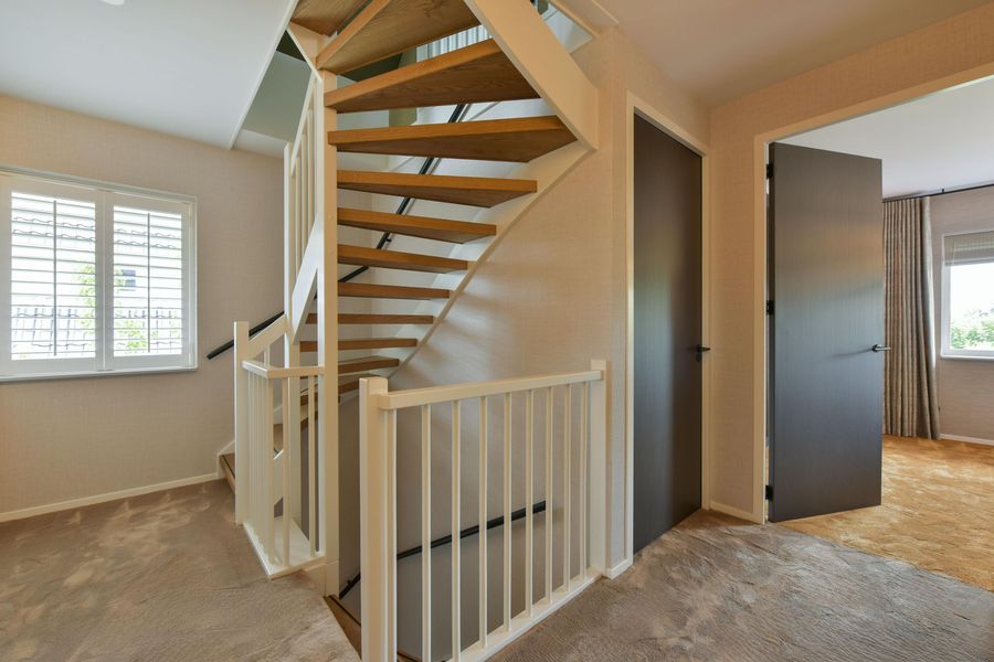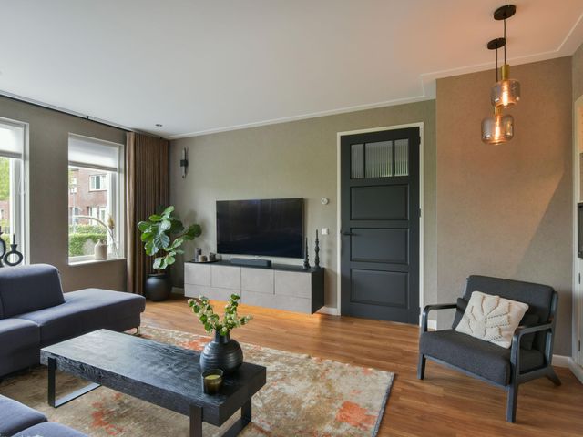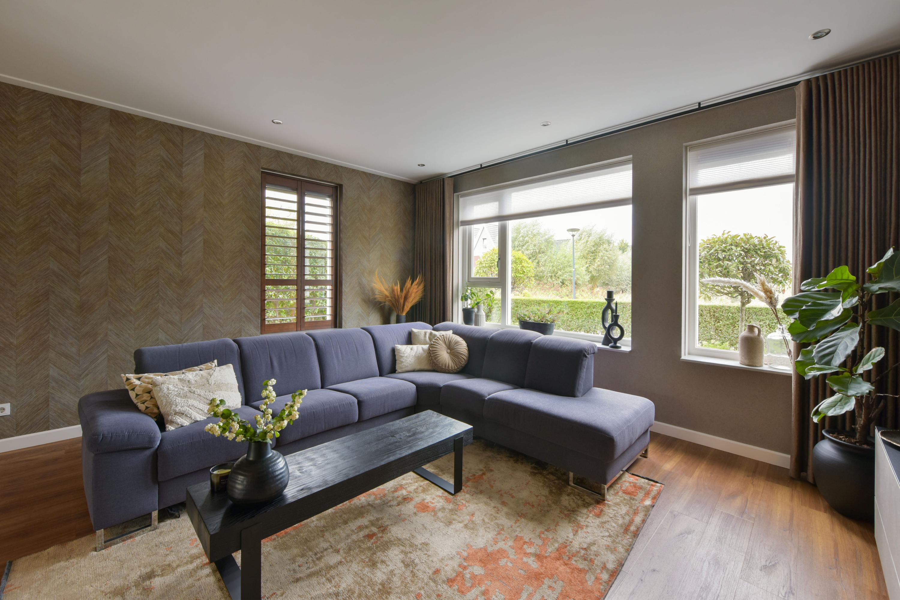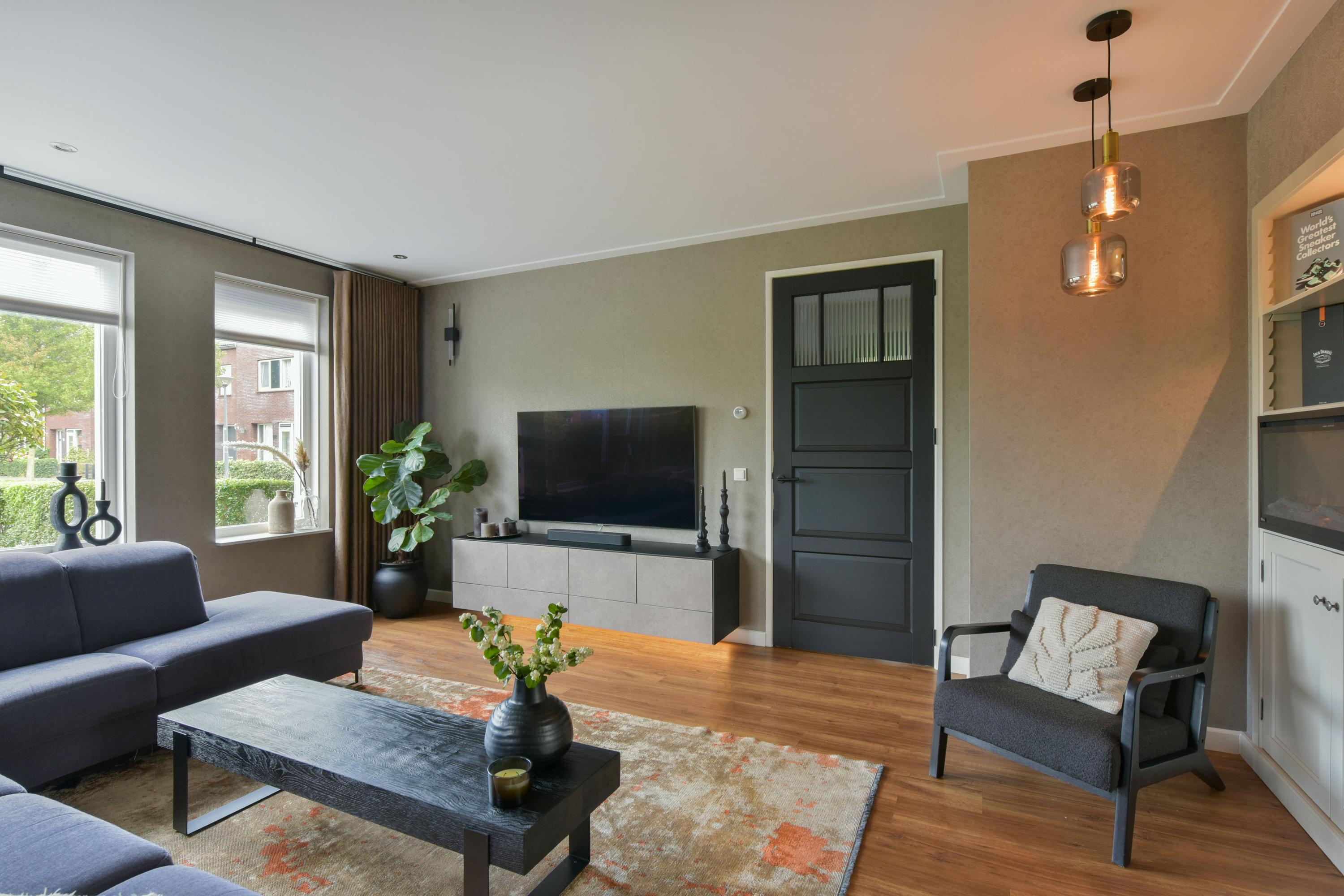 De woning is van binnen strak afgewerkt en straalt een warme sfeer uit. Denk aan prachtig behang, strak gestucte wanden en plafonds met dimbare inbouwspots, vloerverwarming, stijlvolle kleurencombinaties en op maat gemaakte kasten rondom de ensuite-deuren in de woonkamer en woonkeuken.