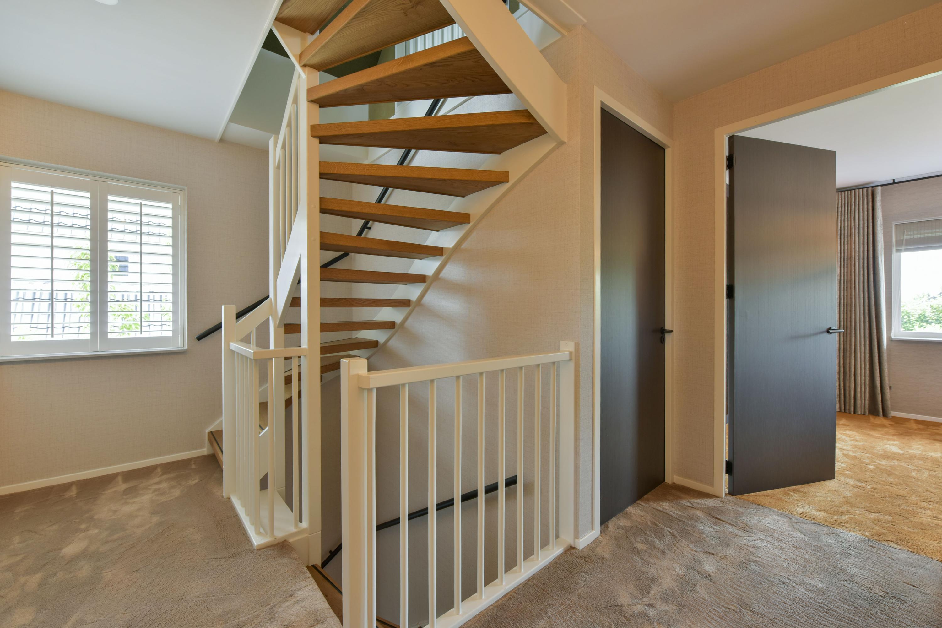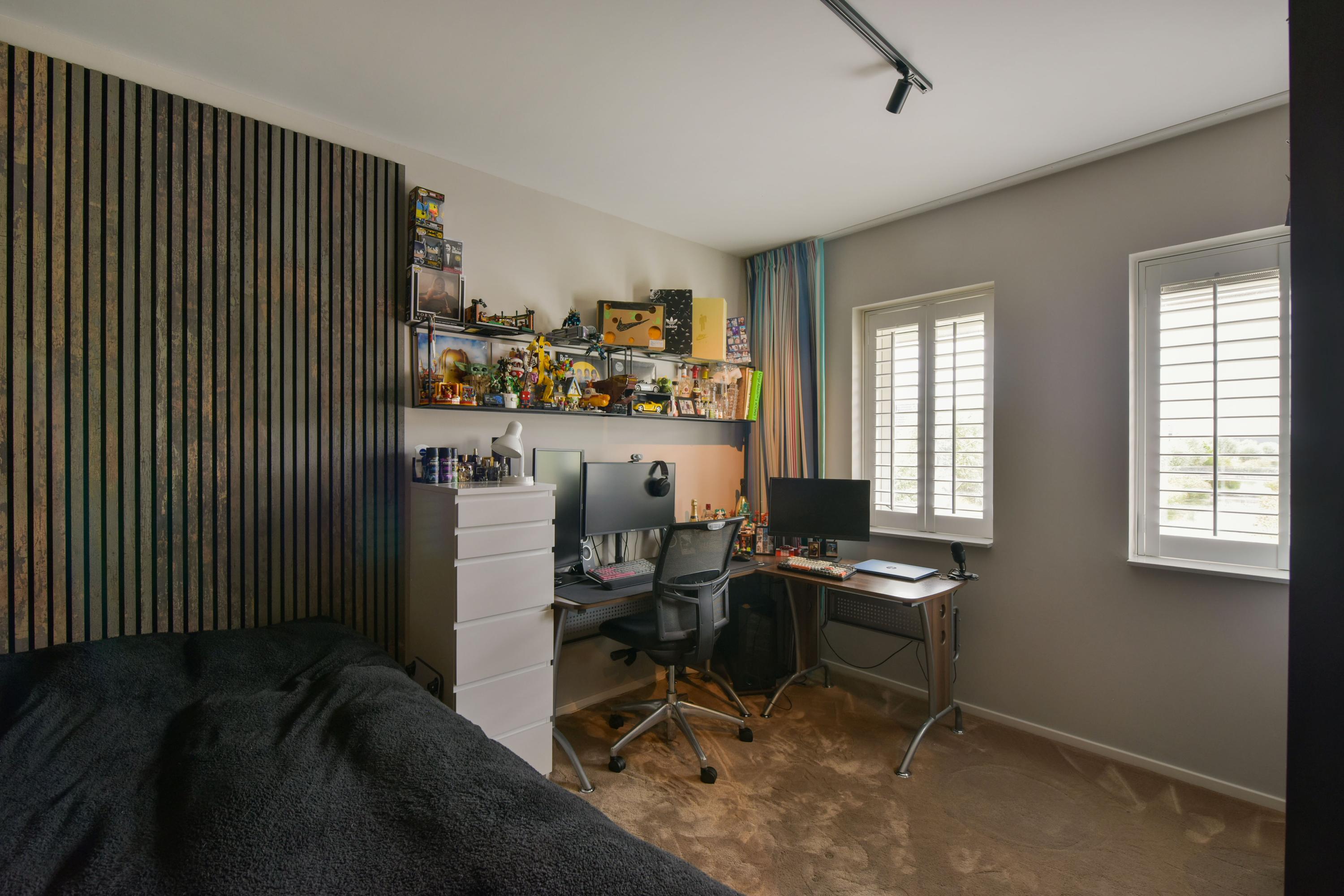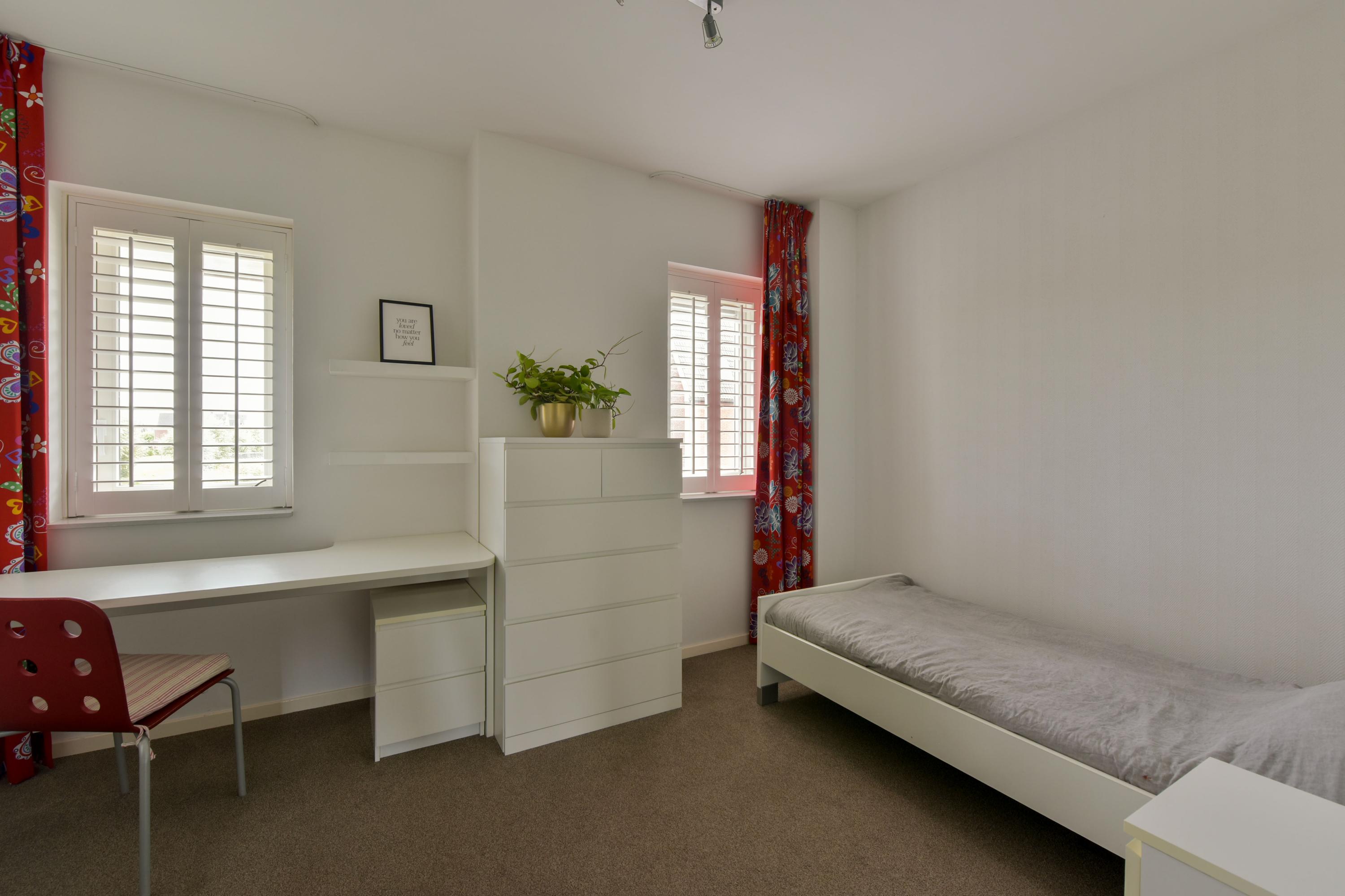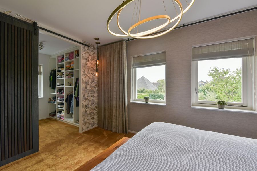 Op de eerste etage tref je 3 ruime slaapkamers, waarvan een aantal met shutters, vaste kasten en een warme, luxe vloerbedekking. De master bedroom is voorzien van een schuifwand naar de inloopkast: stijlvol en praktisch tegelijk. De 4e kamer is perfect als een wat kleinere kinderkamer of een fijn kantoor. De badkamer is groot, strak, met dubbele wastafel (meubel), inloopdouche, wandcloset en slimme opbergplanken.