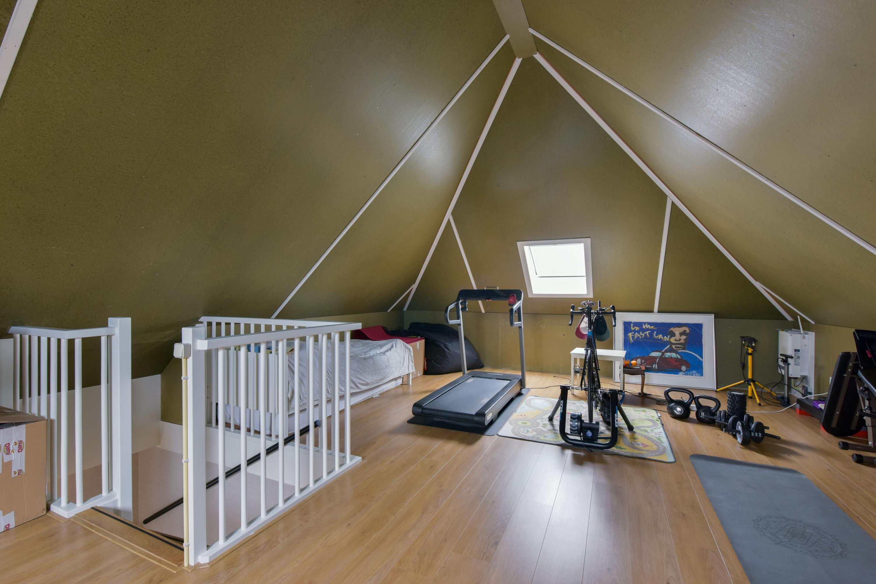 De zolder is verrassend ruim en biedt volop mogelijkheden – momenteel ingericht als fitnessruimte, maar ook geschikt als extra slaapkamer, werkruimte en/of hobbykamer.