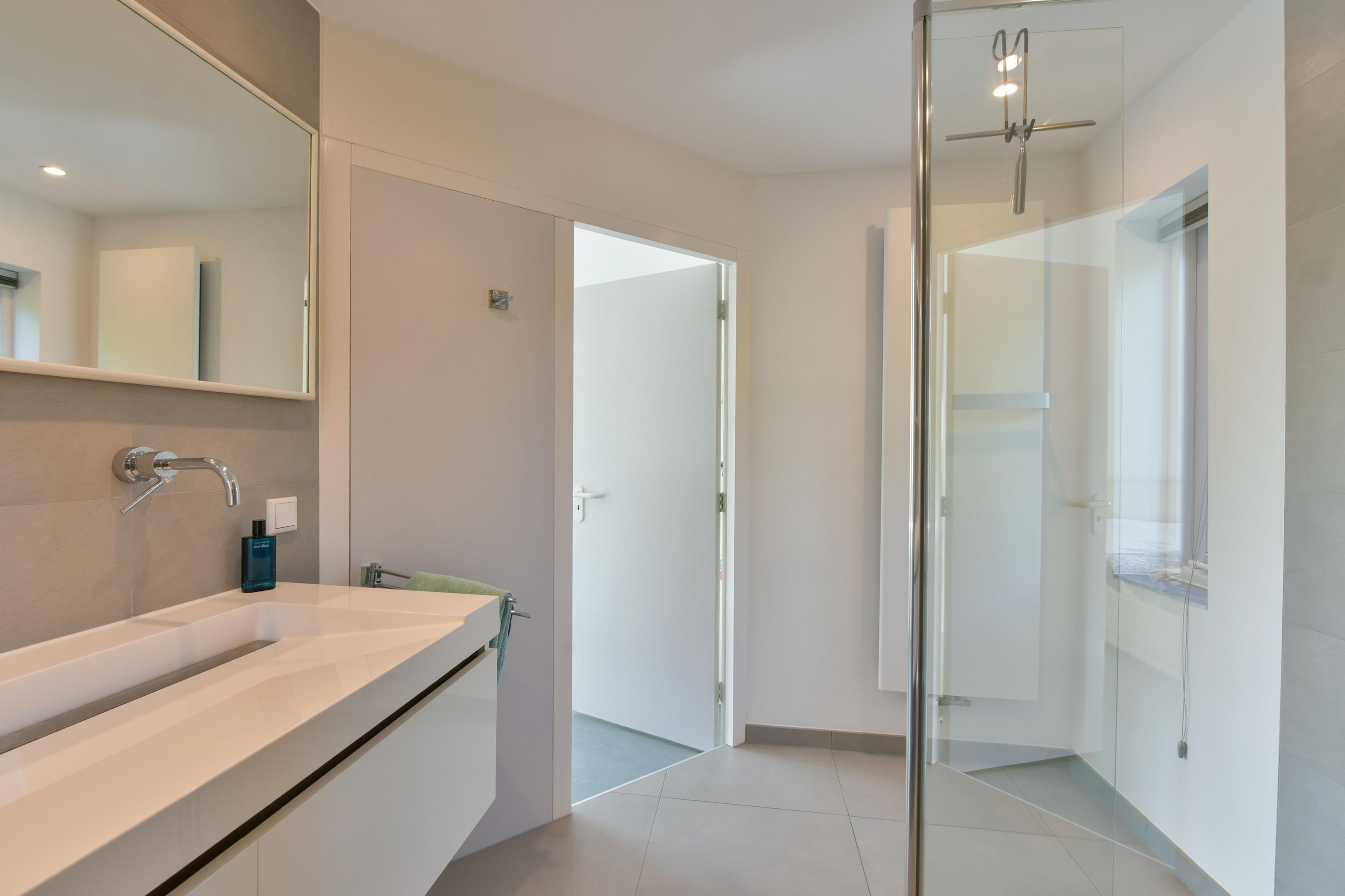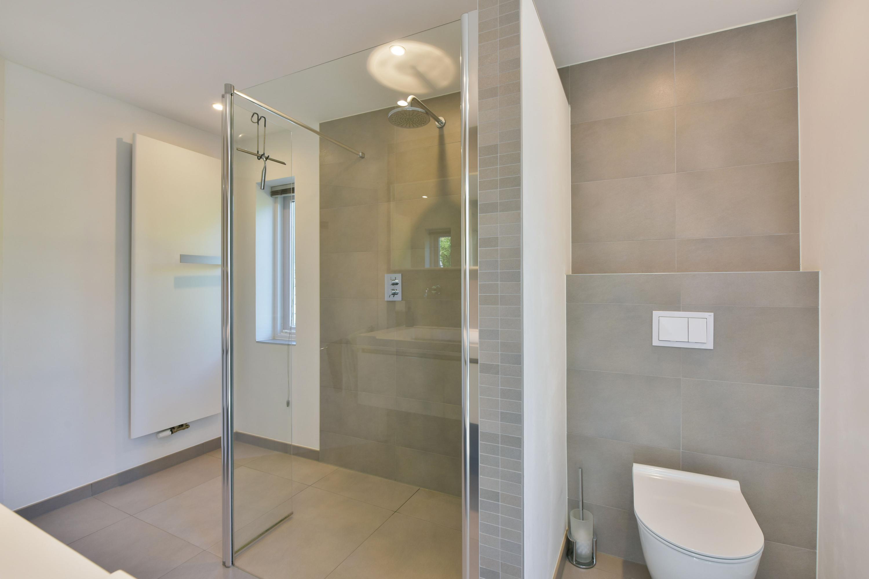 - Toilet, dubbele wastafel, wastafelmeubel, inloopdouche en vloerverwarming