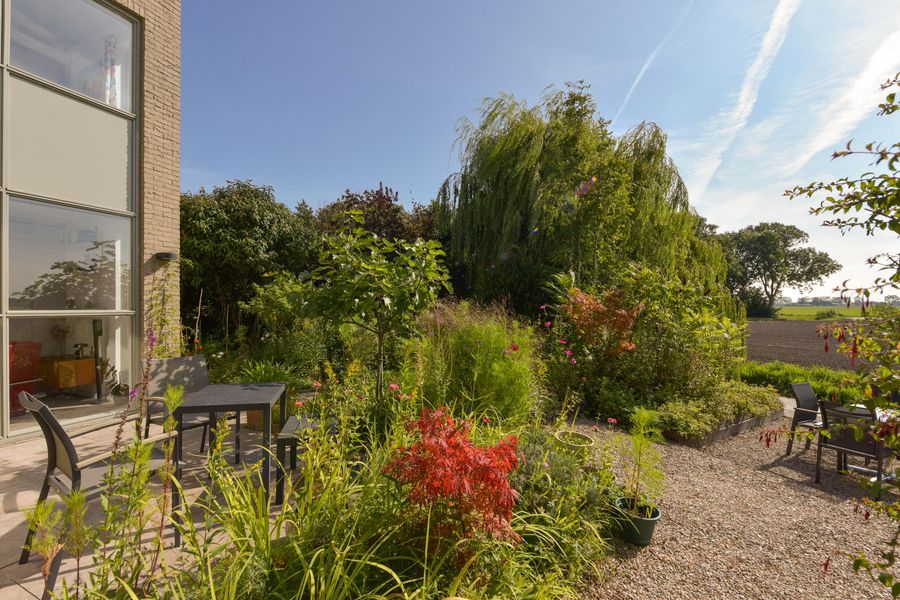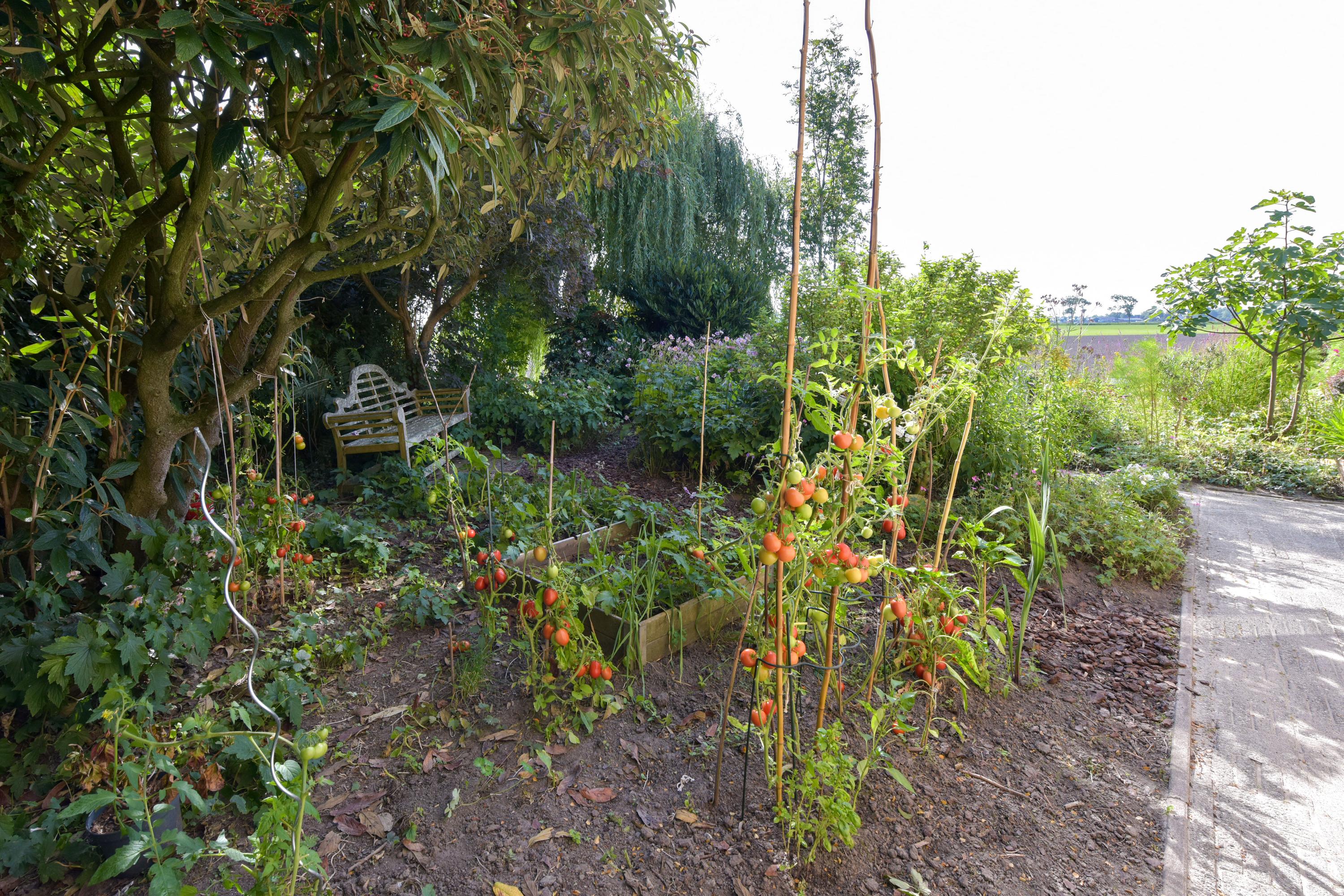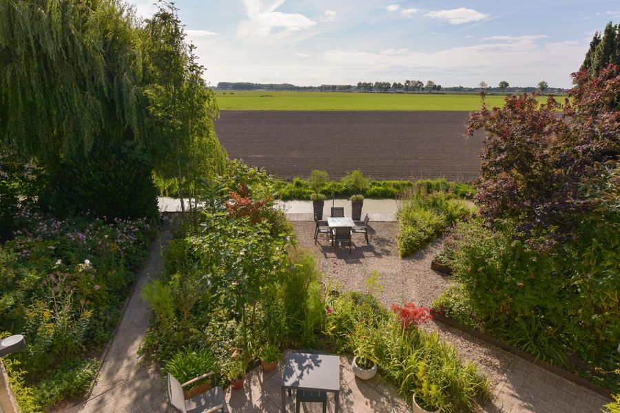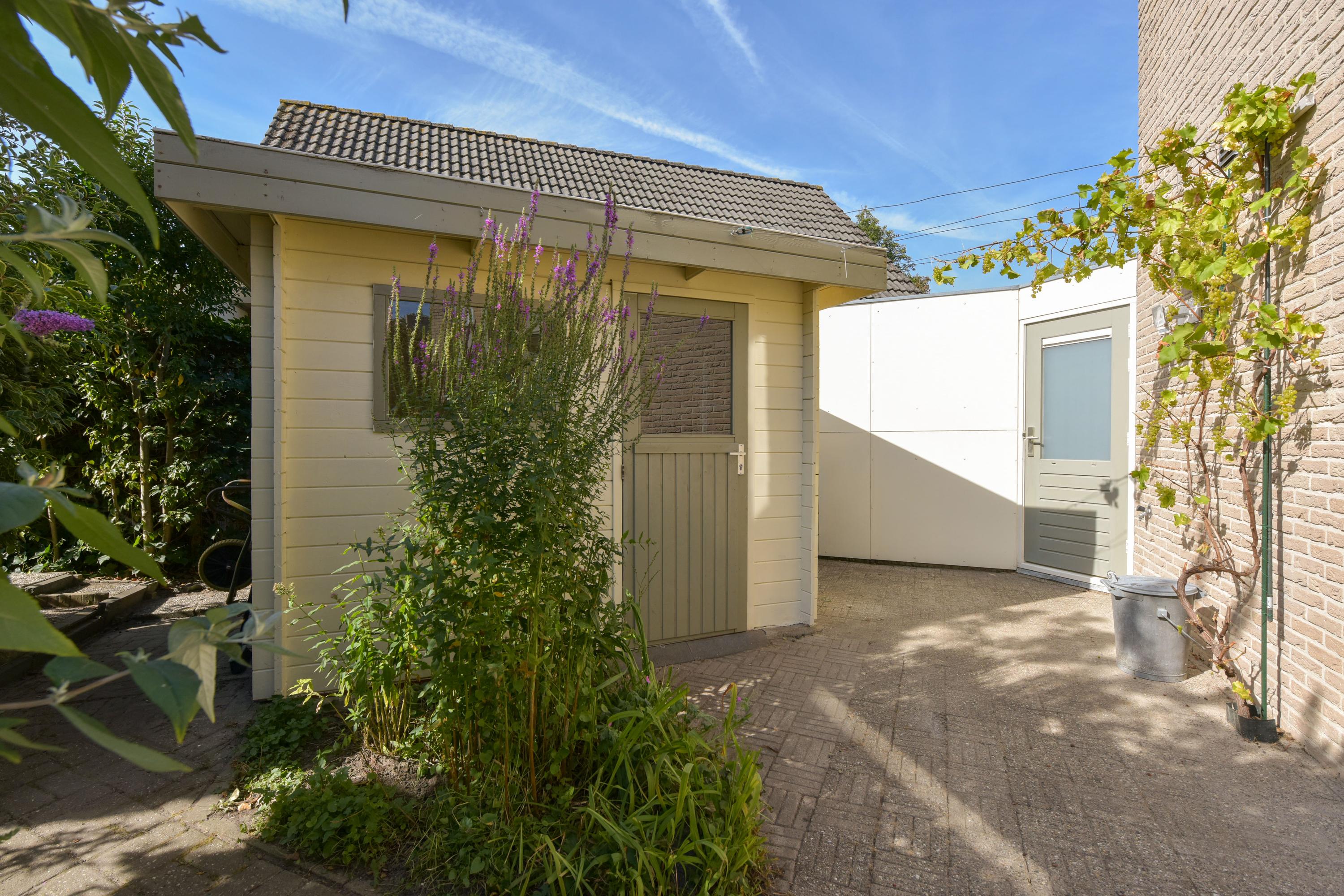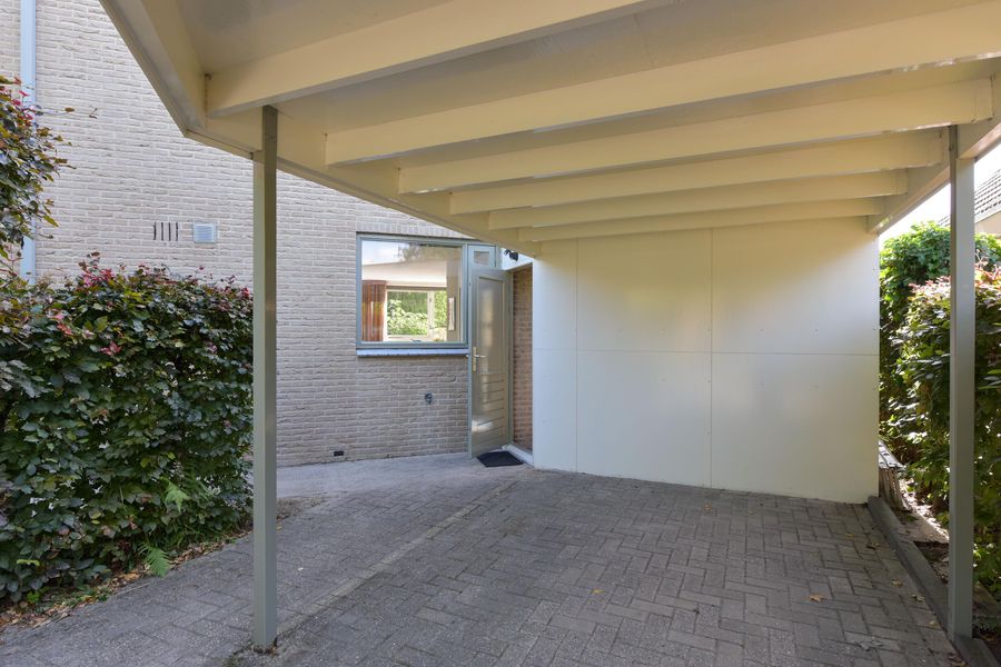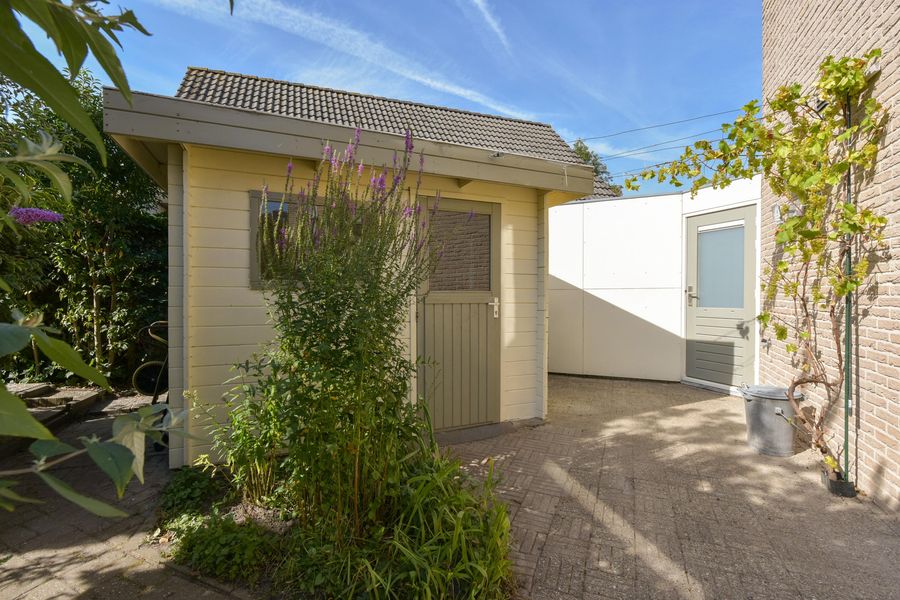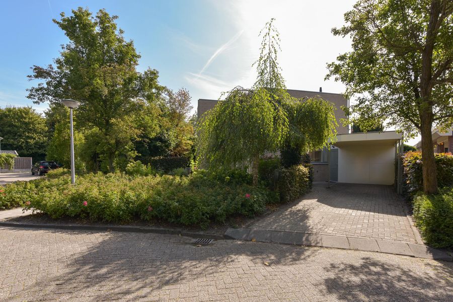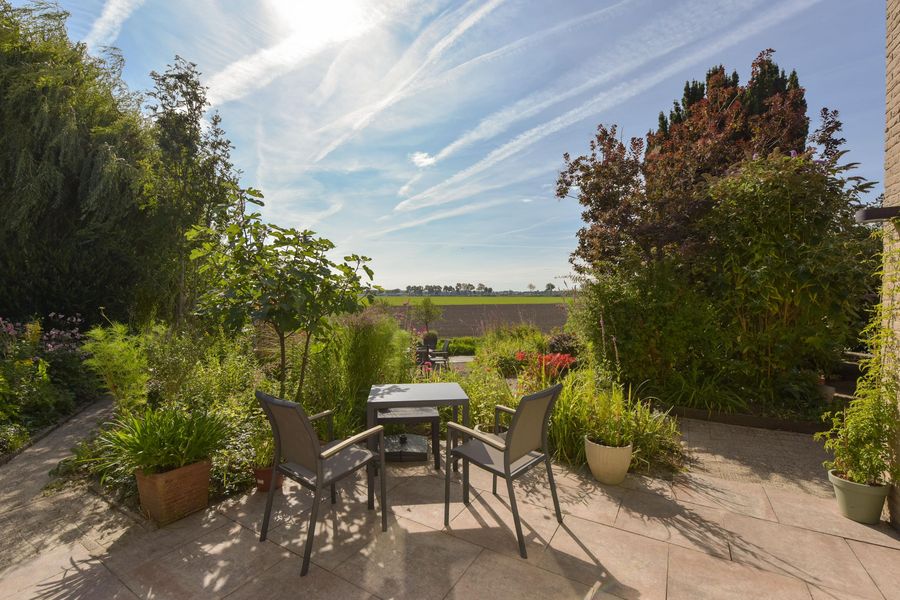 De tuin is prachtig aangelegd met verschillende terrassen gelegen in de zon maar ook in de schaduw. Het vrije uitzicht over de landerijen zorgen voor veel privacy en rust. Er is een extra houten vrijstaande berging voor al je tuingereedschap. Wel zo praktisch toch! Ook zo praktisch is de carport aan de zijkant van het huis. Door de enorme oprit kun je hier ook meerdere auto's parkeren. De omgeving is lekker rustig en groen (park op loopafstand), kortom heerlijk wonen dus!