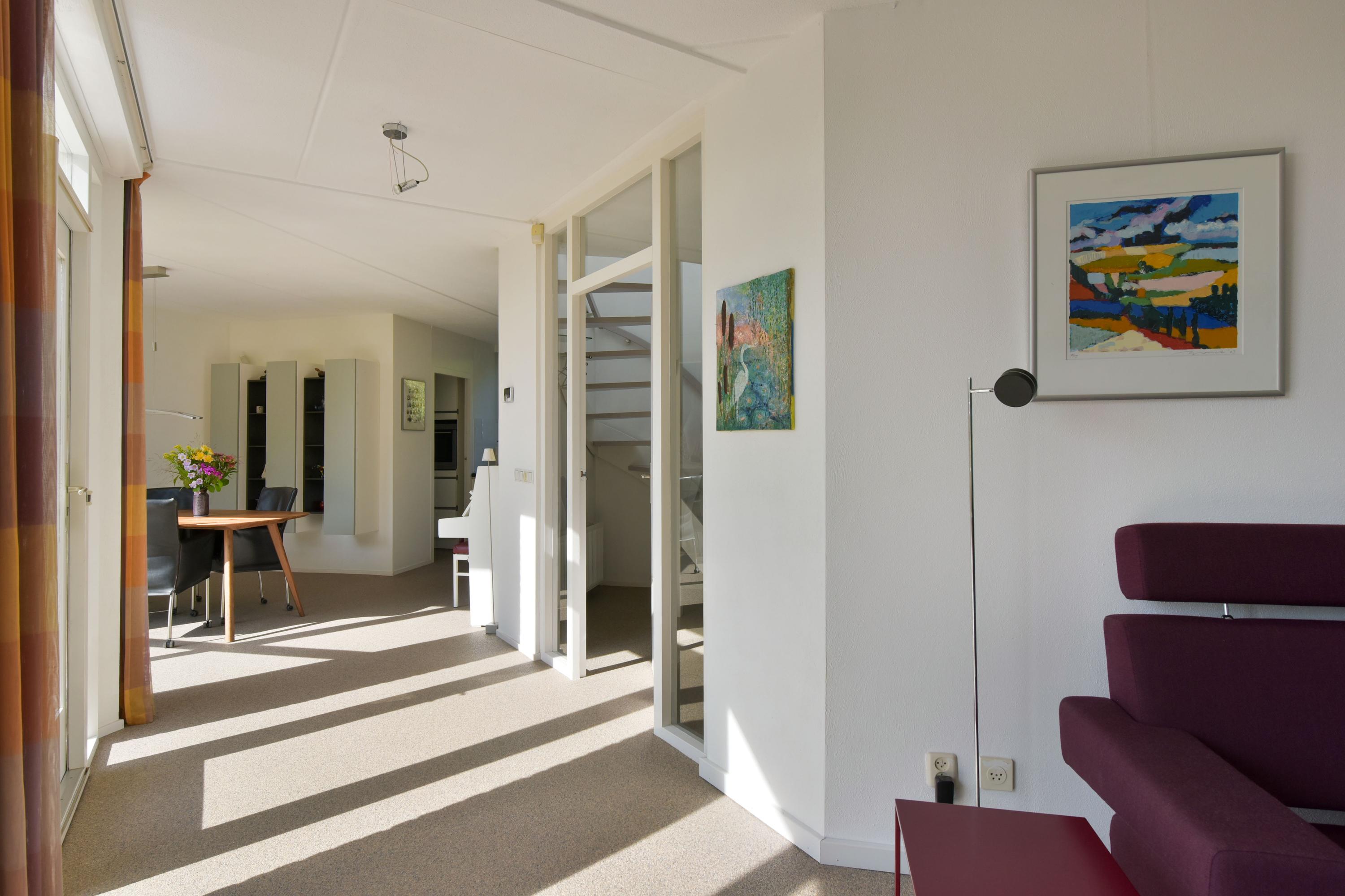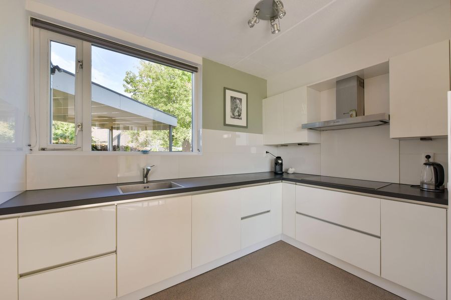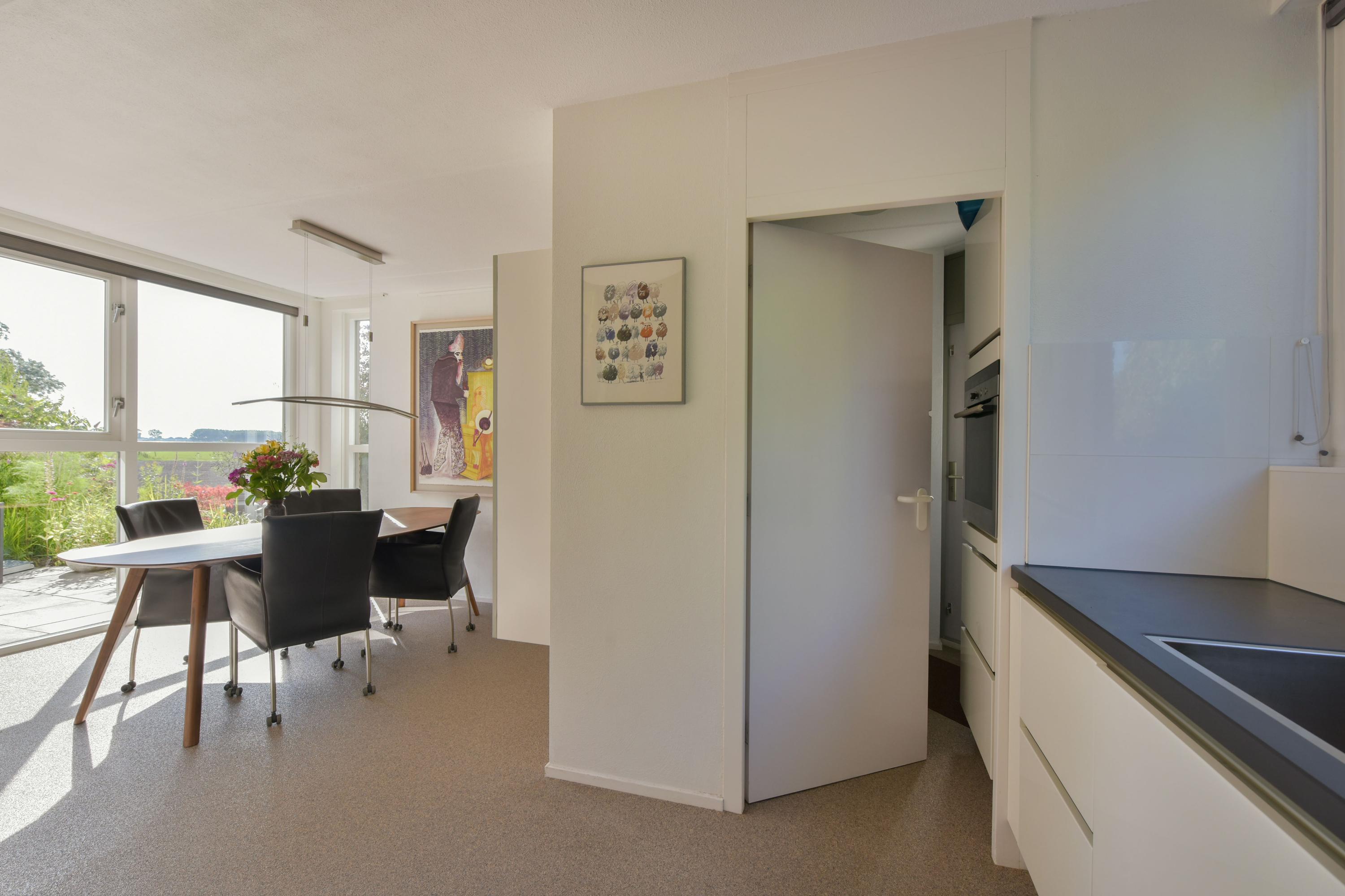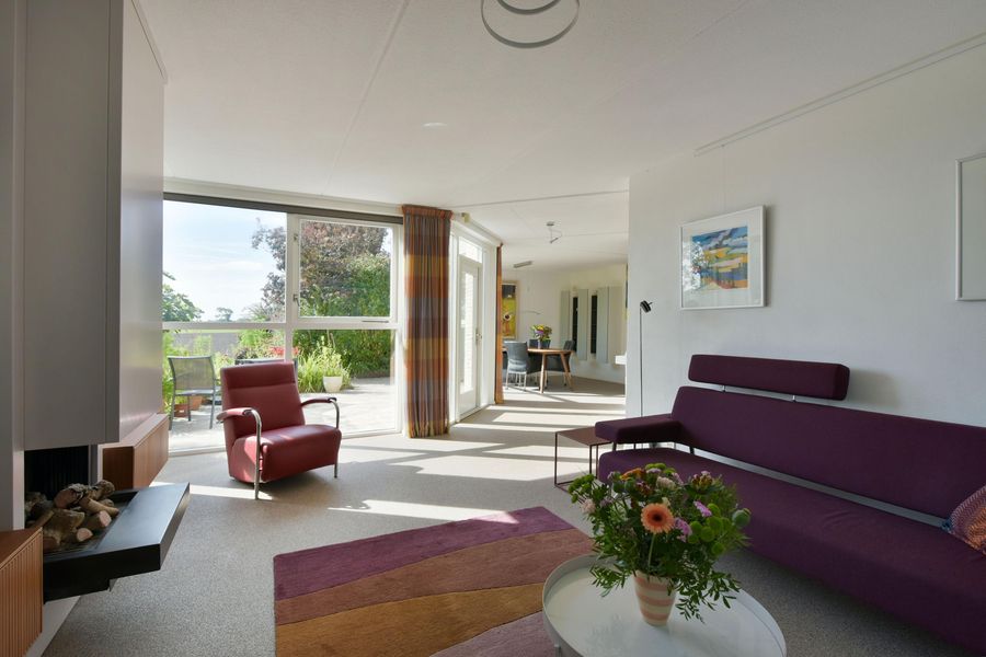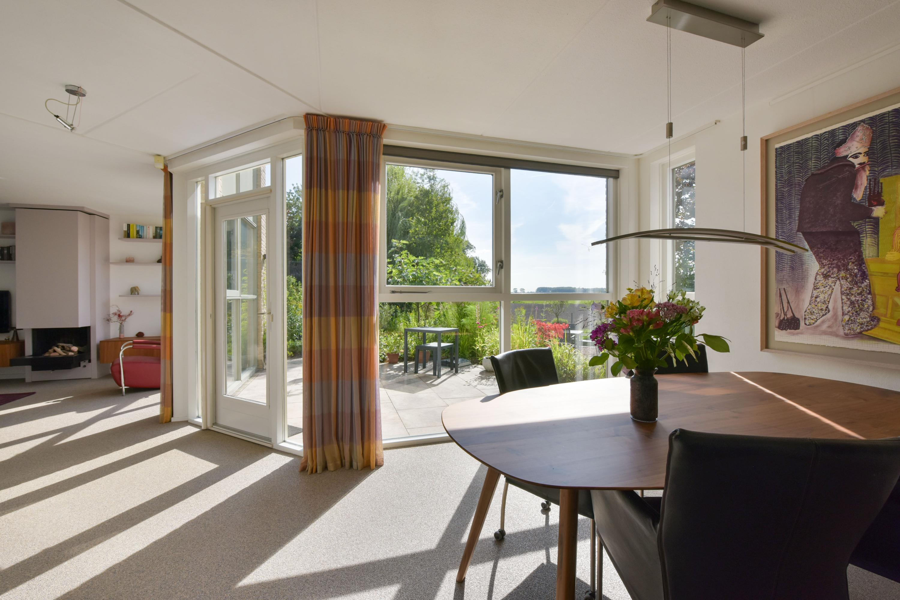 De woonkamer is royaal en stijlvol met een strakke structuurverfafwerking, vernieuwde woongrindvloer met vloerverwarming en een gezellige gashaard. Wil je liever een houtkachel? Ook dat is hier te realiseren. Grote raampartijen zorgen voor veel licht en een prachtig uitzicht over het groen en het water. Vanuit de bijkeuken heb je toegang tot een aangebouwde berging en ben je zo bij je auto die je makkelijk onder de carport parkeert.