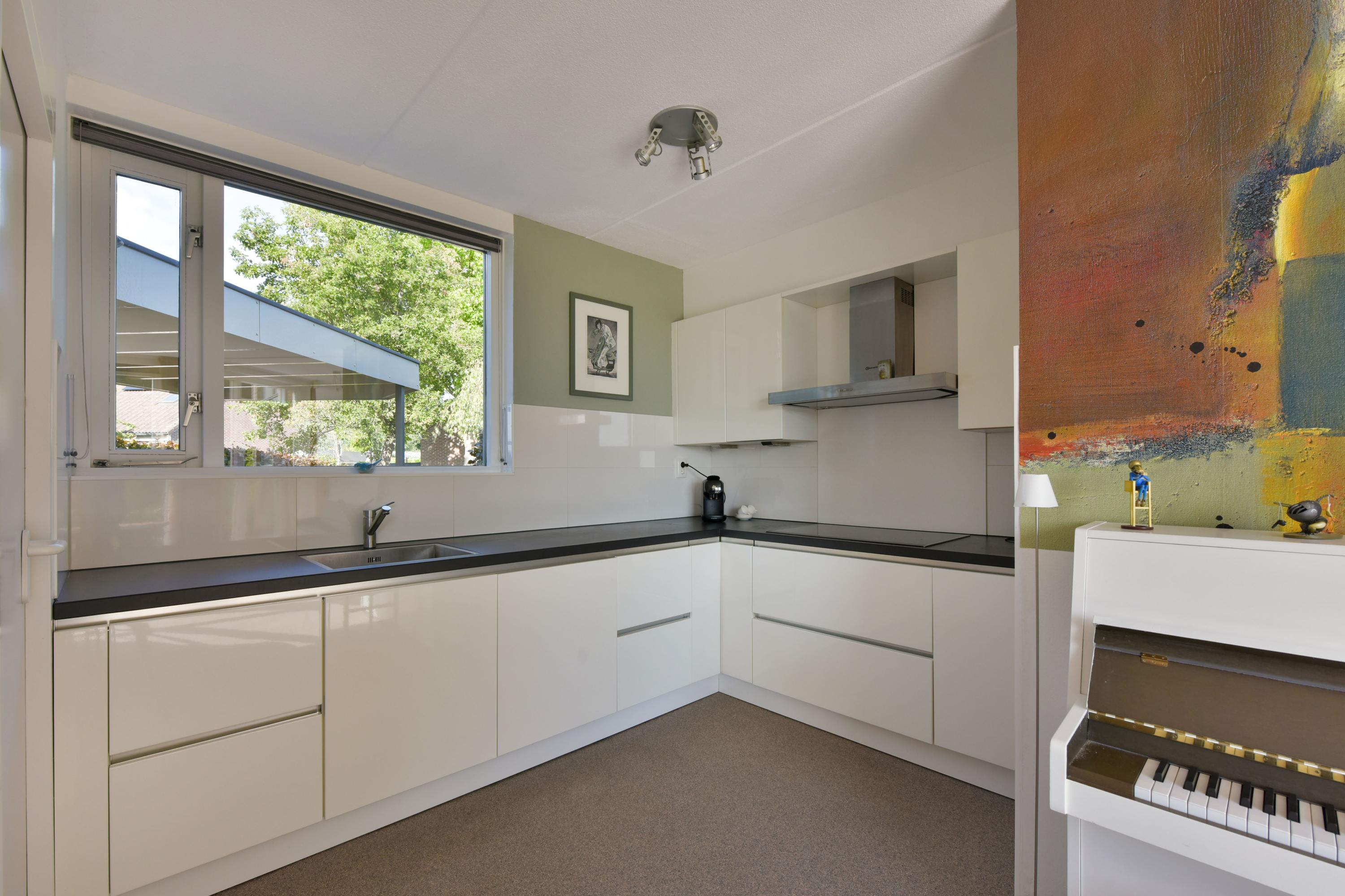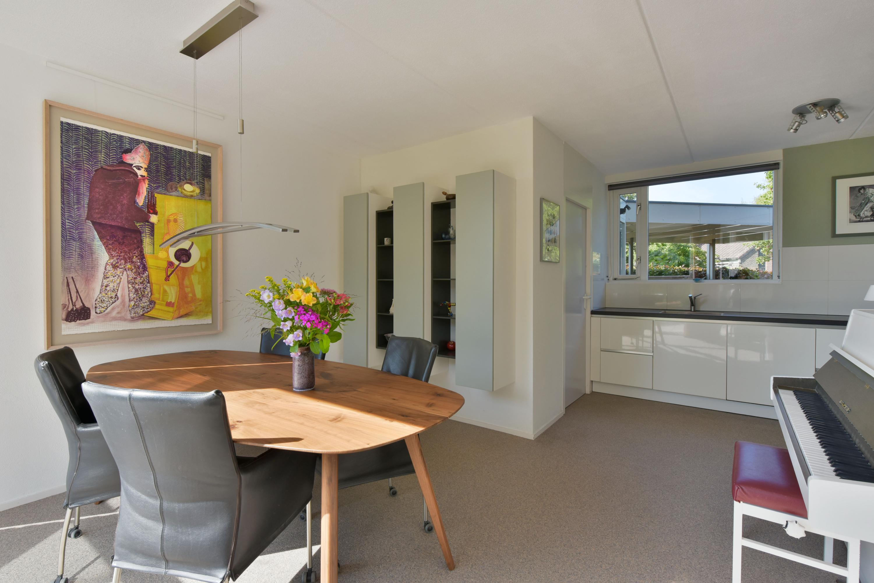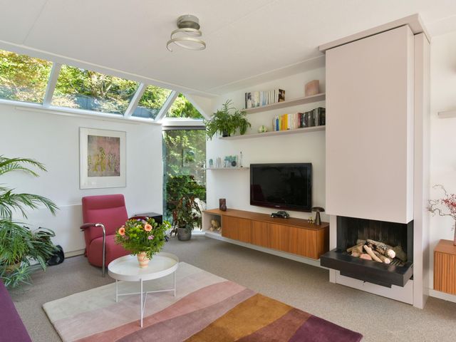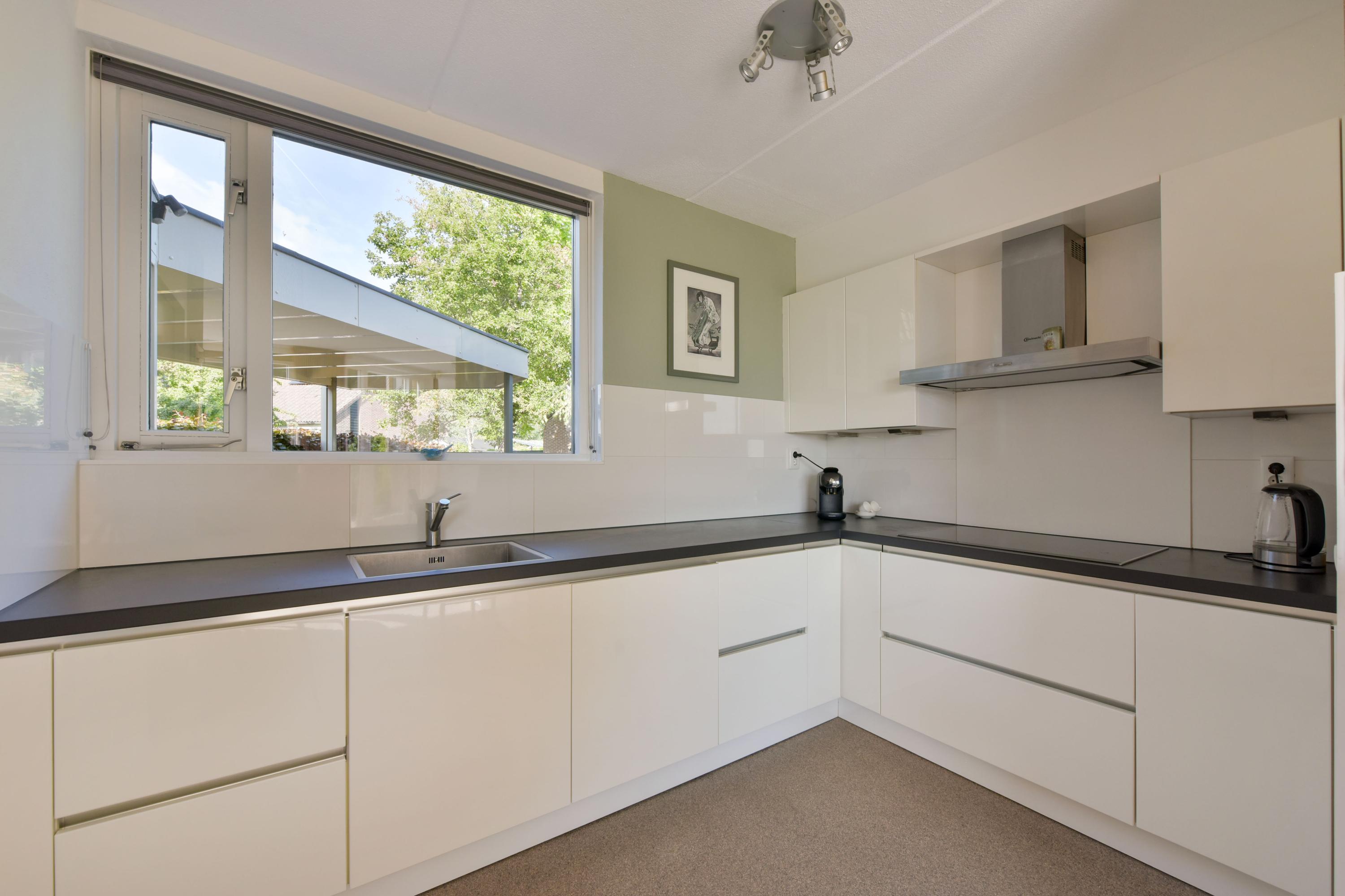 De woonkamer is royaal en stijlvol met een strakke structuurverfafwerking, vernieuwde woongrindvloer met vloerverwarming en een gezellige gashaard. Wil je liever een houtkachel? Ook dat is hier te realiseren. Grote raampartijen zorgen voor veel licht en een prachtig uitzicht over het groen en het water. Vanuit de bijkeuken heb je toegang tot een aangebouwde berging en ben je zo bij je auto die je makkelijk onder de carport parkeert.