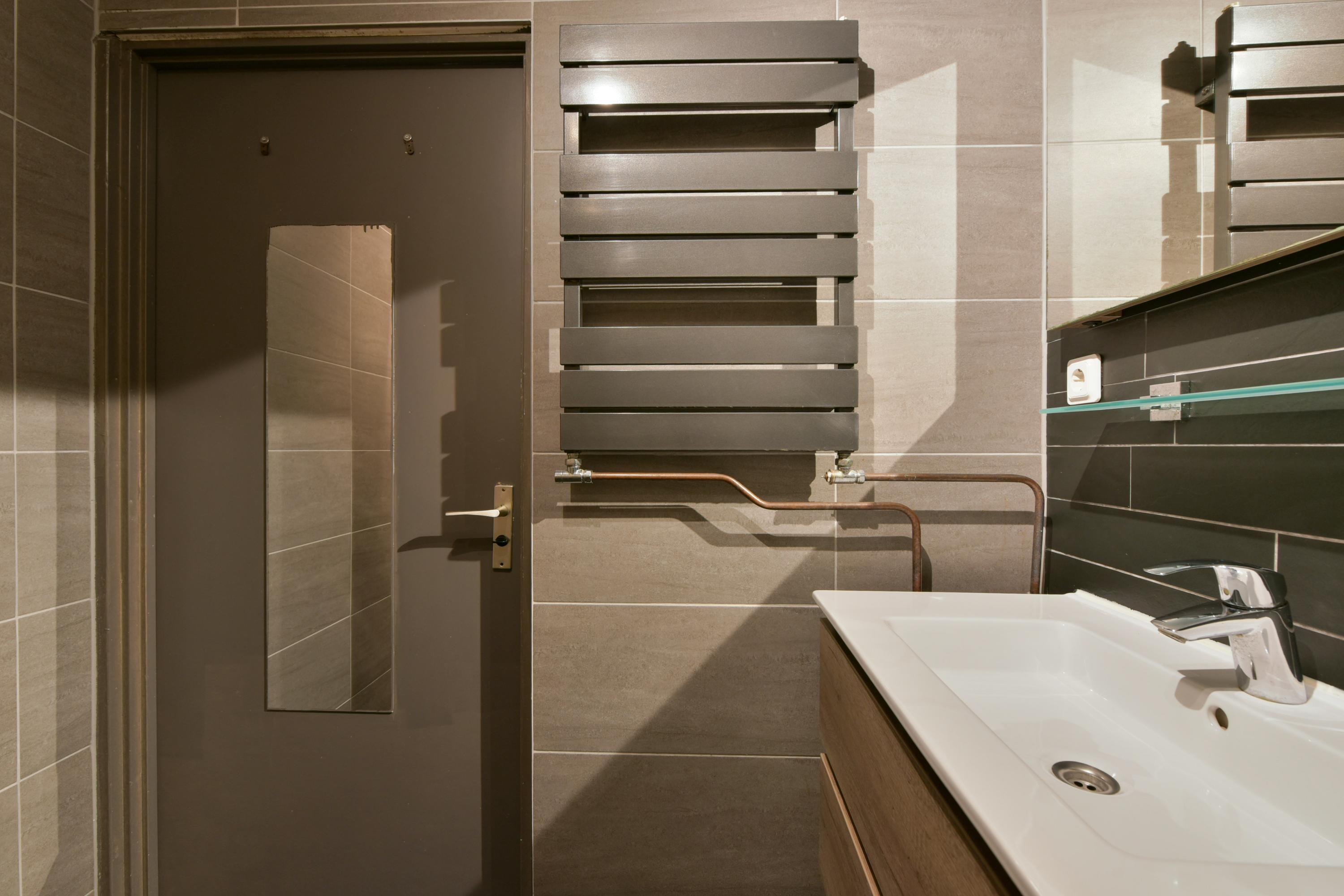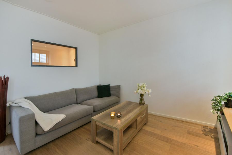 - Eiken houten vloer in de woonkamer en strakke wanden/plafonds met inbouwspots;