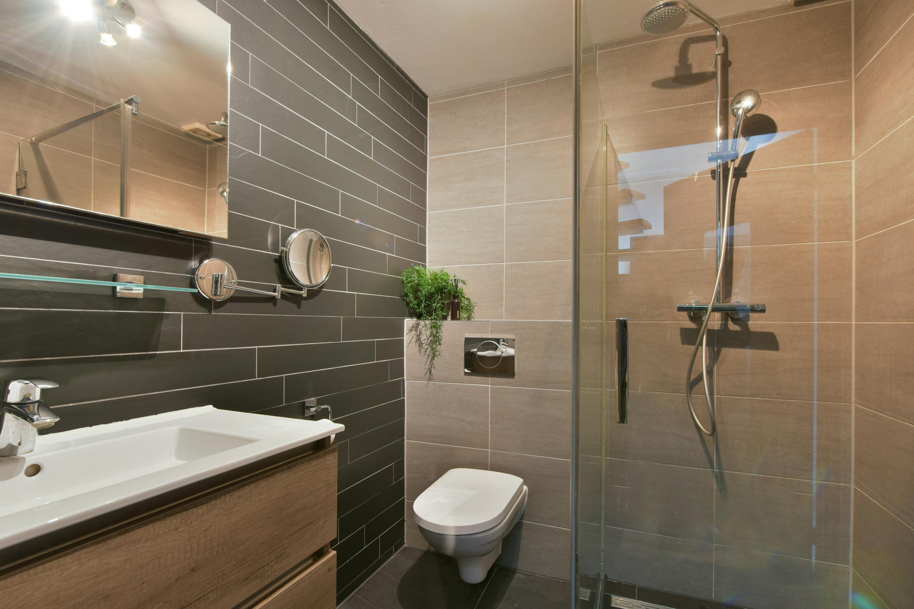 - Luxe badkamer in bruin/grijze kleurstelling met wandcloset, inloopdouche & wastafelmeubel;
