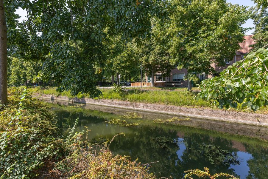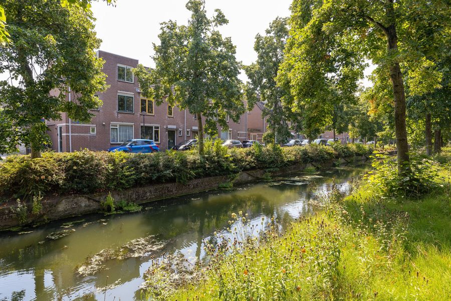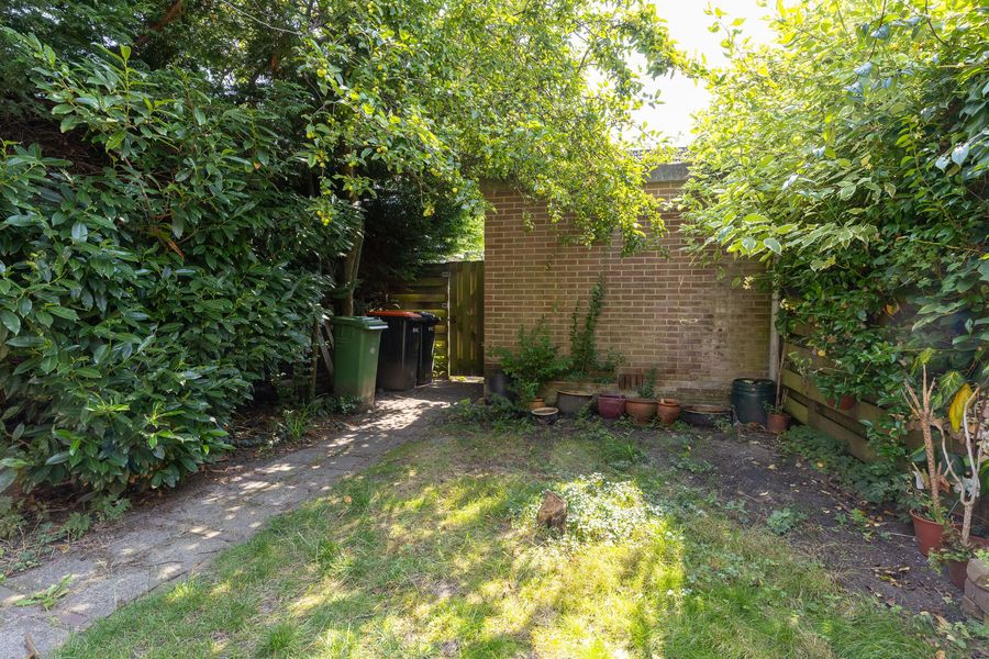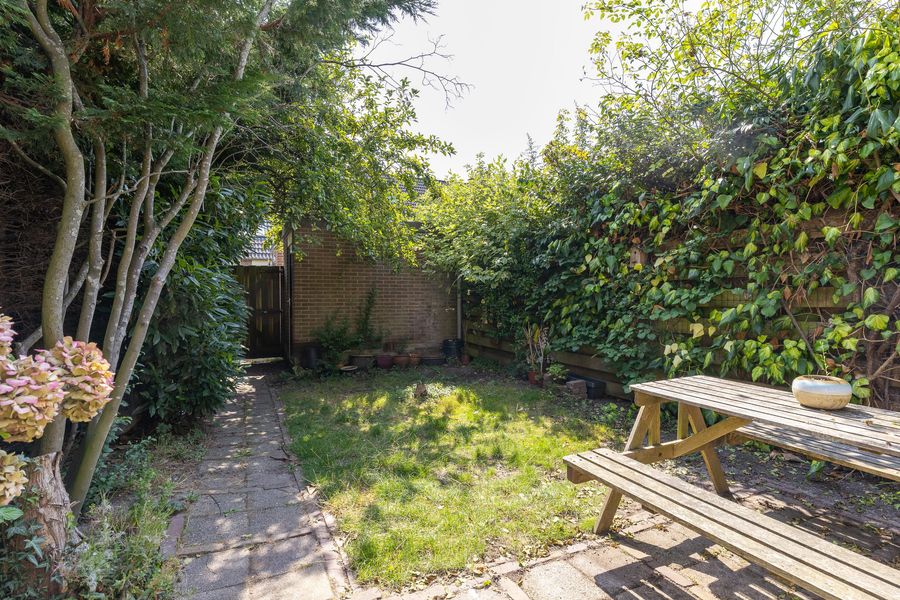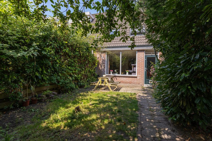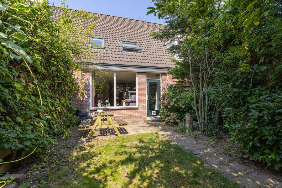 De tuin is zonnig en heeft een combinatie van gras en een betegeld terras. De ligging van de woning aan het water en het groene karakter zorgen voor een beschutte en knusse sfeer. Heerlijk om hier te ontspannen en in alle rust van het buitenleven te genieten.