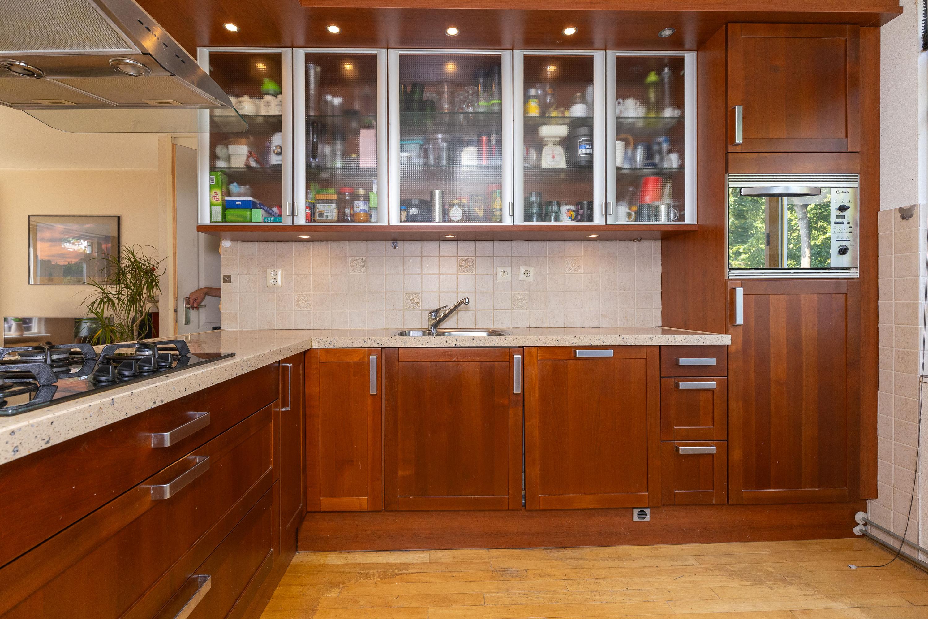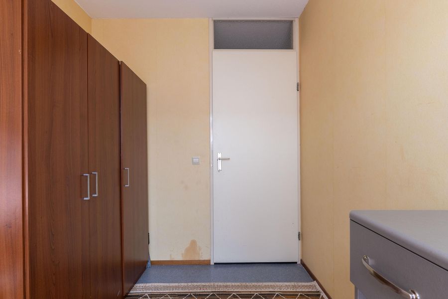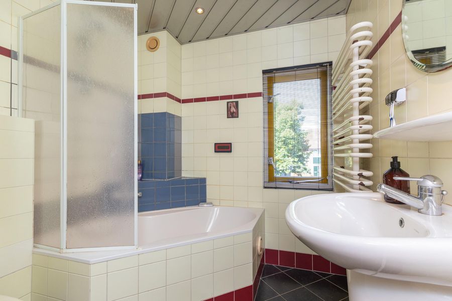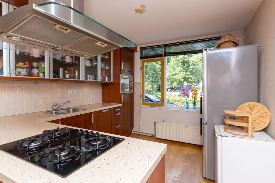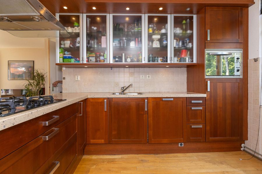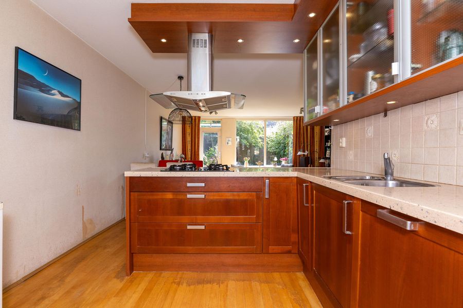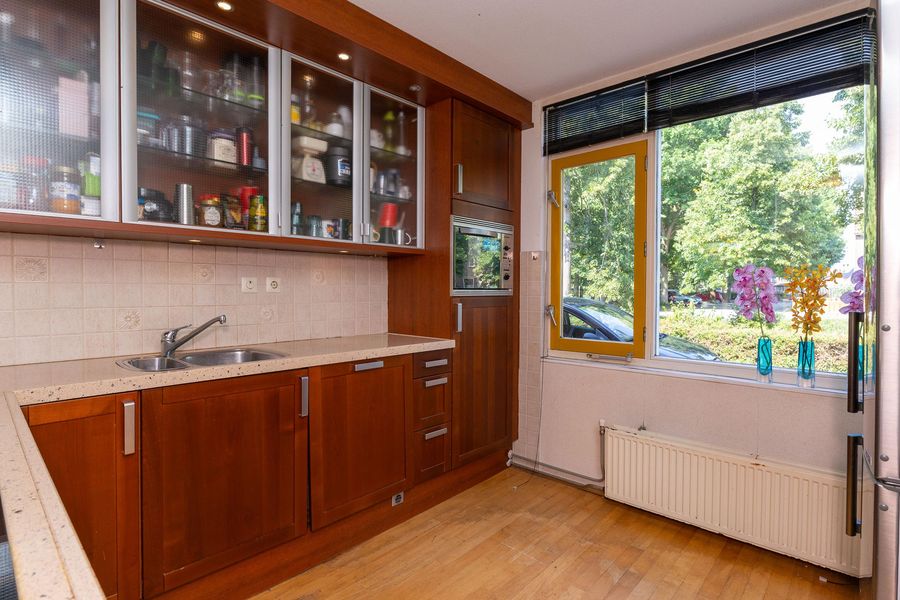 De keuken is functioneel, al is deze inmiddels wat verouderd. Eigenlijk geeft juist dat je de kans om hier jouw droomkeuken te realiseren, geheel naar eigen smaak. De royale opstelling biedt in elk geval al veel ruimte om mee te werken!