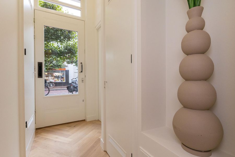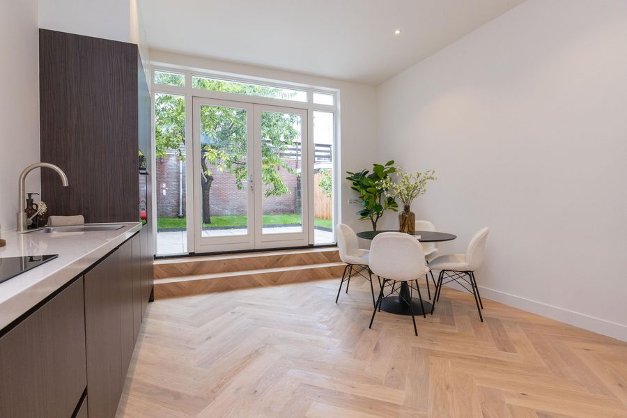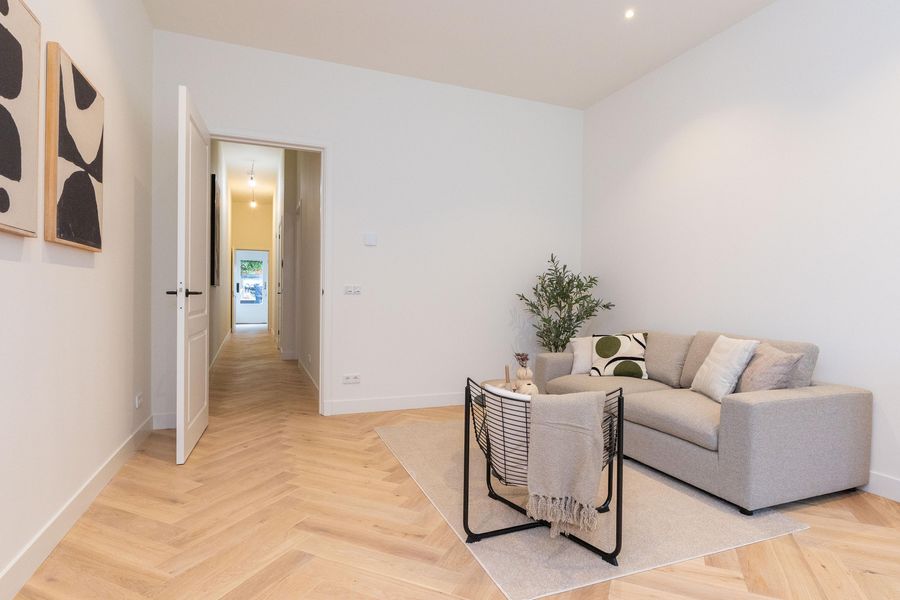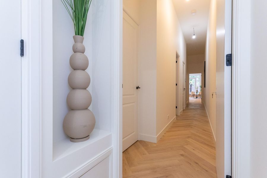 De lange hal met visgraatvloer leidt naar de indrukwekkende leefruimte waar het hoge plafond direct in het oog springt. De sfeer is warm, stijlvol en eigentijds. Openslaande deuren geven toegang tot de tuin, die dankzij de ligging op het zuidwesten een heerlijke plek is om te ontspannen.