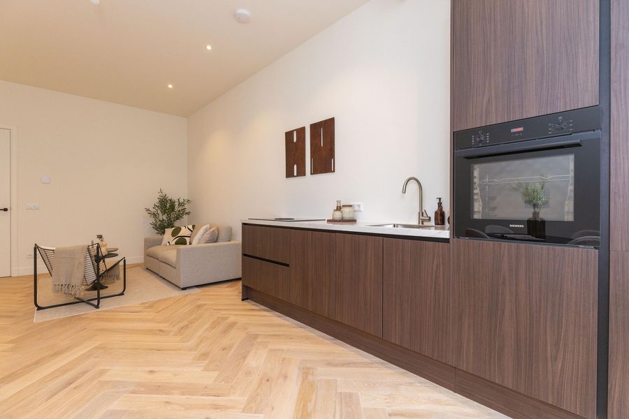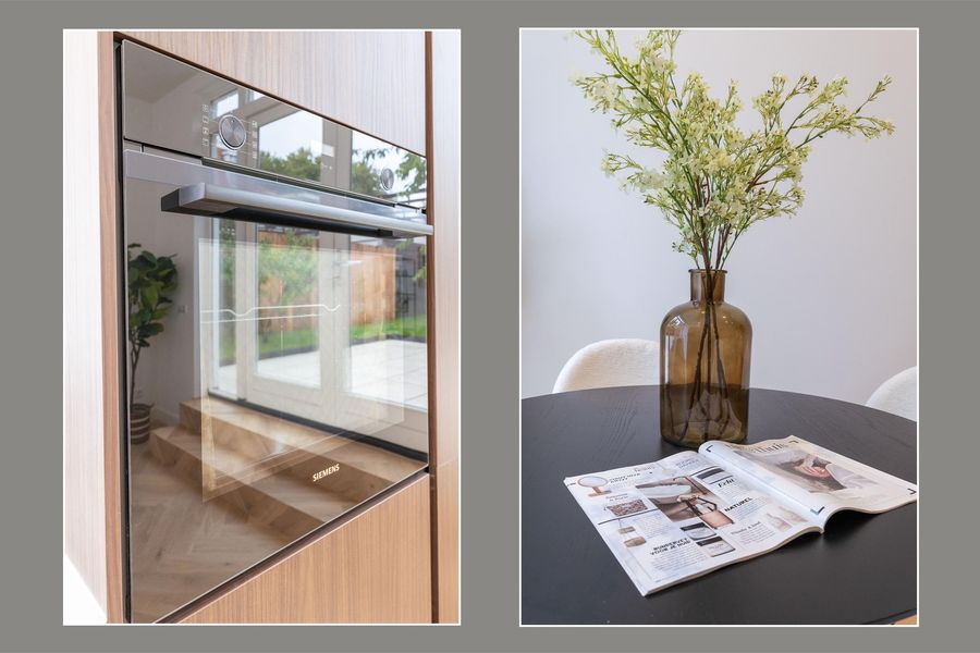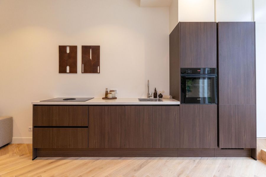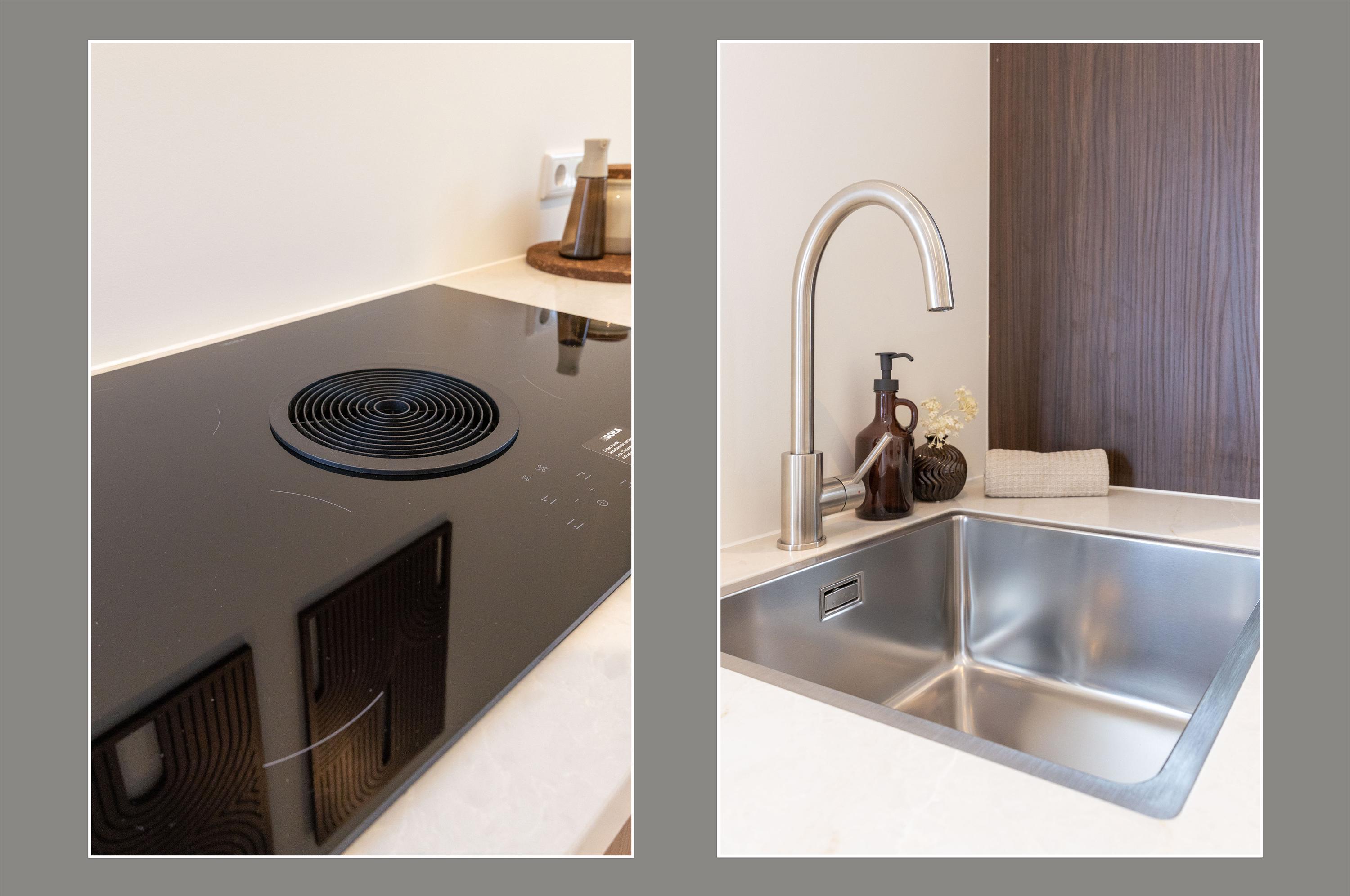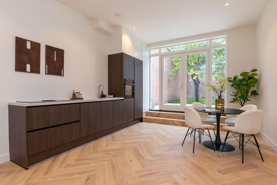 De keuken is een absolute blikvanger: strak vormgegeven, uitgevoerd in notenhout, voorzien van een stijlvol werkblad, koelvriescombinatie, combi-oven, inductiekookplaat met geïntegreerde afzuiging en uiteraard volop bergruimte.