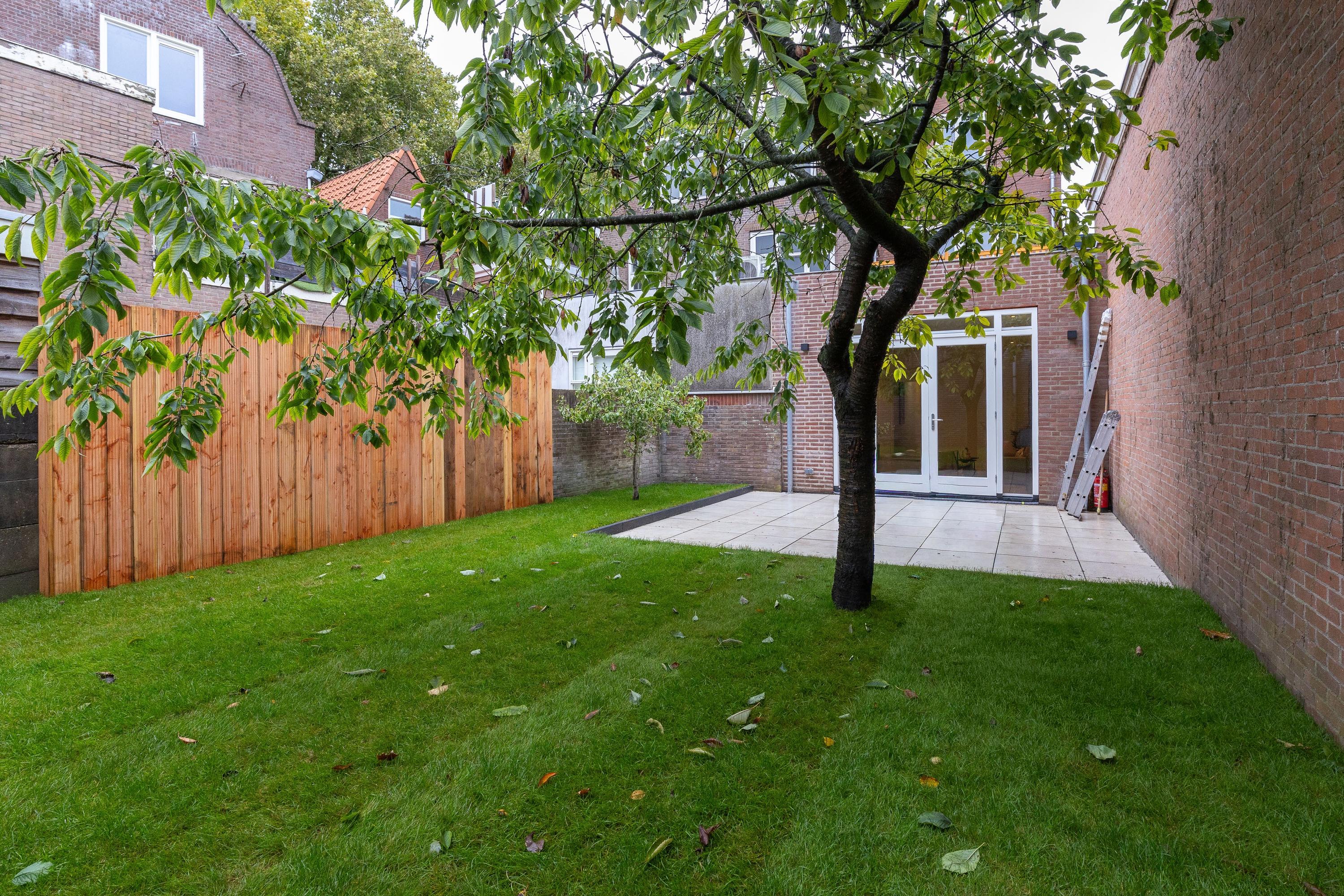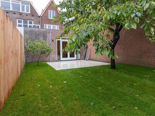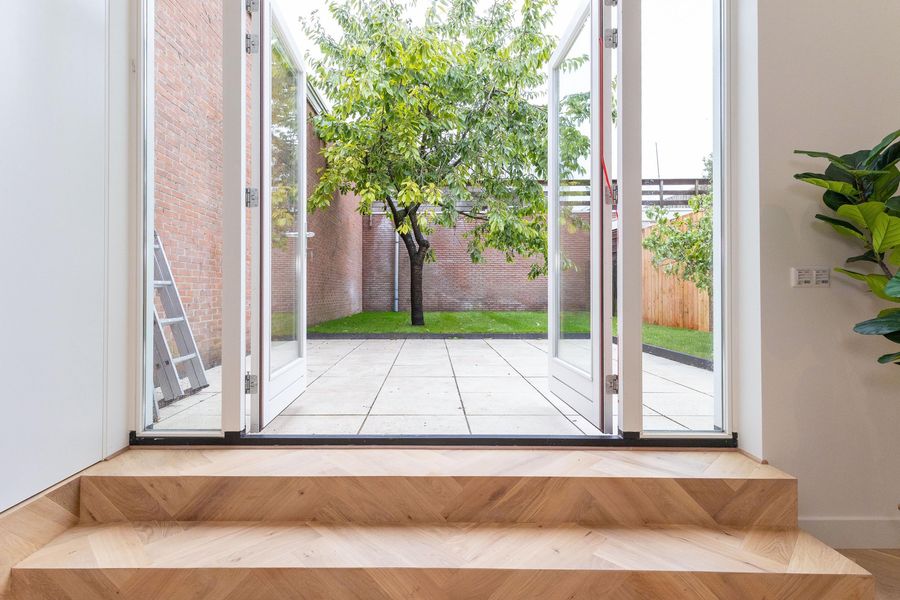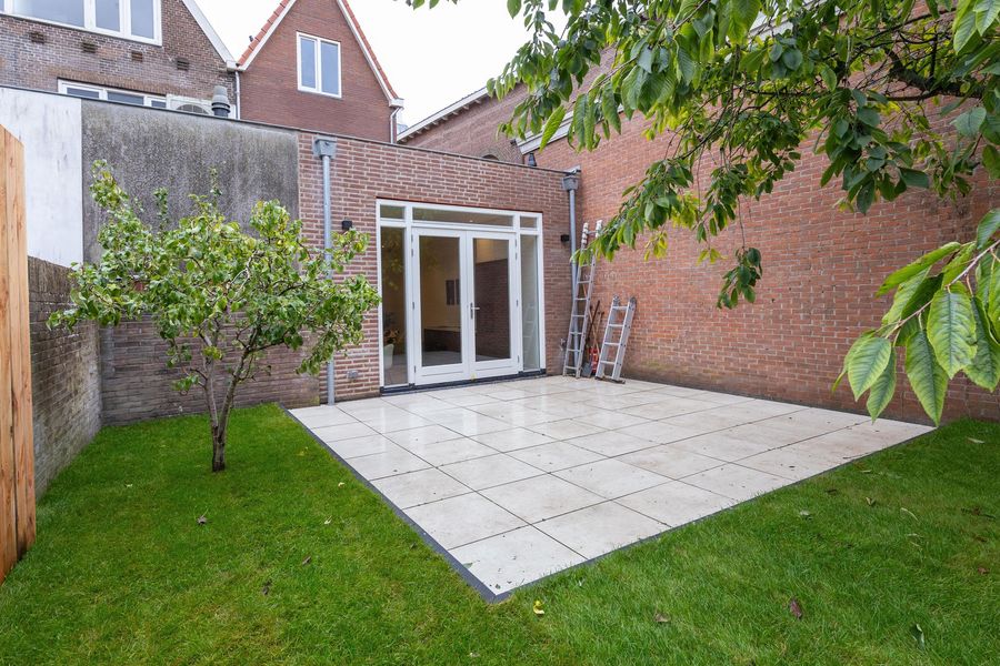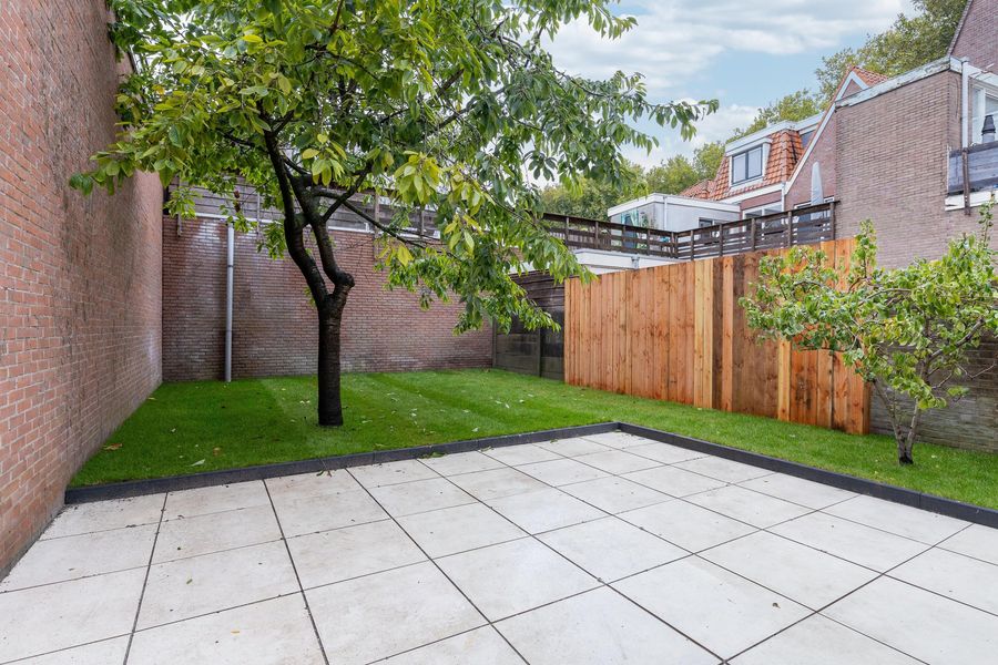 Buiten beschik je over een achtertuin van 11 x 7 meter, een zeldzame luxe in de binnenstad. Hier vind je een fraai terras, een strak gazon, een volwassen groenstructuur en volledige privacy.