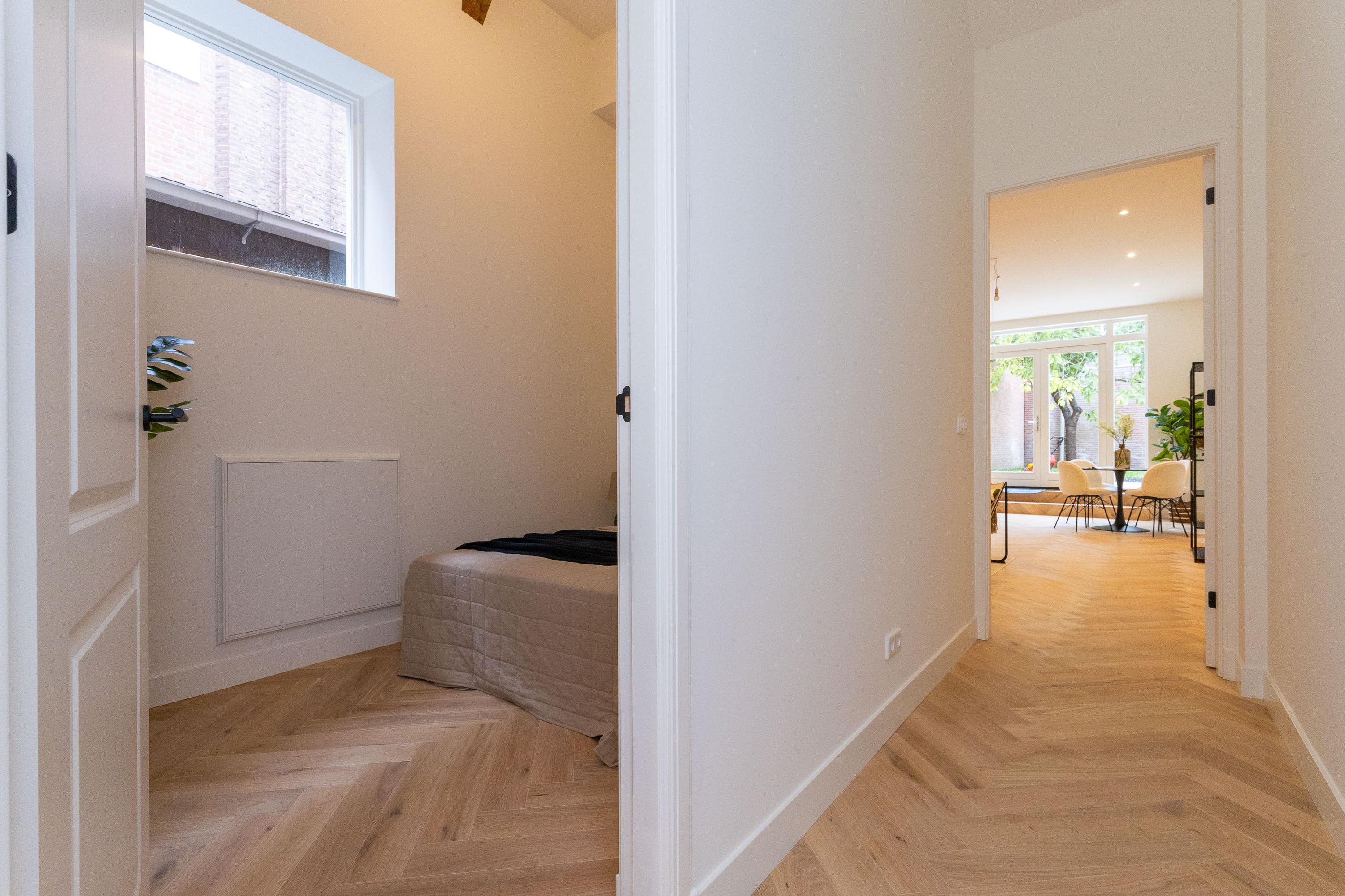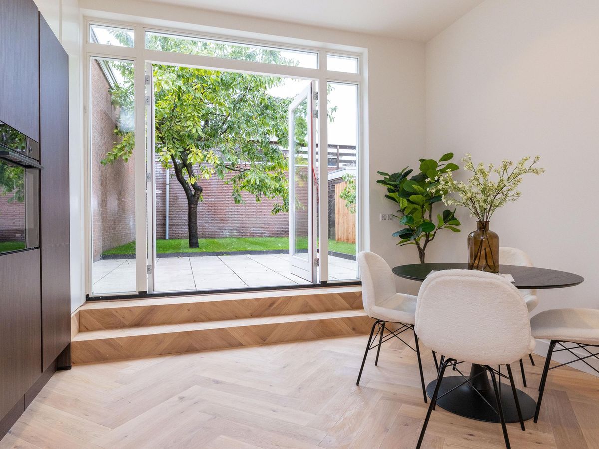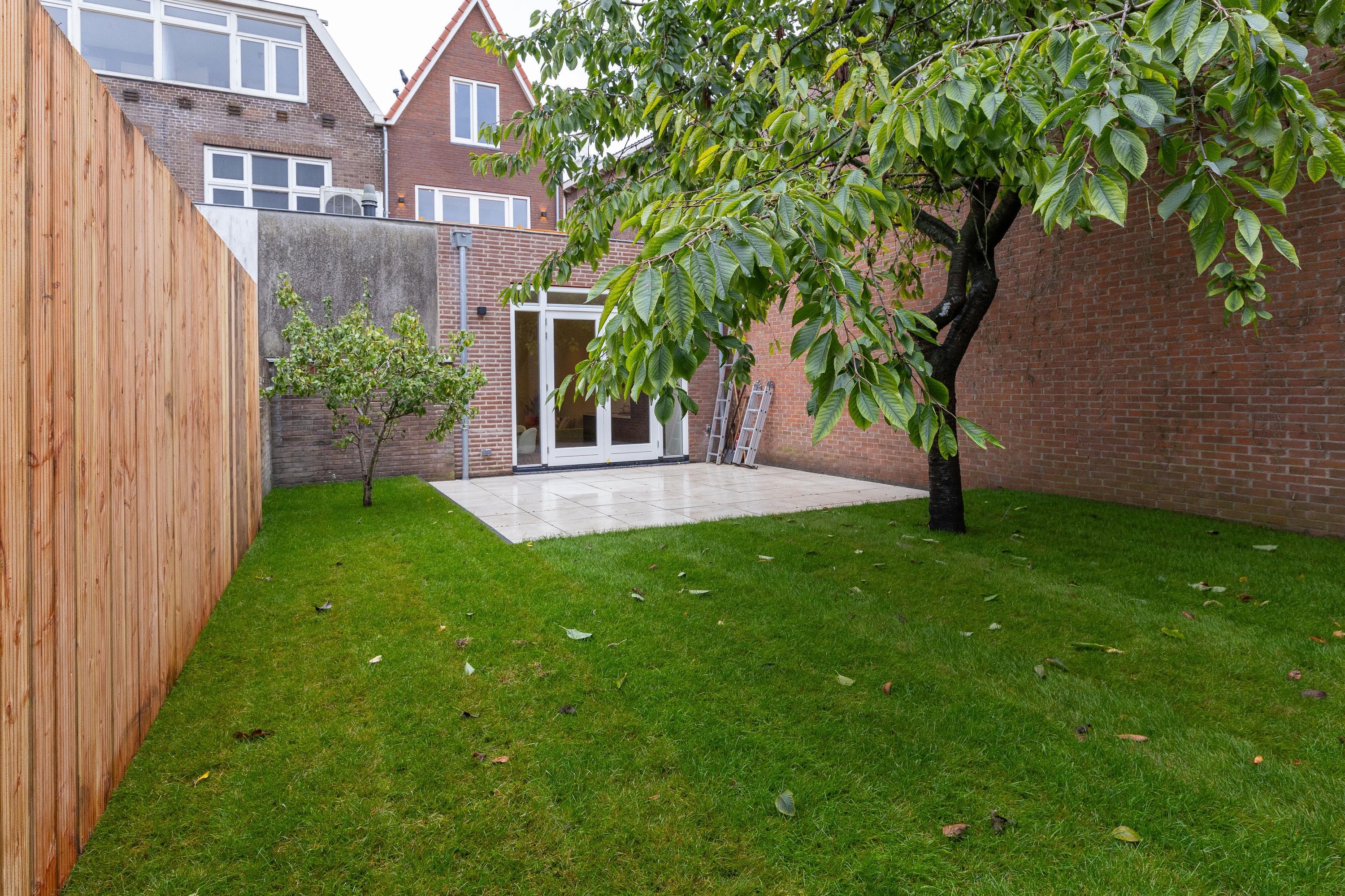 Buiten beschik je over een achtertuin van 11 x 7 meter, een zeldzame luxe in de binnenstad. Hier vind je een fraai terras, een strak gazon, een volwassen groenstructuur en volledige privacy.