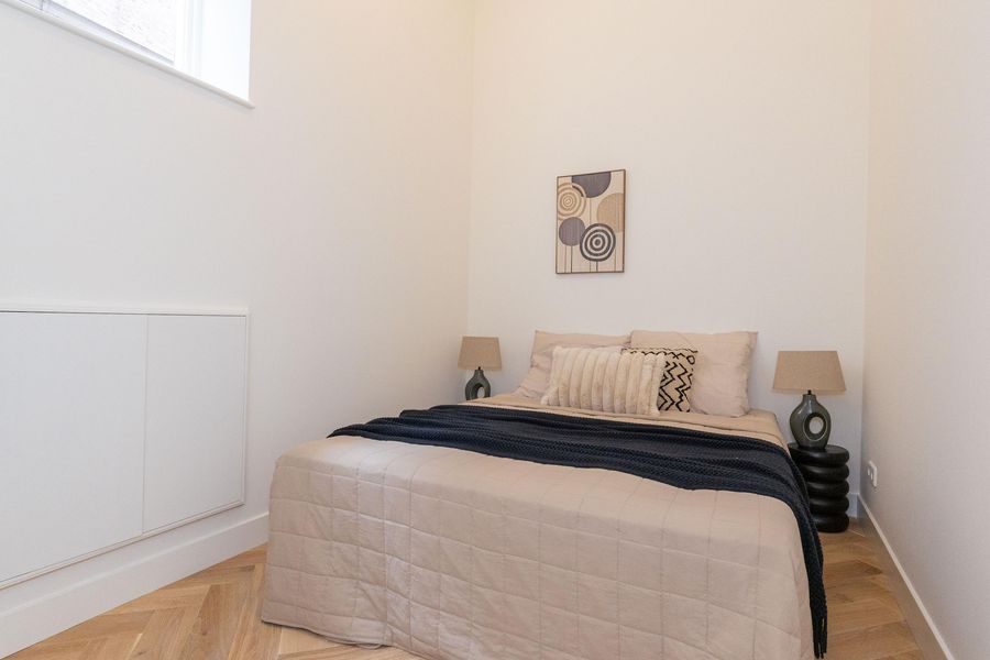 De badkamer is modern en luxe met rustige materialen, een dubbel wastafelmeubel in robuust eiken, een inloopdouche, spiegel met verlichting en een wandcloset. Ook de twee slaapkamers zijn fraai afgewerkt – comfortabel, licht en praktisch ingedeeld.
