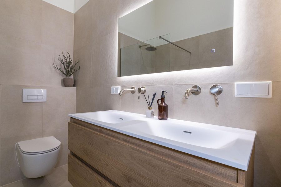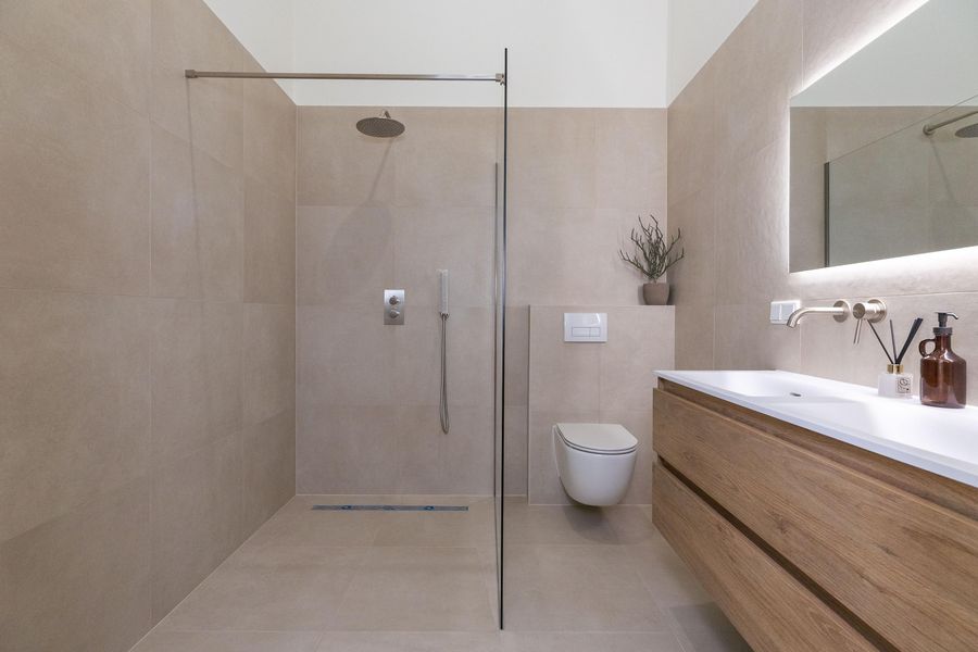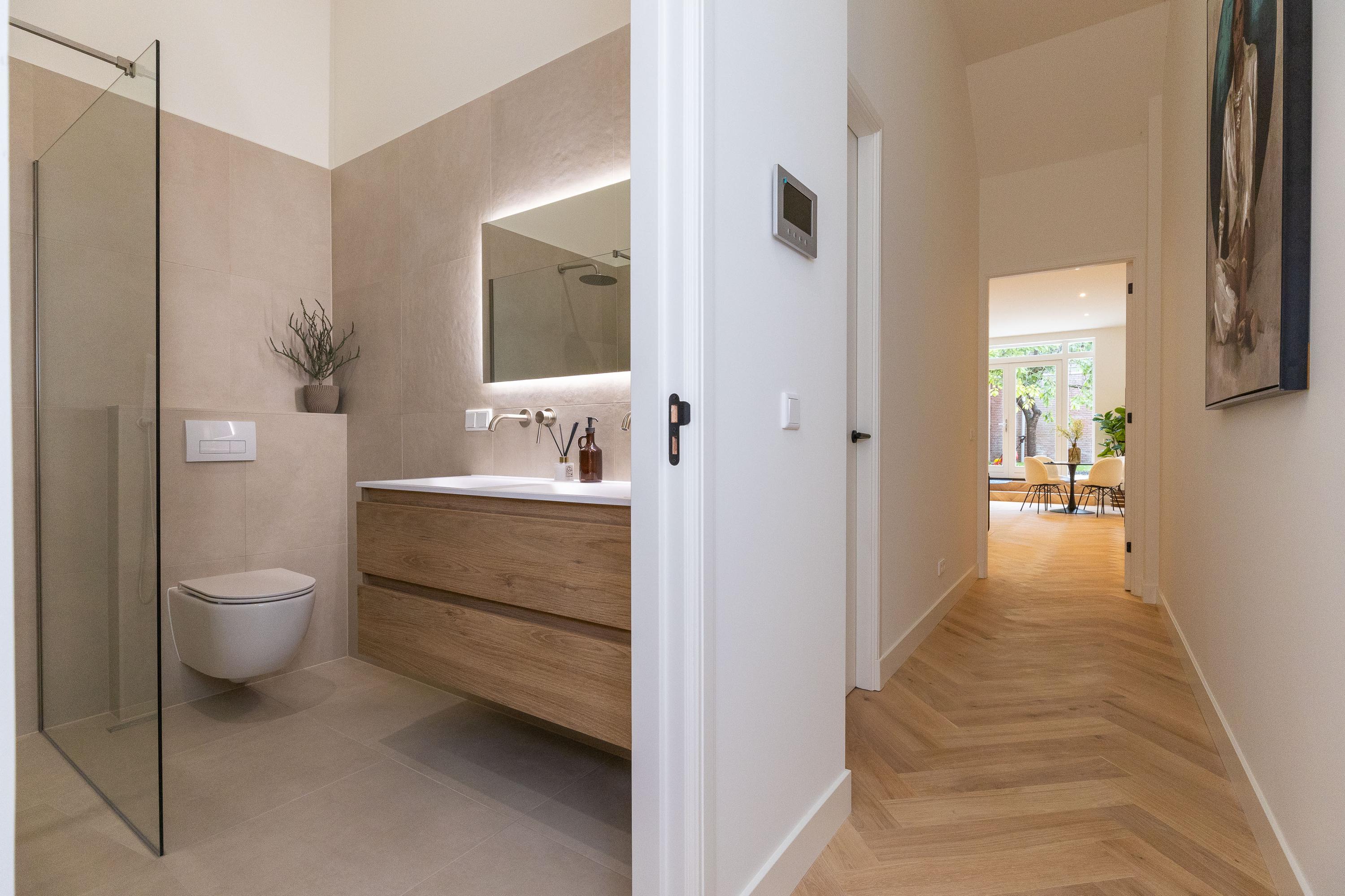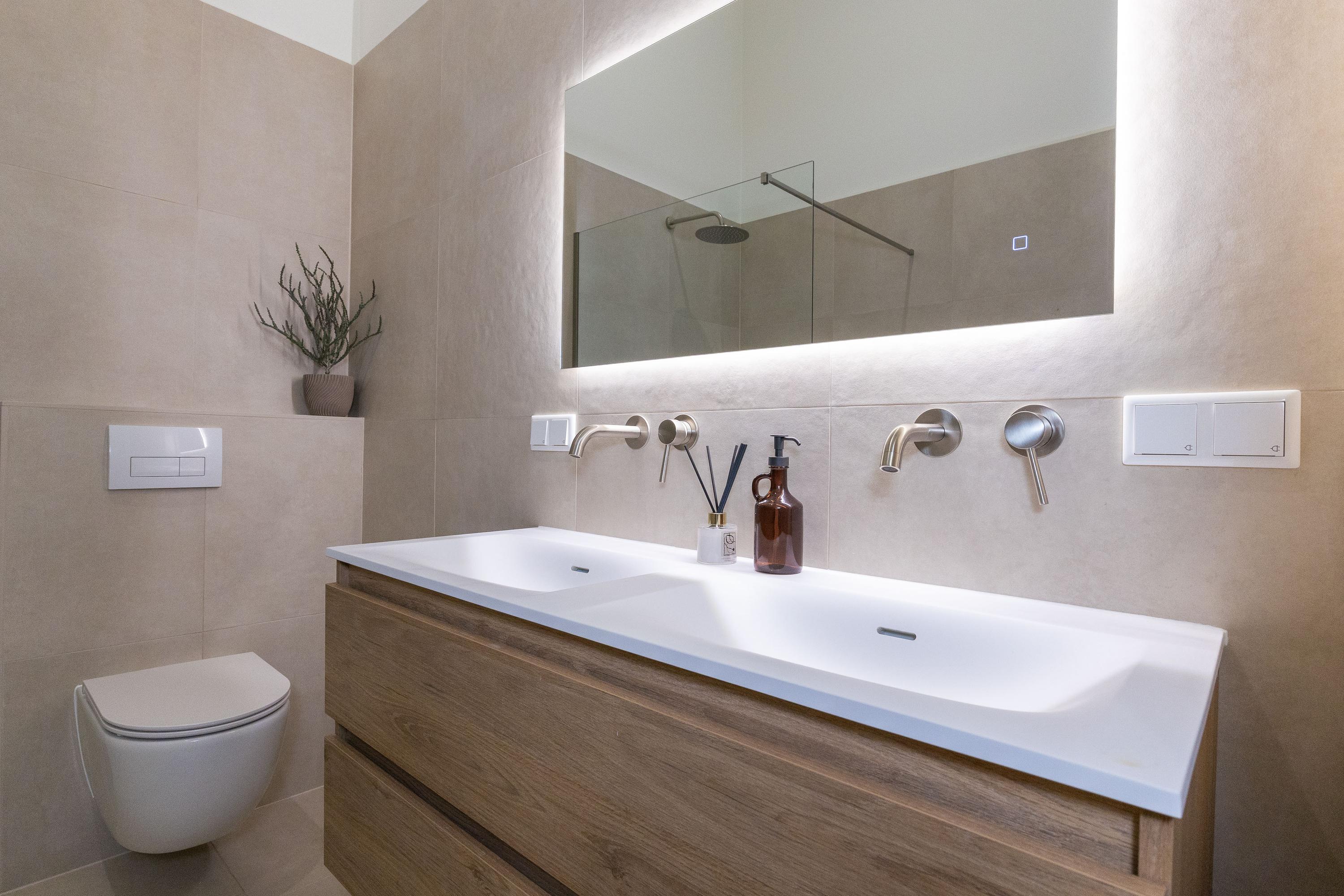 - Toilet, dubbele wastafel, wastafelmeubel, inloopdouche en vloerverwarming