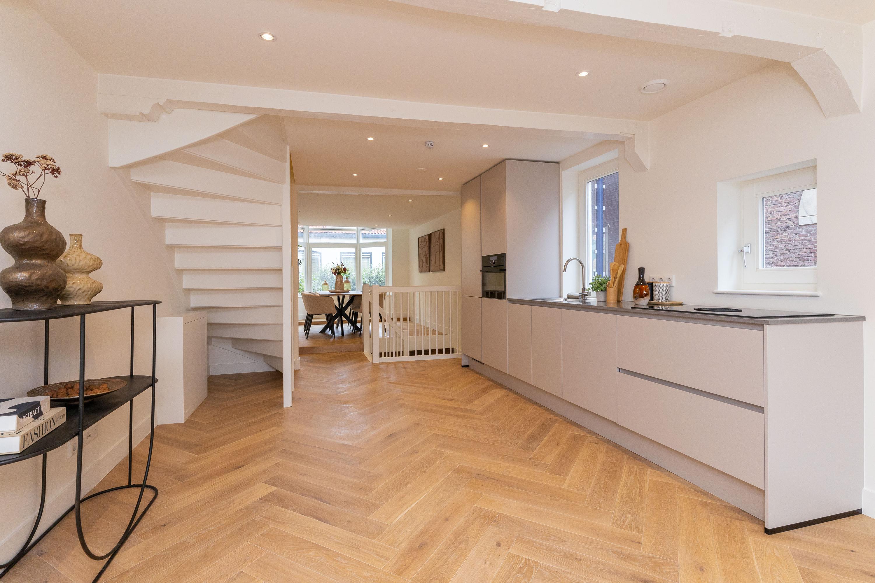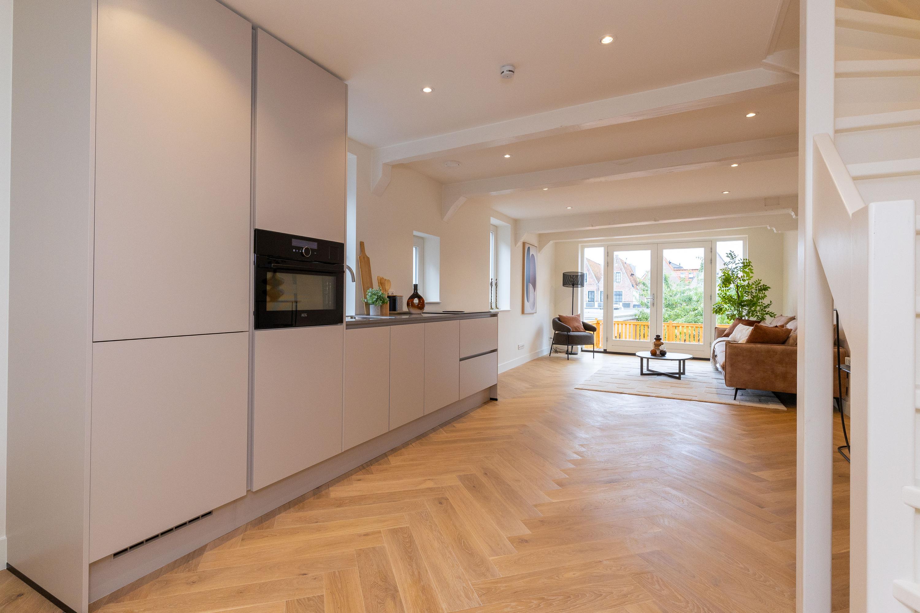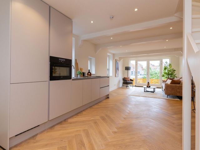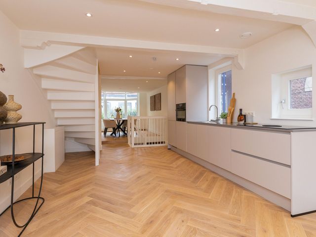 De andere kant van de woning is volledig ingericht als woonkeuken: een luxe ruimte met een schitterende erker, veel licht en een geweldige keuken in licht taupe met een stoer zwart werkblad. Uiteraard voorzien van hoogwaardige inbouwapparatuur, een strak lijnenspel en volop werk- en kastruimte.