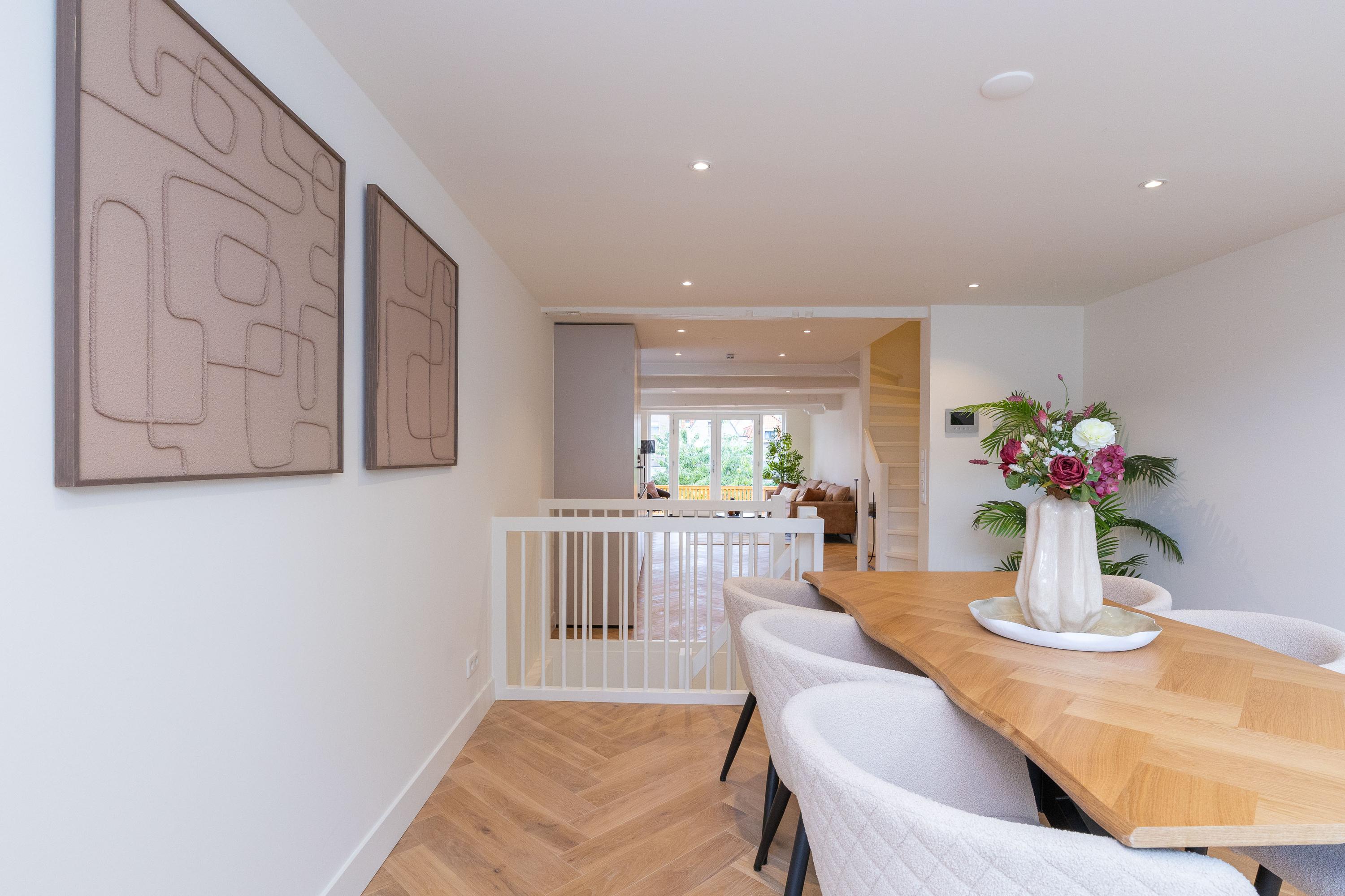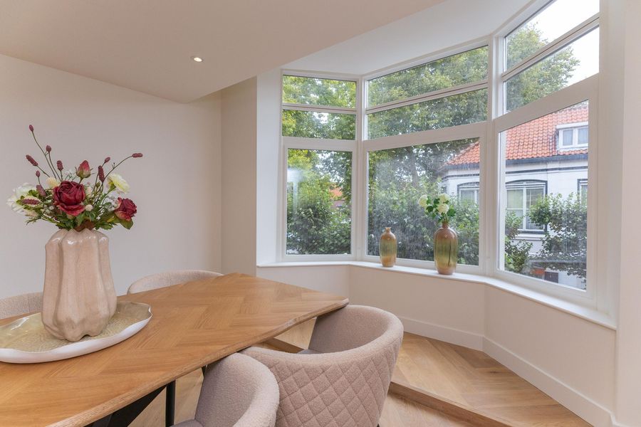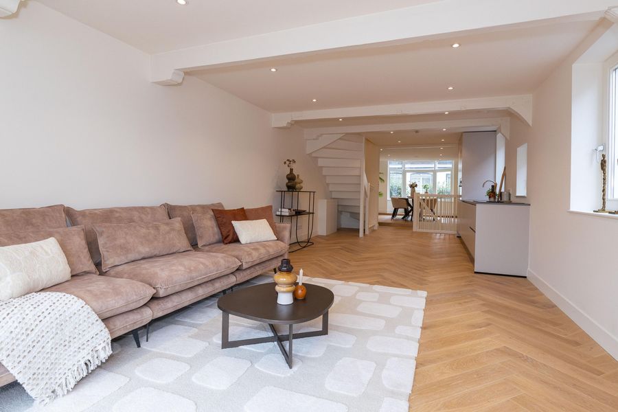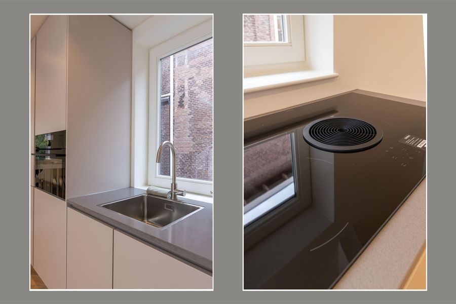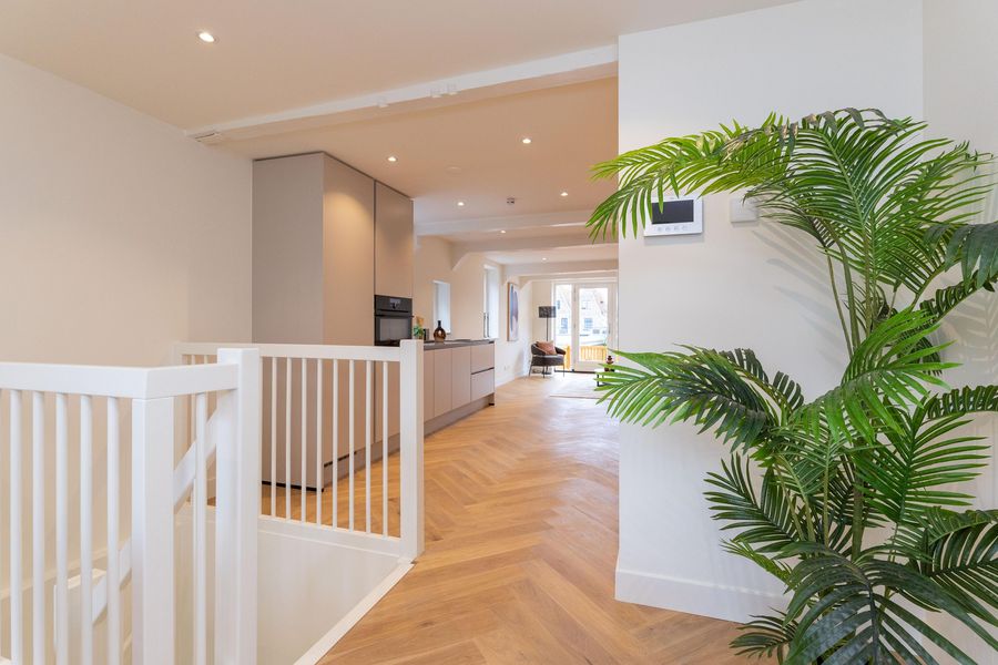De andere kant van de woning is volledig ingericht als woonkeuken: een luxe ruimte met een schitterende erker, veel licht en een geweldige keuken in licht taupe met een stoer zwart werkblad. Uiteraard voorzien van hoogwaardige inbouwapparatuur, een strak lijnenspel en volop werk- en kastruimte.