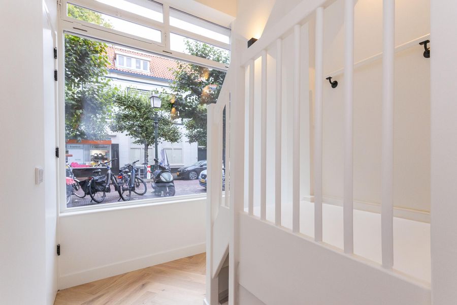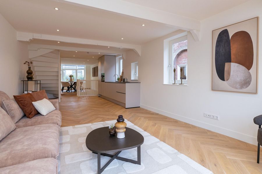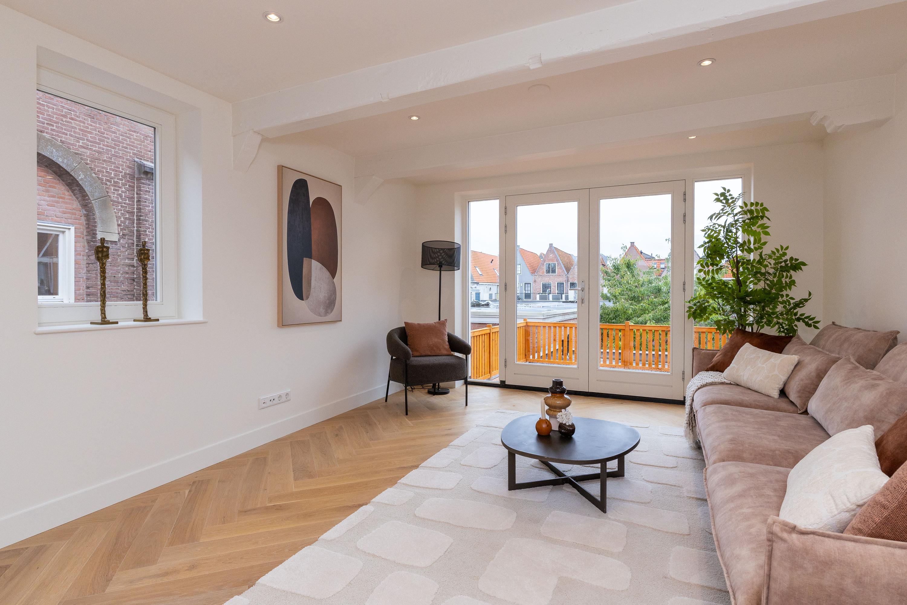 Via de stijlvolle entree bereik je dit appartement op de eerste verdieping, waar direct de mooie lichtinval, de hoge plafonds, de visgraatvloer en de authentieke balken opvallen. De woonkamer heeft een gezellige zithoek aan de achterzijde, waar openslaande deuren toegang geven tot het heerlijke dakterras – een oase van rust midden in de stad.