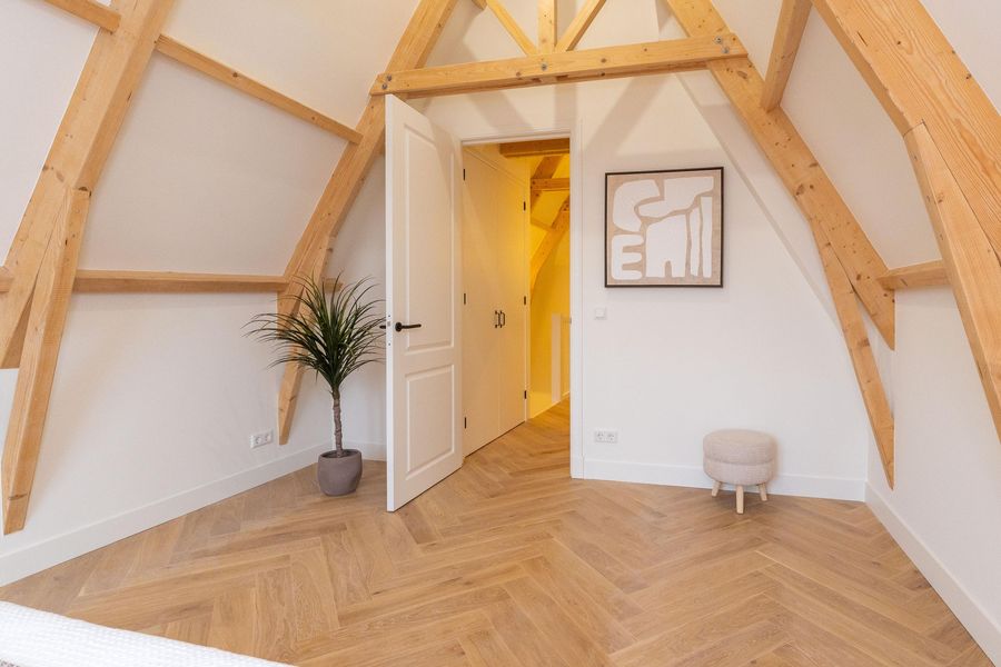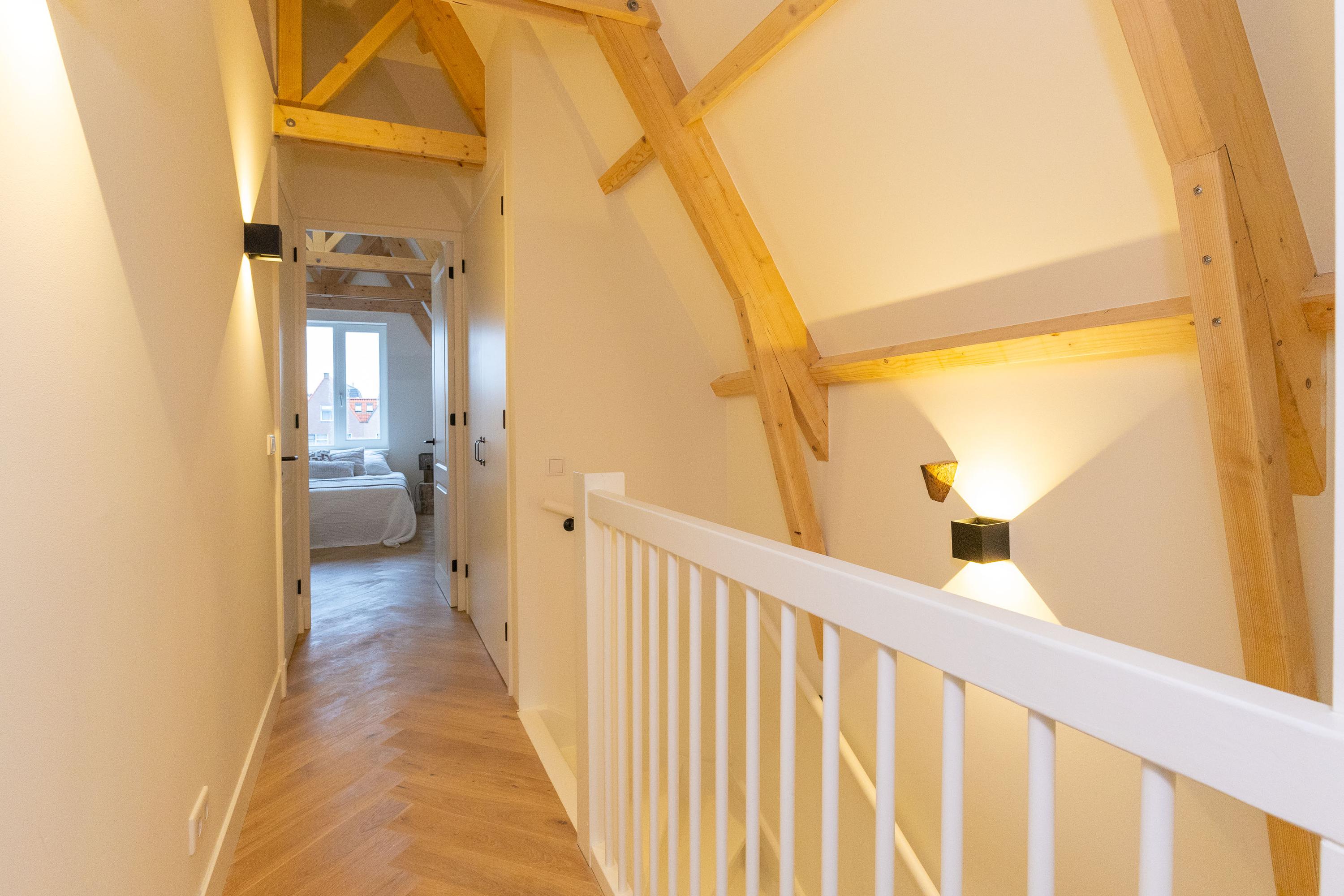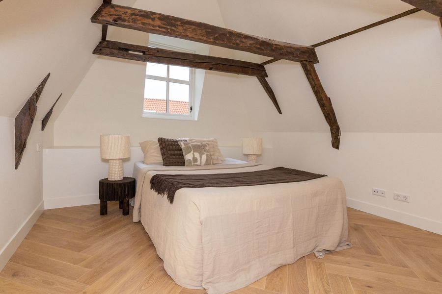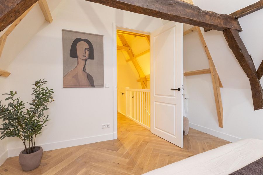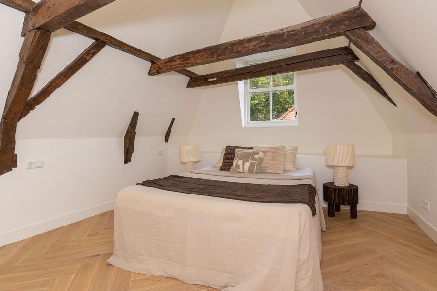 Op de bovenste woonlaag tref je twee bijzonder sfeervolle slaapkamers. Ook hier zorgen de houten balken, het licht, de hoogte en de hoogwaardige afwerking voor een sfeer van rust en luxe. De overloop is ruim en fraai opgezet – geen donkere tussenruimte, maar een echte toevoeging aan het geheel.
