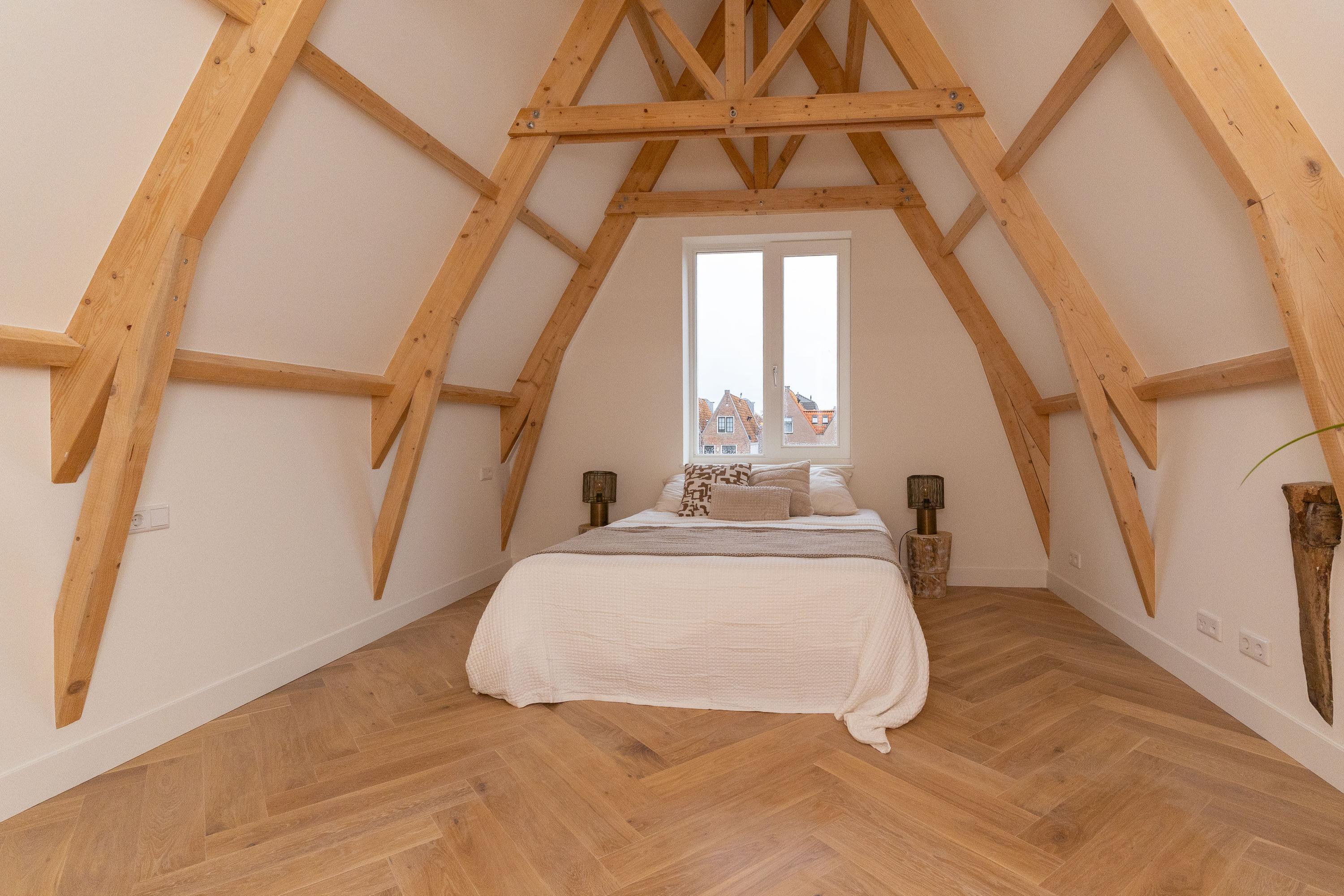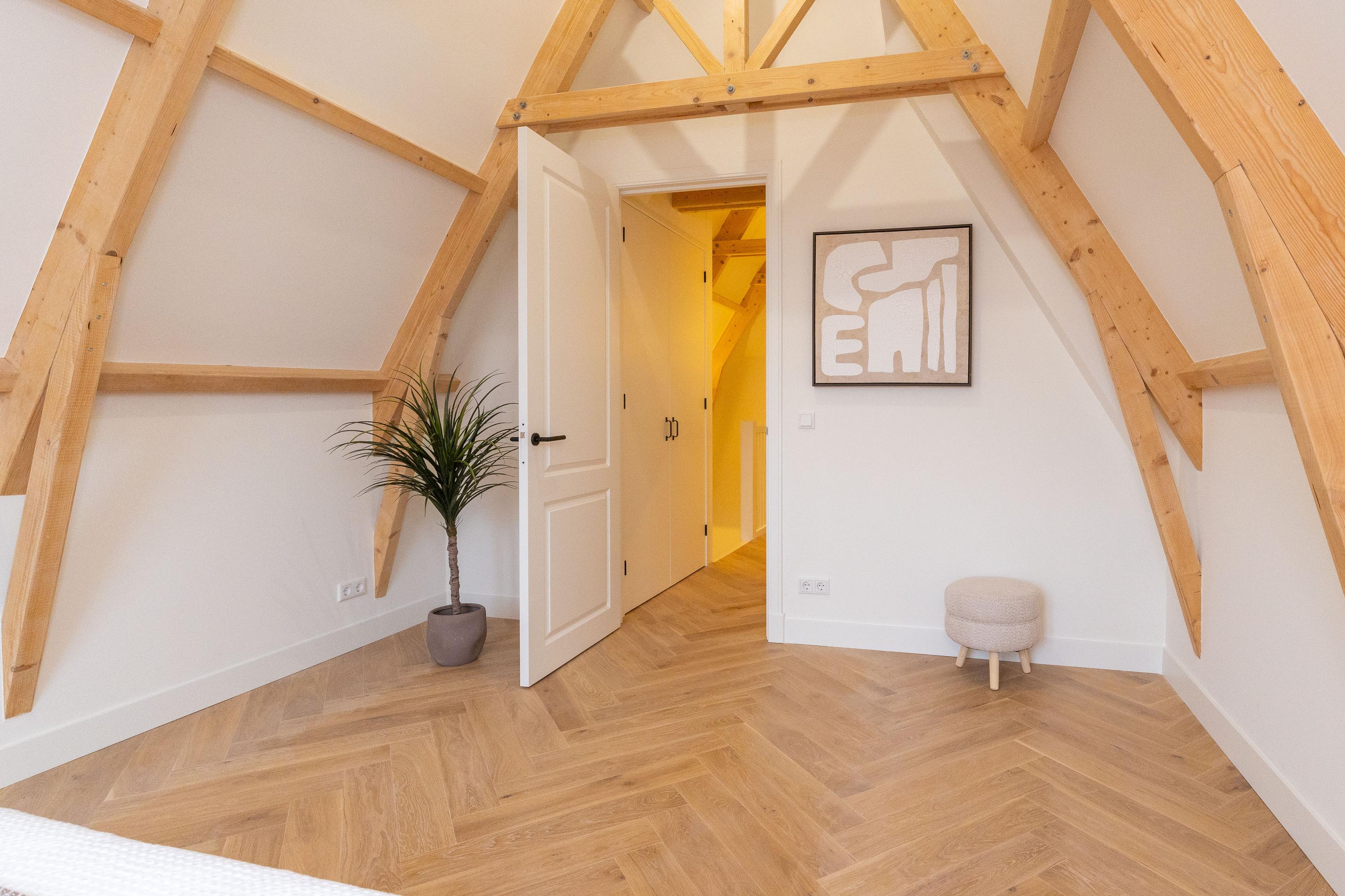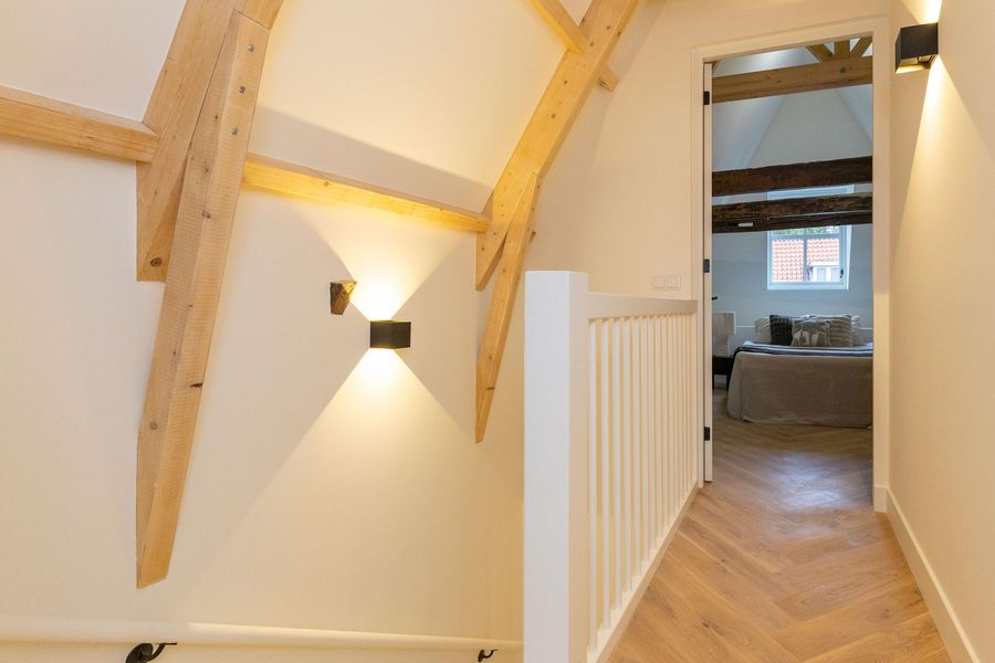 Op de bovenste woonlaag tref je twee bijzonder sfeervolle slaapkamers. Ook hier zorgen de houten balken, het licht, de hoogte en de hoogwaardige afwerking voor een sfeer van rust en luxe. De overloop is ruim en fraai opgezet – geen donkere tussenruimte, maar een echte toevoeging aan het geheel.