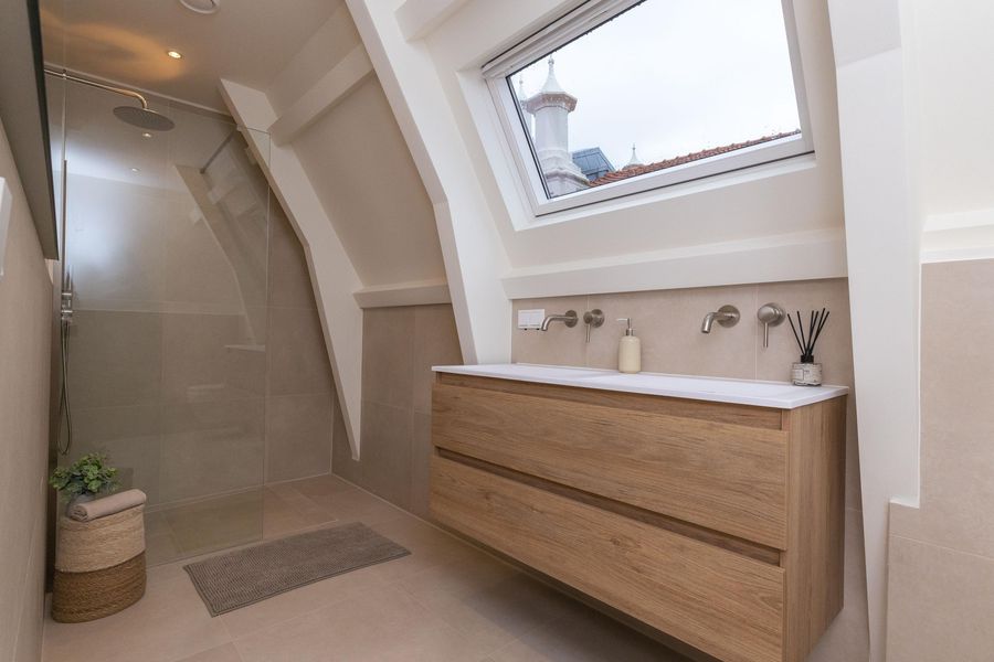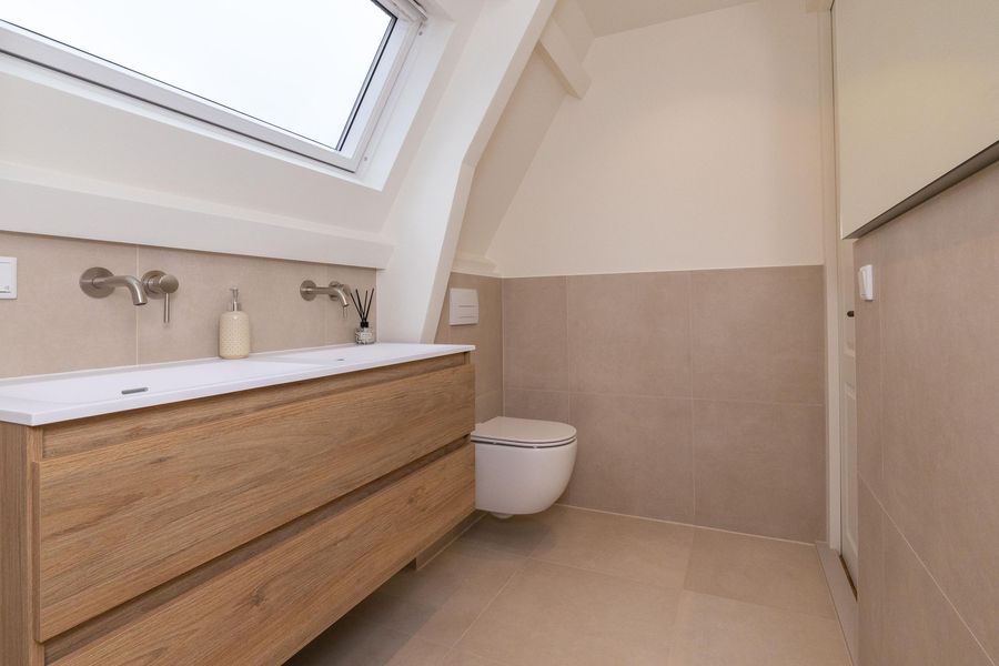 - Toilet, dubbele wastafel, wastafelmeubel, inloopdouche en vloerverwarming