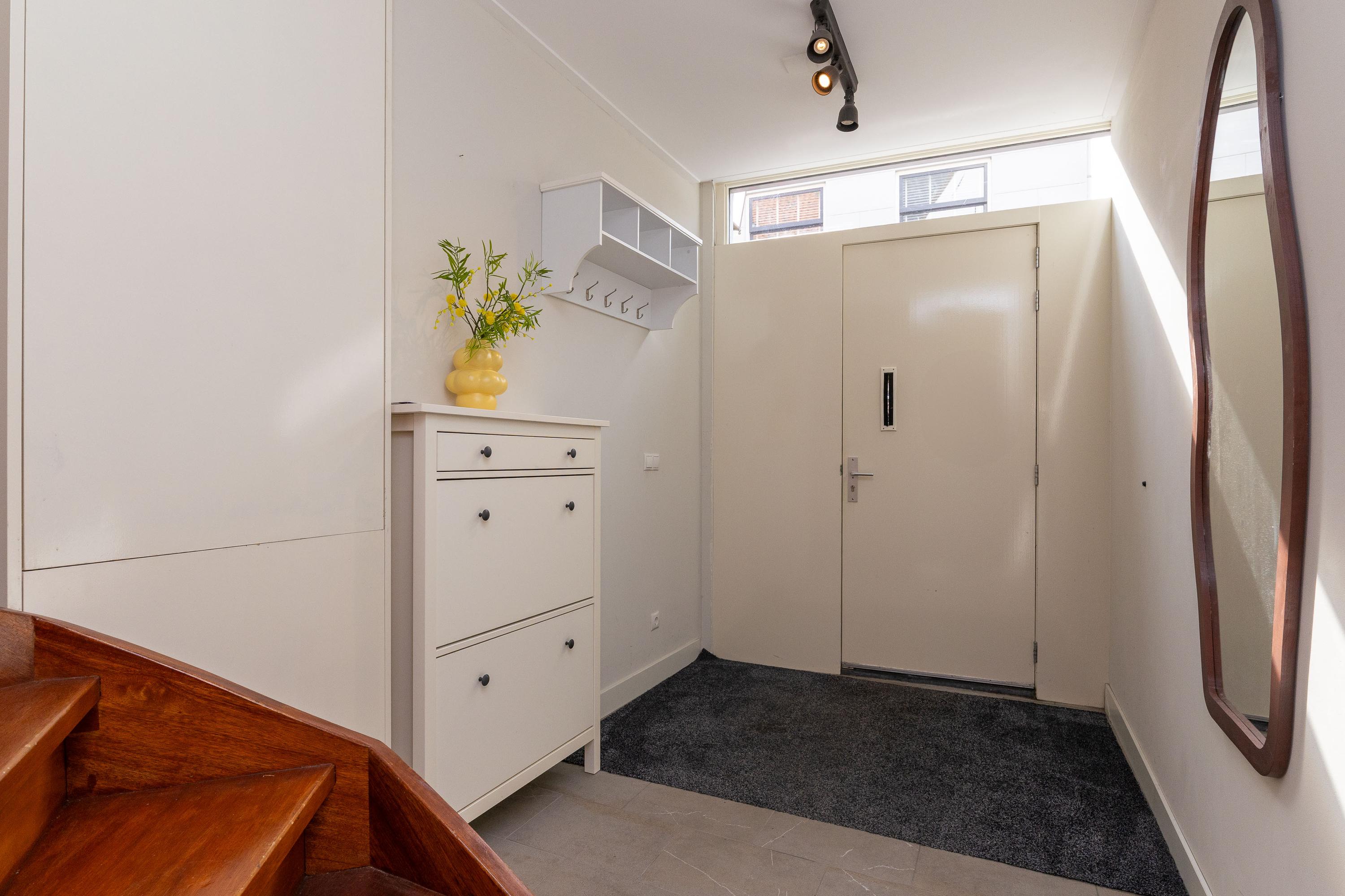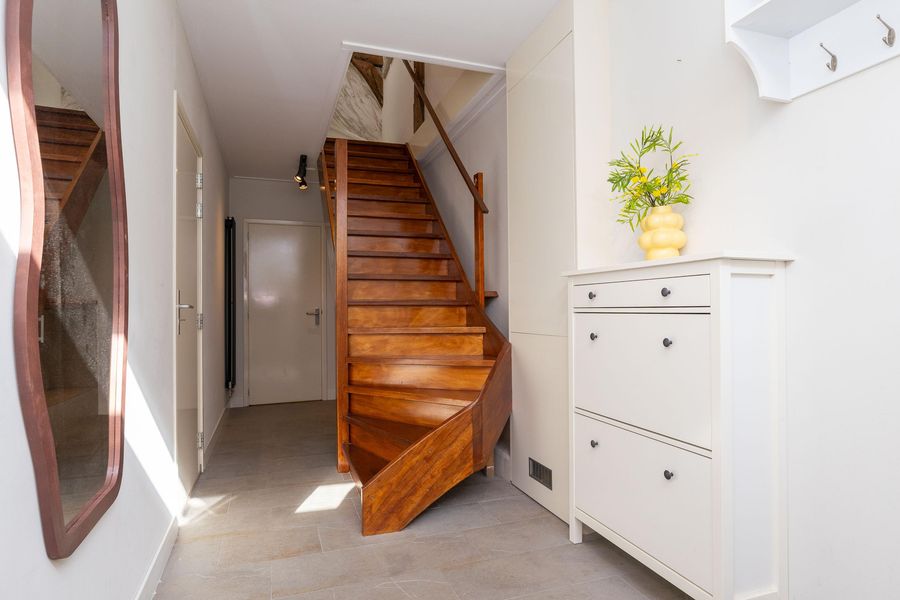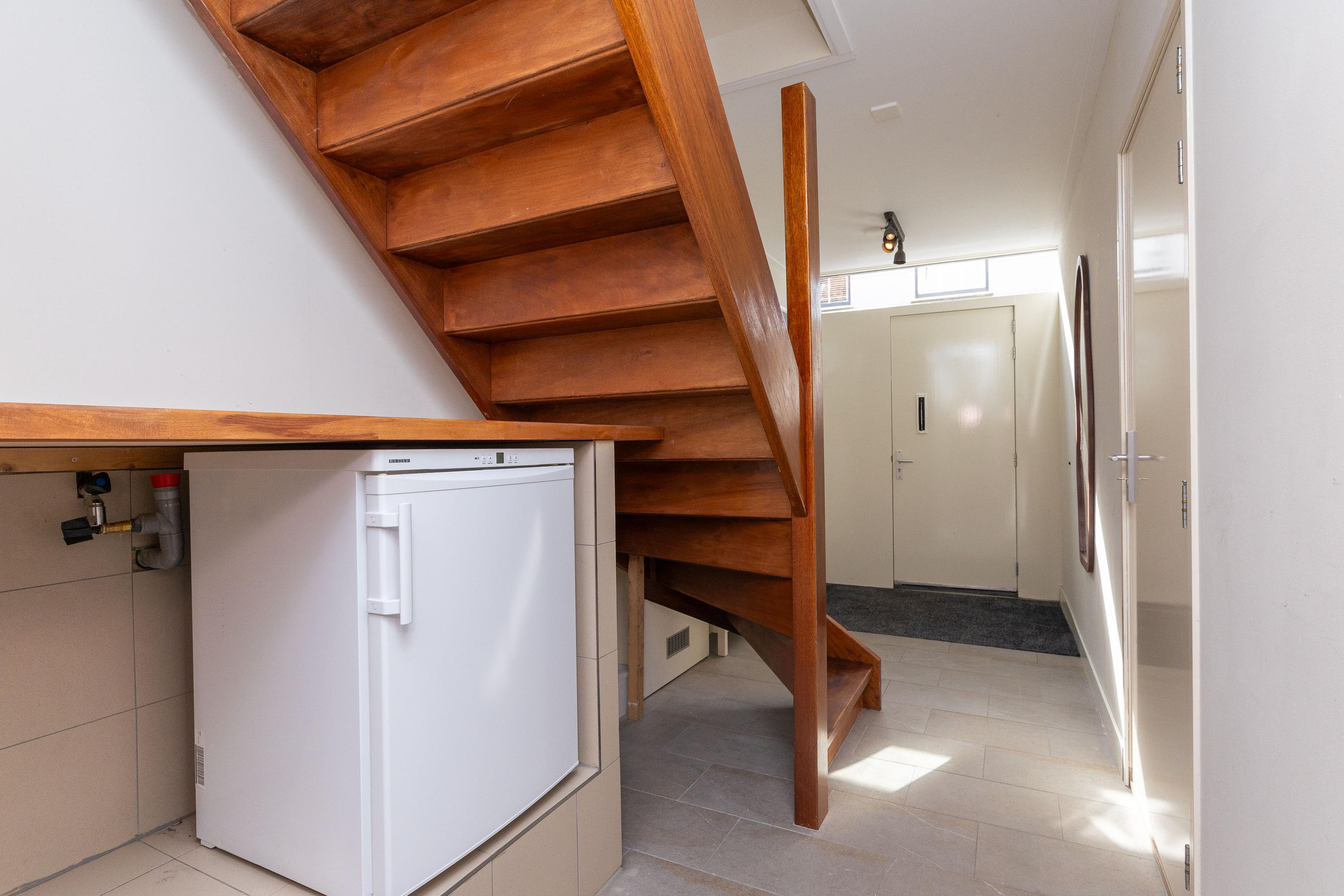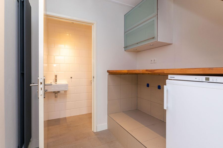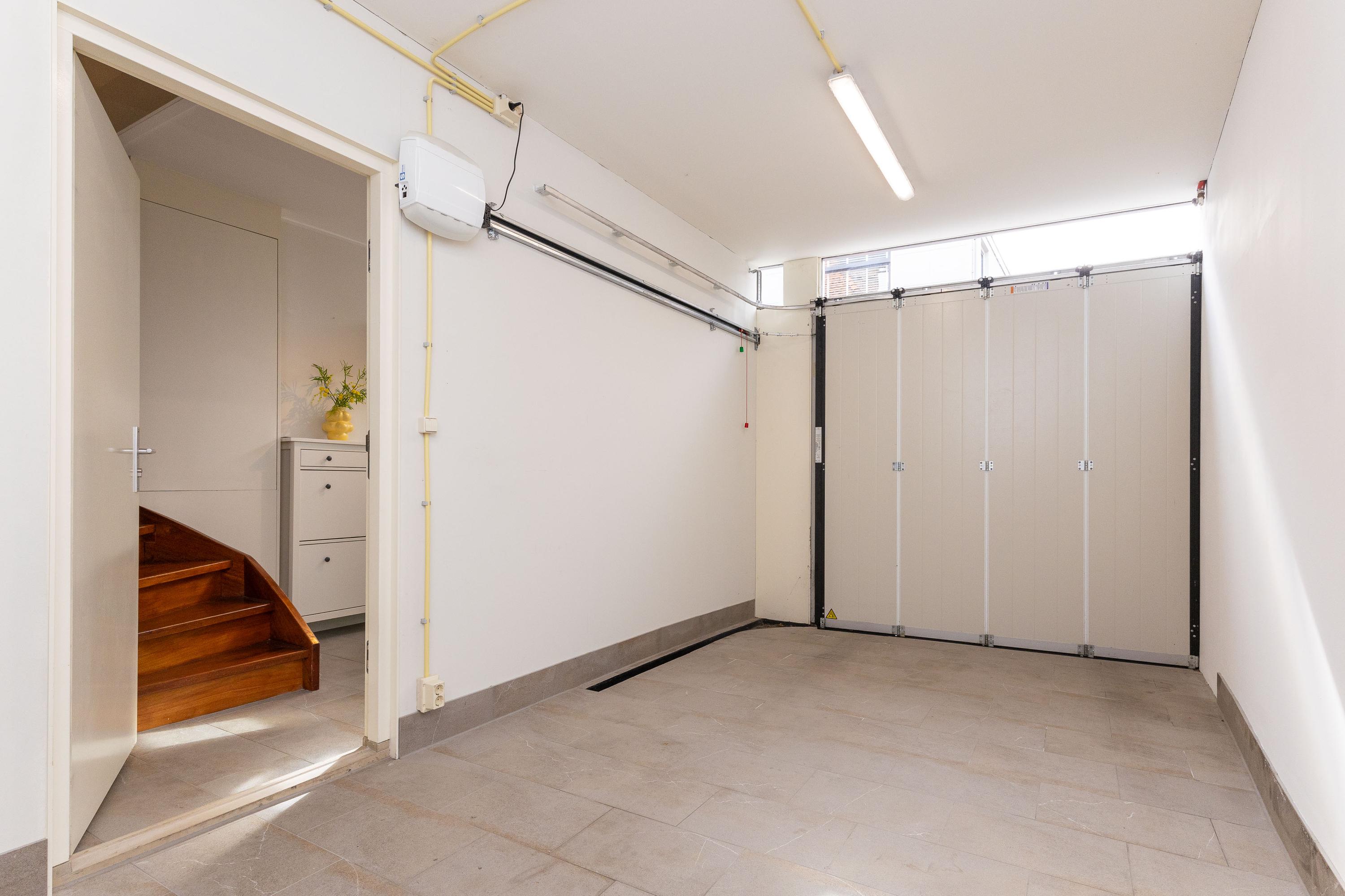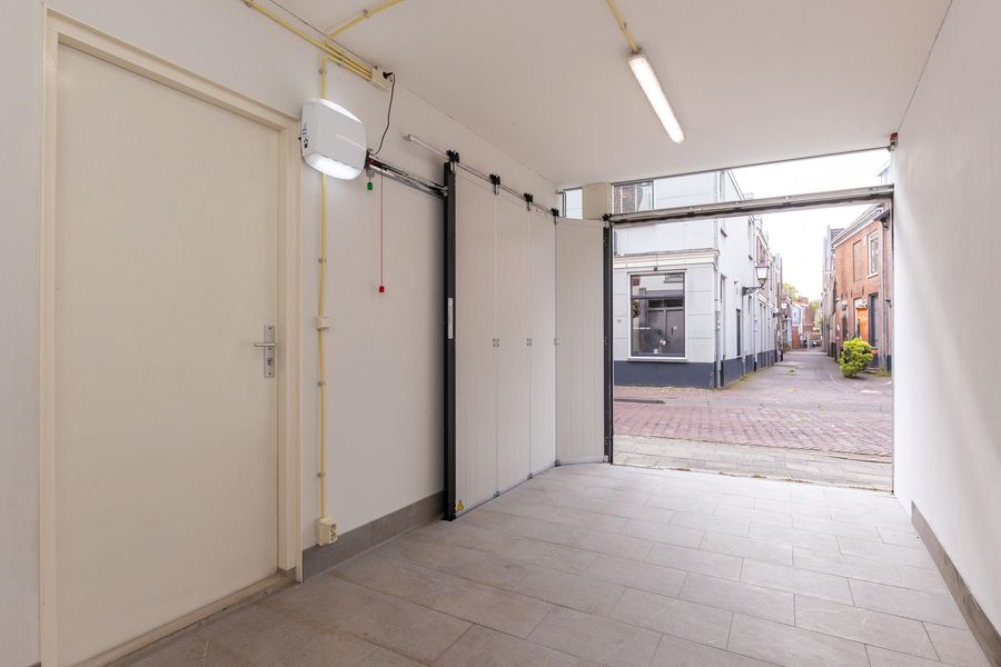 Entree, riante hal met meterkast, garderobe, opstelling van de wasmachine en droger en cDe gehele begane grond is voorzien van een plavuizen vloer. De garage en berging zijn binnendoor bereikbaar en de garage is voorzien van een elektrisch bedienbare deur. De garage is geschikt voor het stallen van een kleine auto en biedt daarnaast mogelijkheden tot het creëren van een extra (slaap)kamer of kantoorruimte. Wonen met een inpandige garage is zeer zeldzaam in hartje centrum!