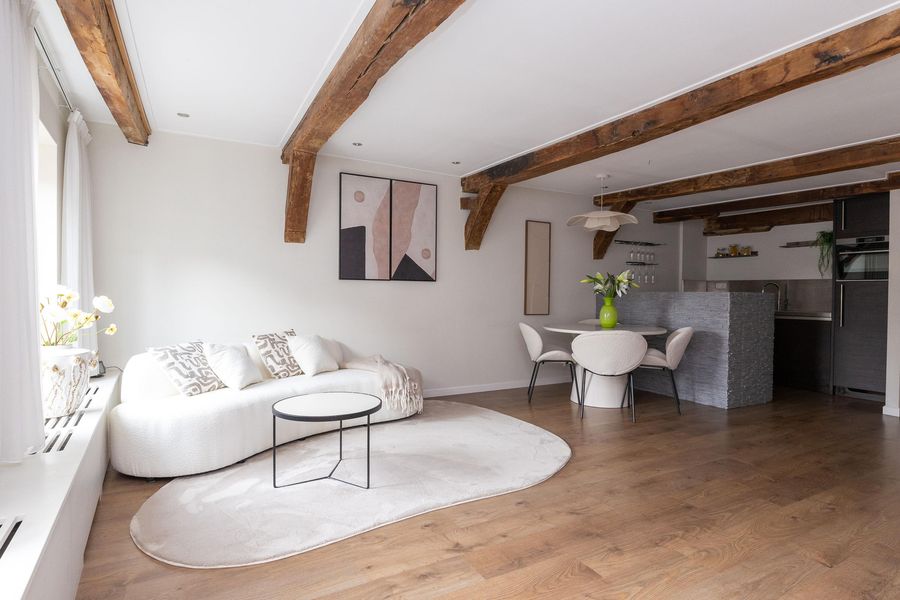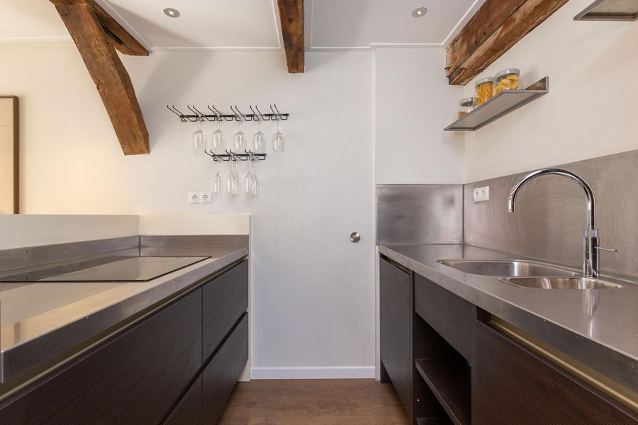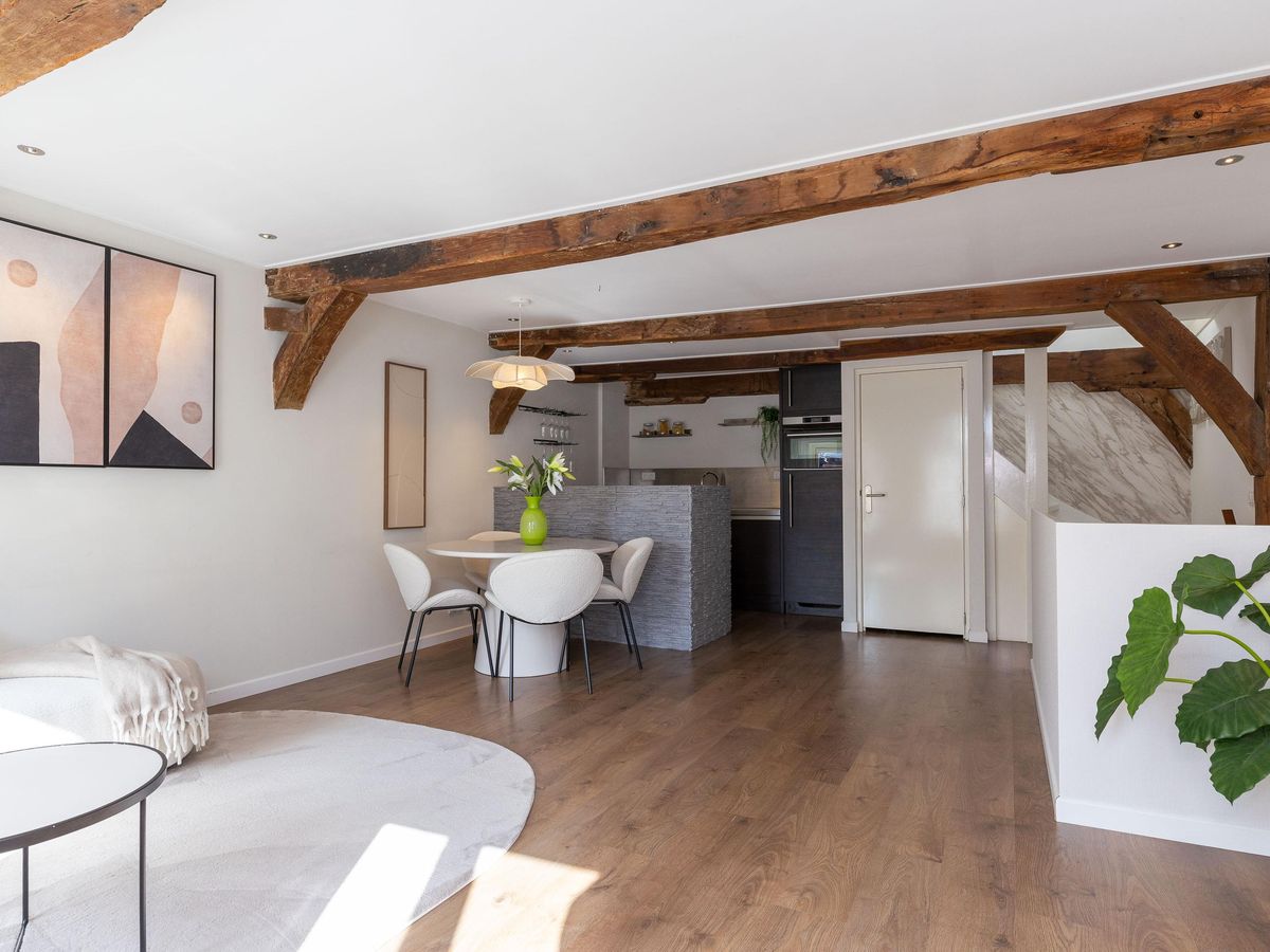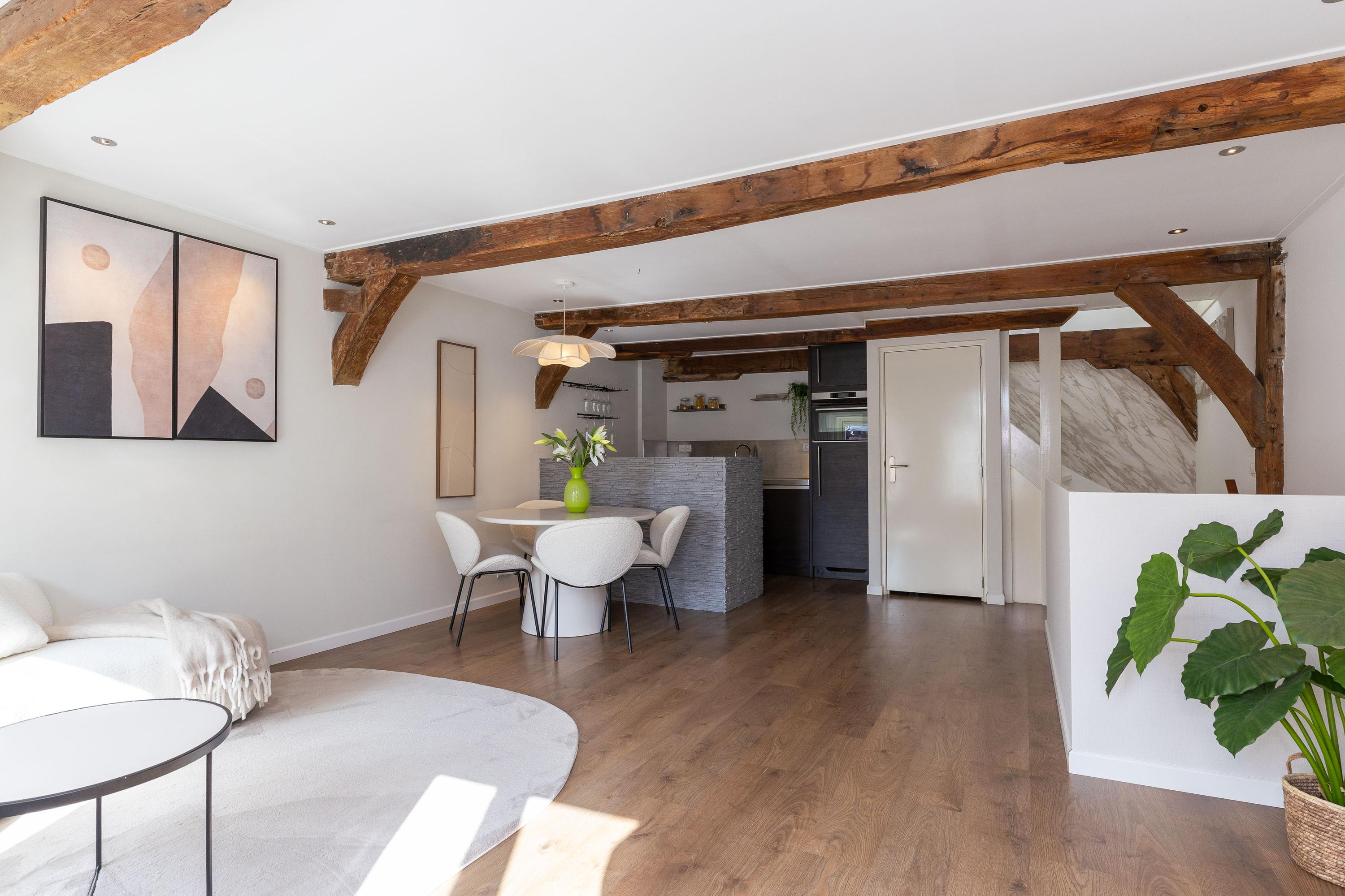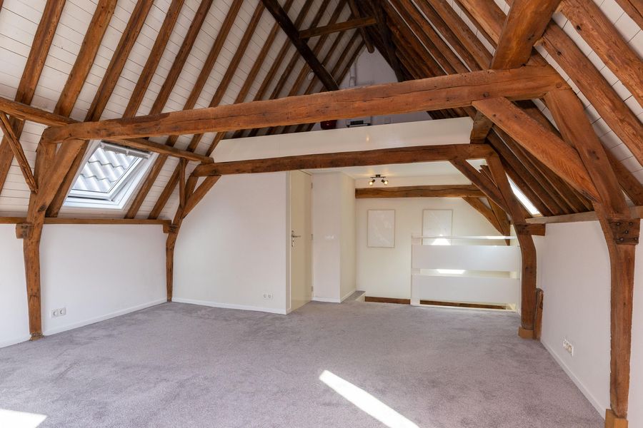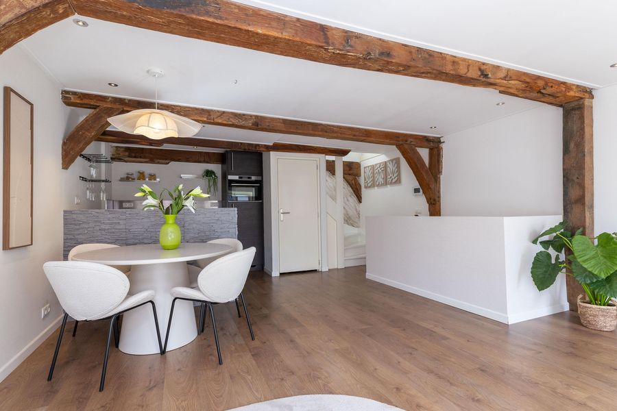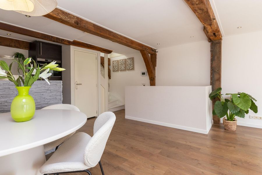 Op de eerste verdieping bevinden zich de keuken en de woonkamer. Met een oppervlakte van circa 36 m² is er voldoende ruimte voor een comfortabele zit- en eethoek. De parallel opgestelde keuken, met vaste bergkast, is voorzien van een Quooker, vaatwasser, combi-magnetron, koelkast en inductie kookplaat. Het sfeervolle balkenplafond is uitgerust met inbouwspots, de strakke wand- en plafondafwerking maken het geheel compleet.