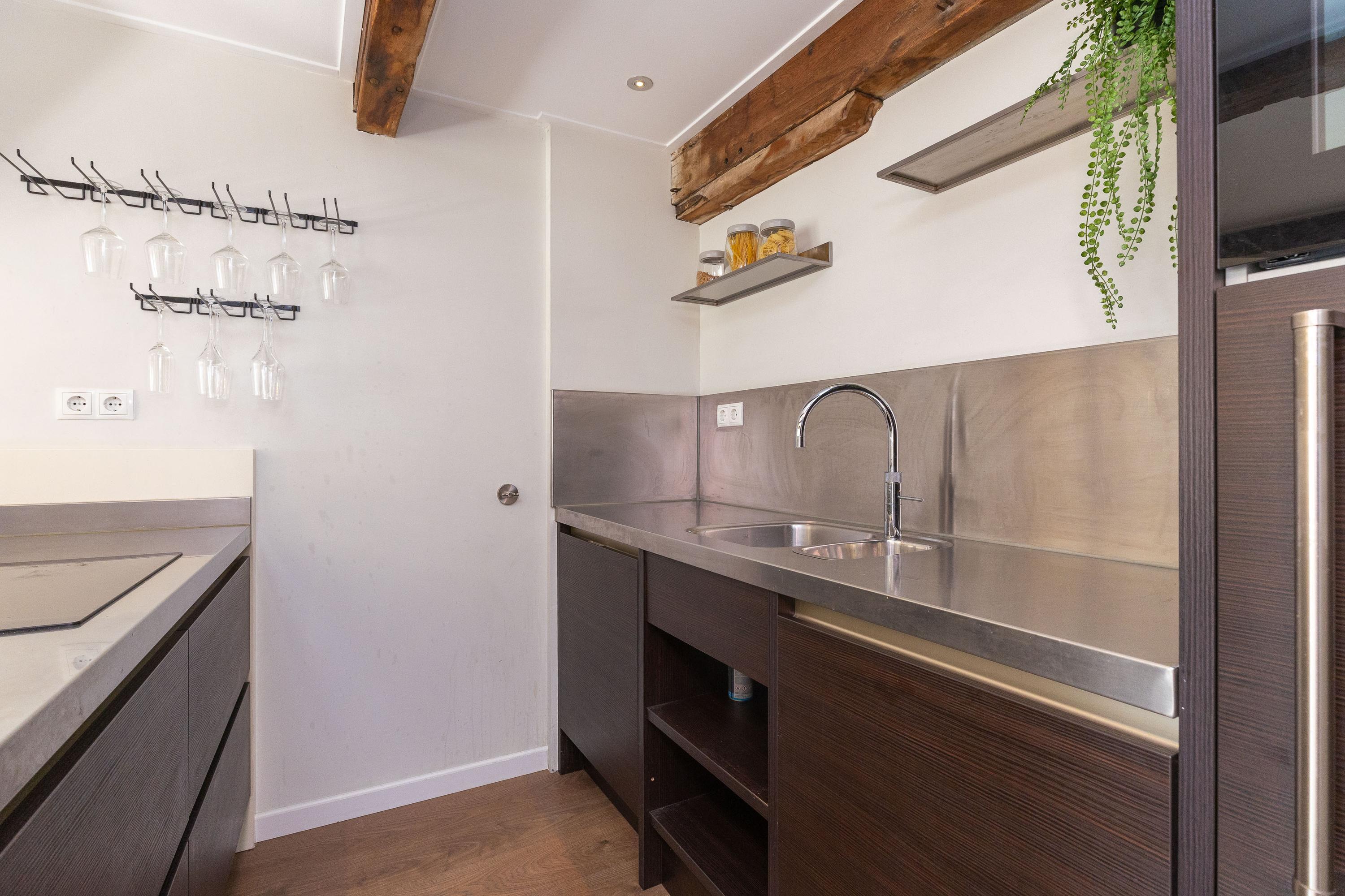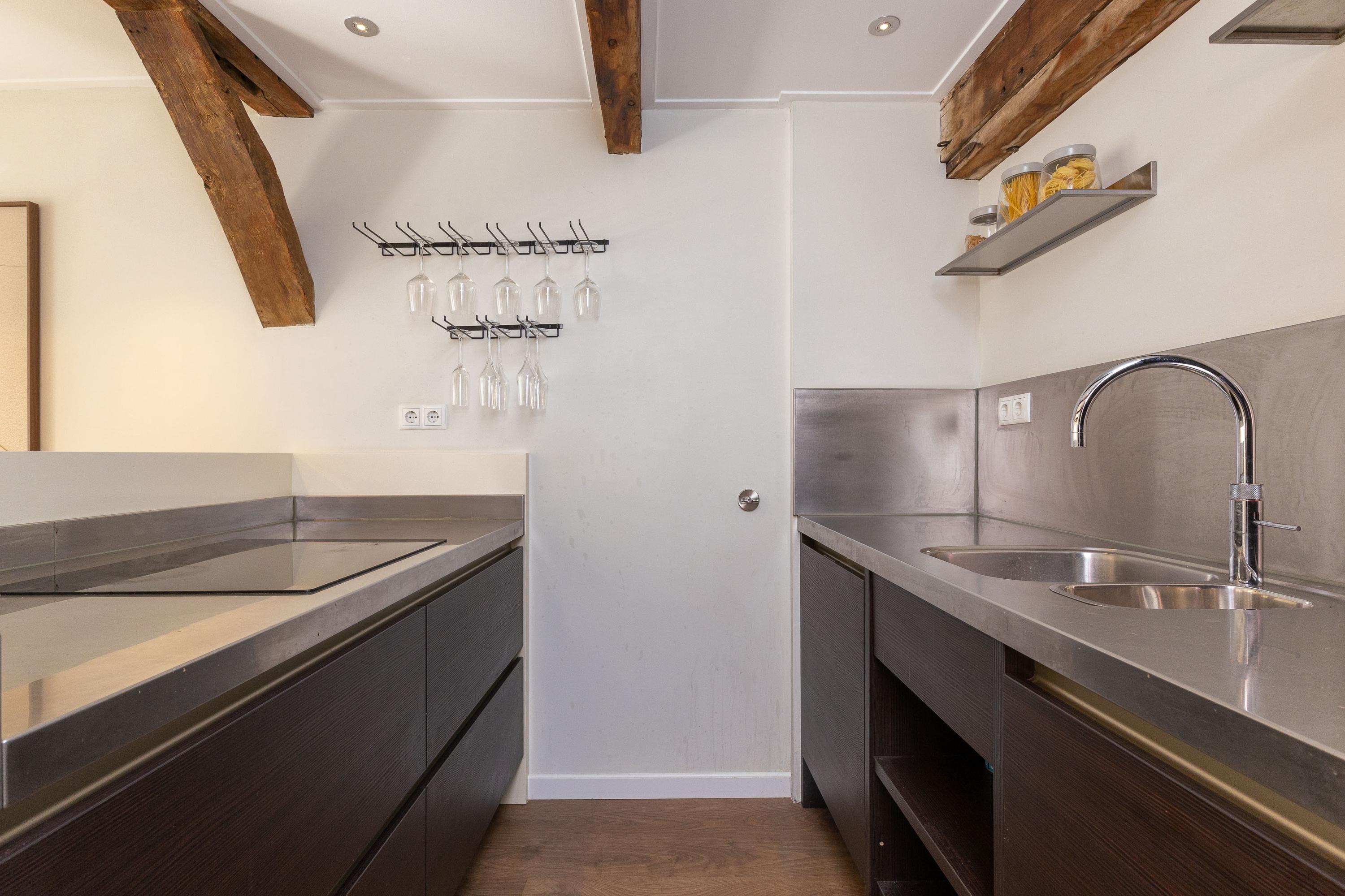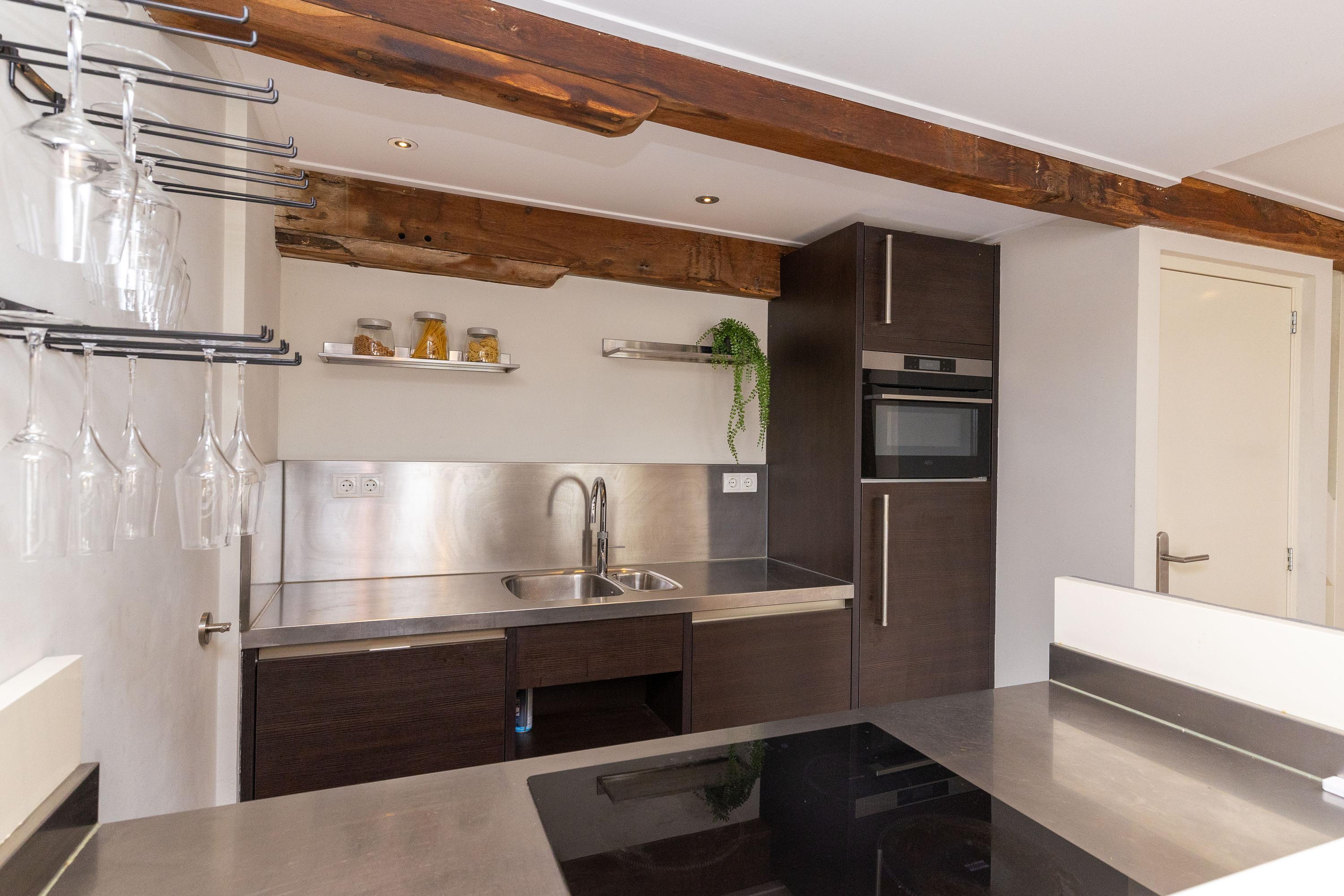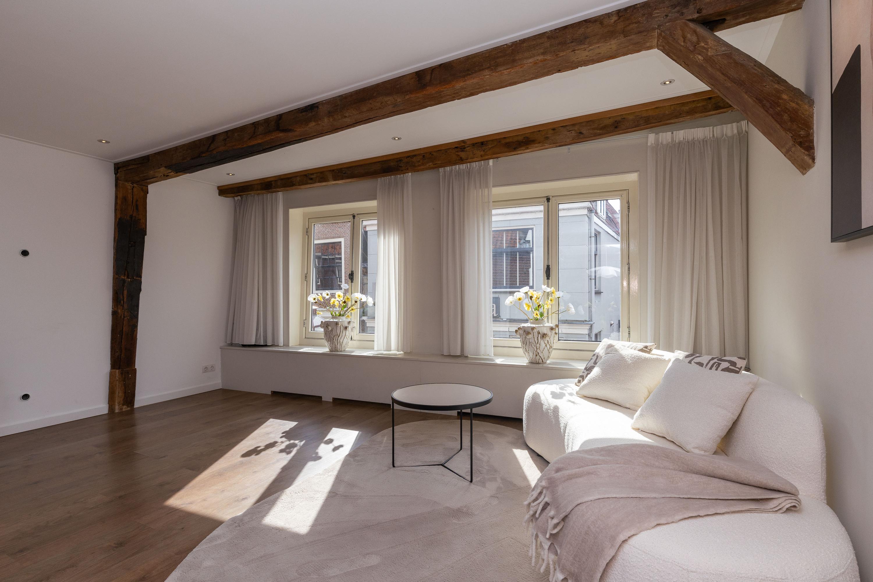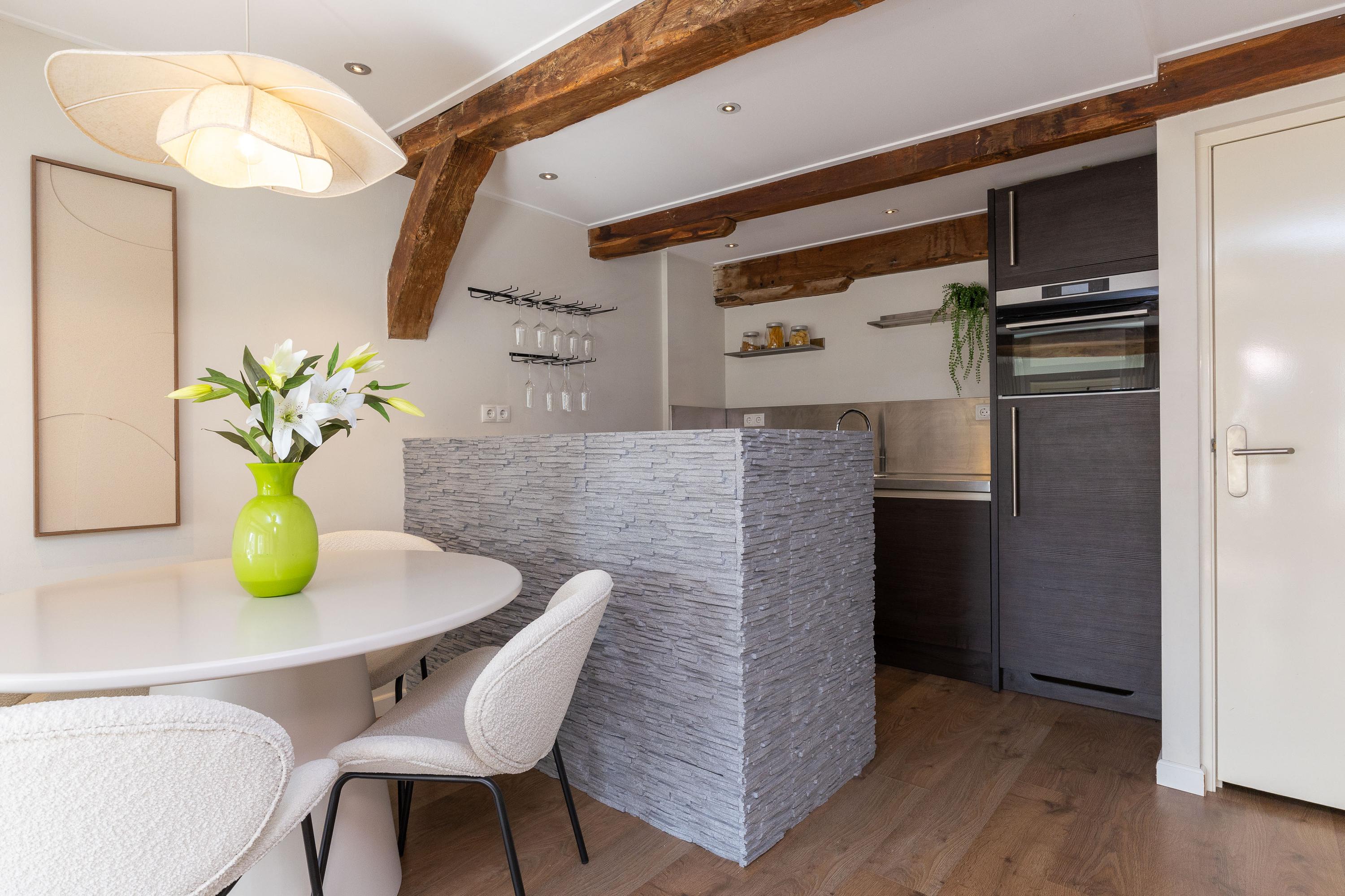 Op de eerste verdieping bevinden zich de keuken en de woonkamer. Met een oppervlakte van circa 36 m² is er voldoende ruimte voor een comfortabele zit- en eethoek. De parallel opgestelde keuken, met vaste bergkast, is voorzien van een Quooker, vaatwasser, combi-magnetron, koelkast en inductie kookplaat. Het sfeervolle balkenplafond is uitgerust met inbouwspots, de strakke wand- en plafondafwerking maken het geheel compleet.