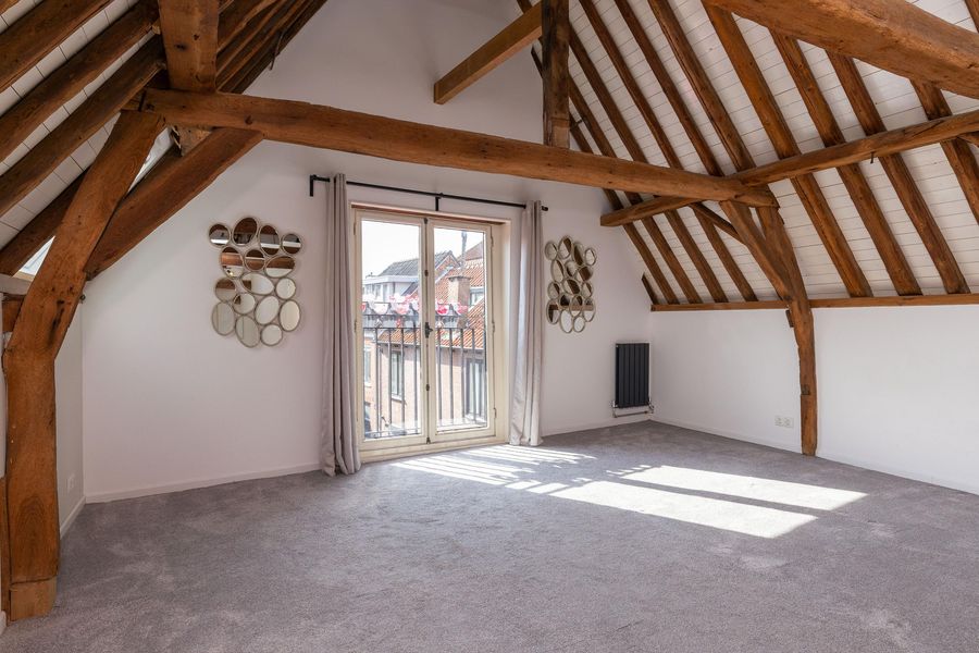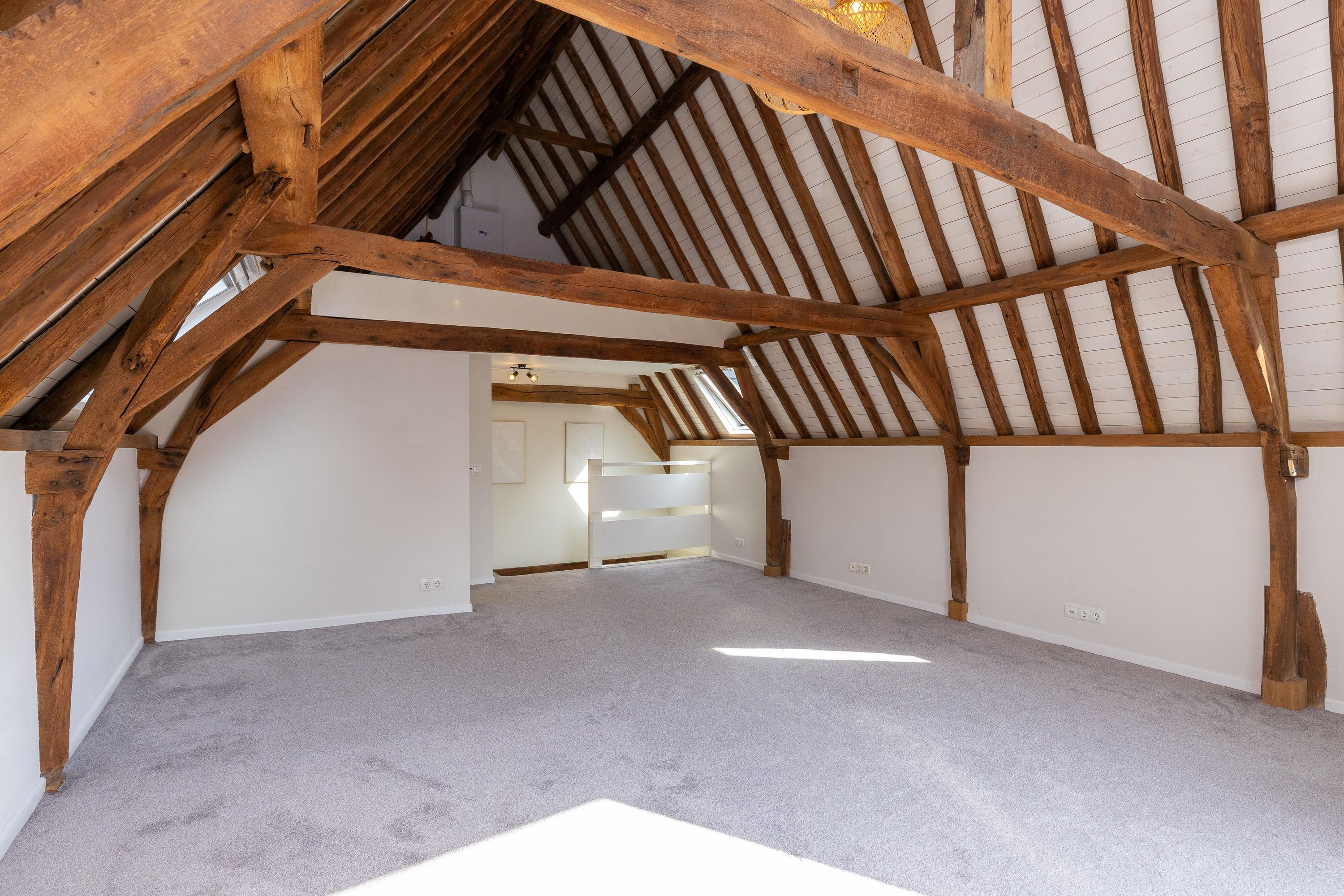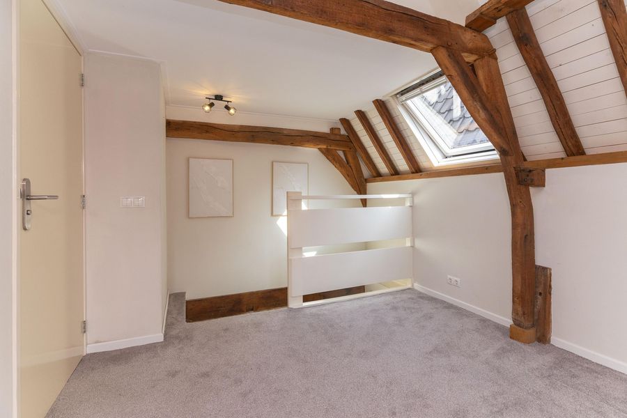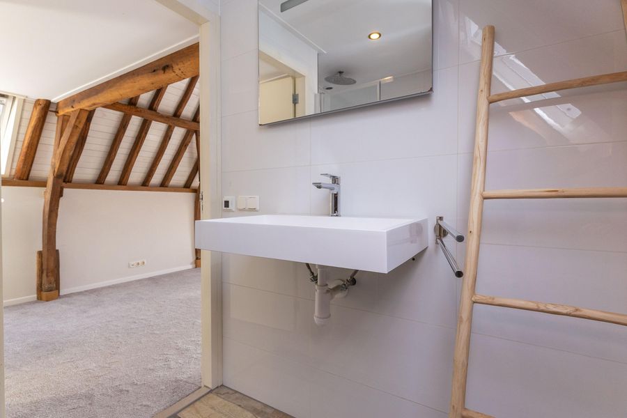 De tweede verdieping is in gebruik als open slaapverdieping met hoge nok en badkamer ensuite. Echt prachtig! De badkamer met inloopdouche, tweede toilet en wastafel is volledig betegeld en verwarmd middels vloerverwarming. Vanaf de verdieping heb je toegang tot de bergvliering, waar tevens de opstelling van de CV-ketel (2025) staat. Het appartement heeft energielabel D.