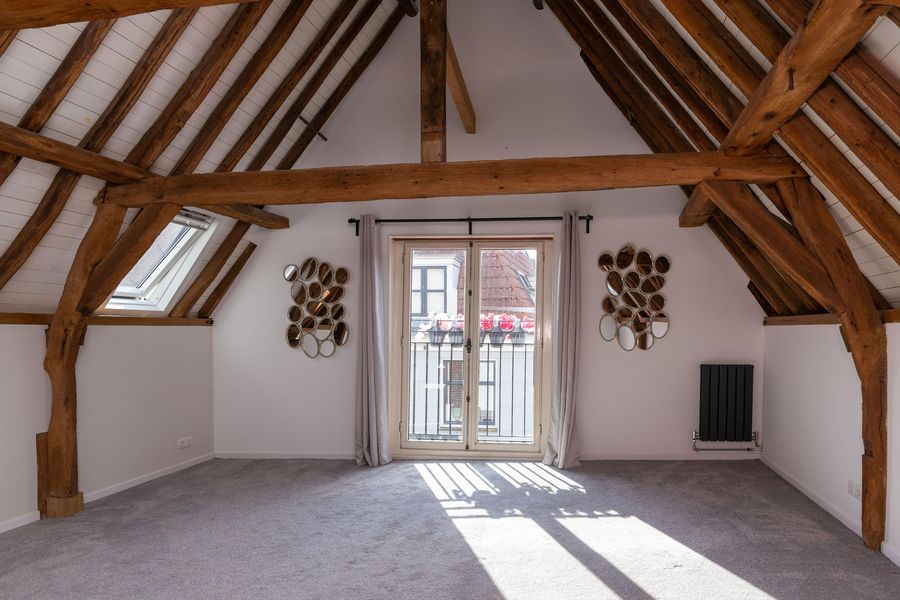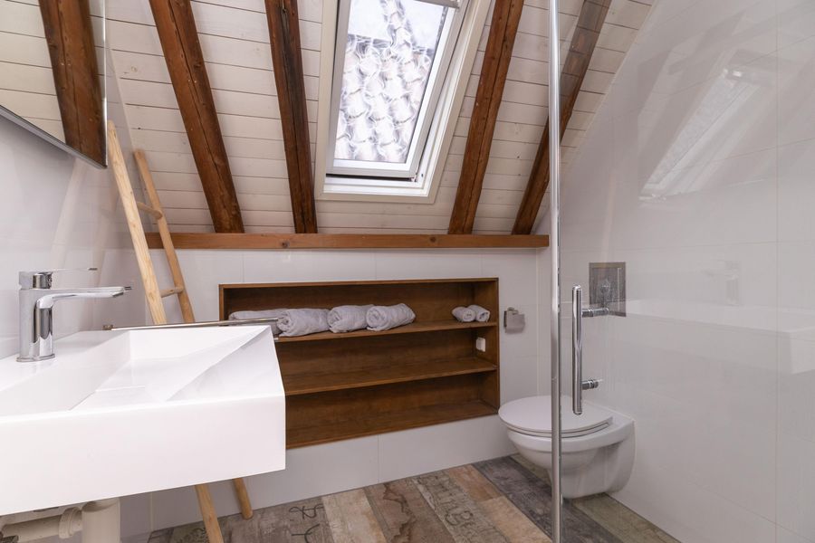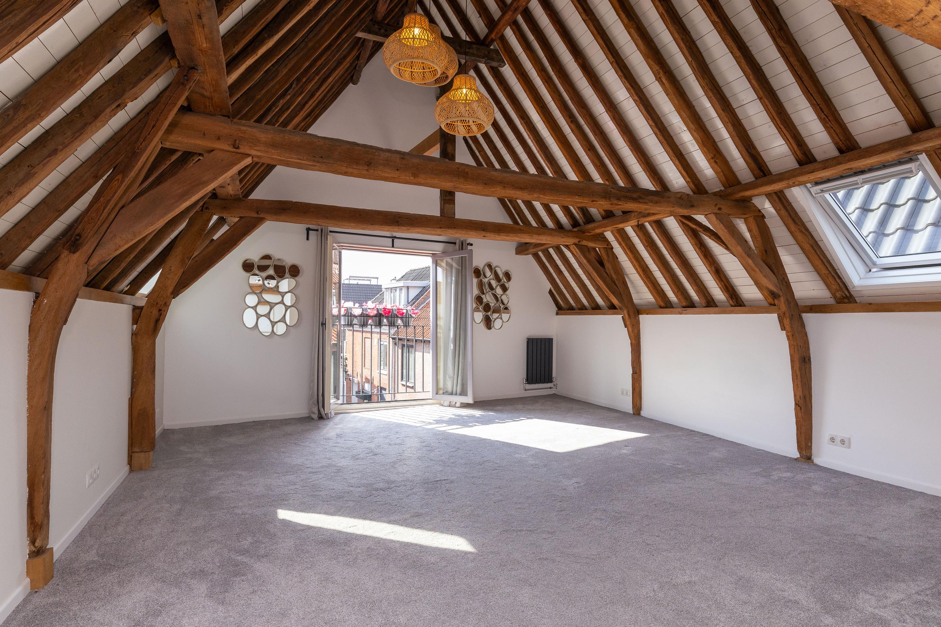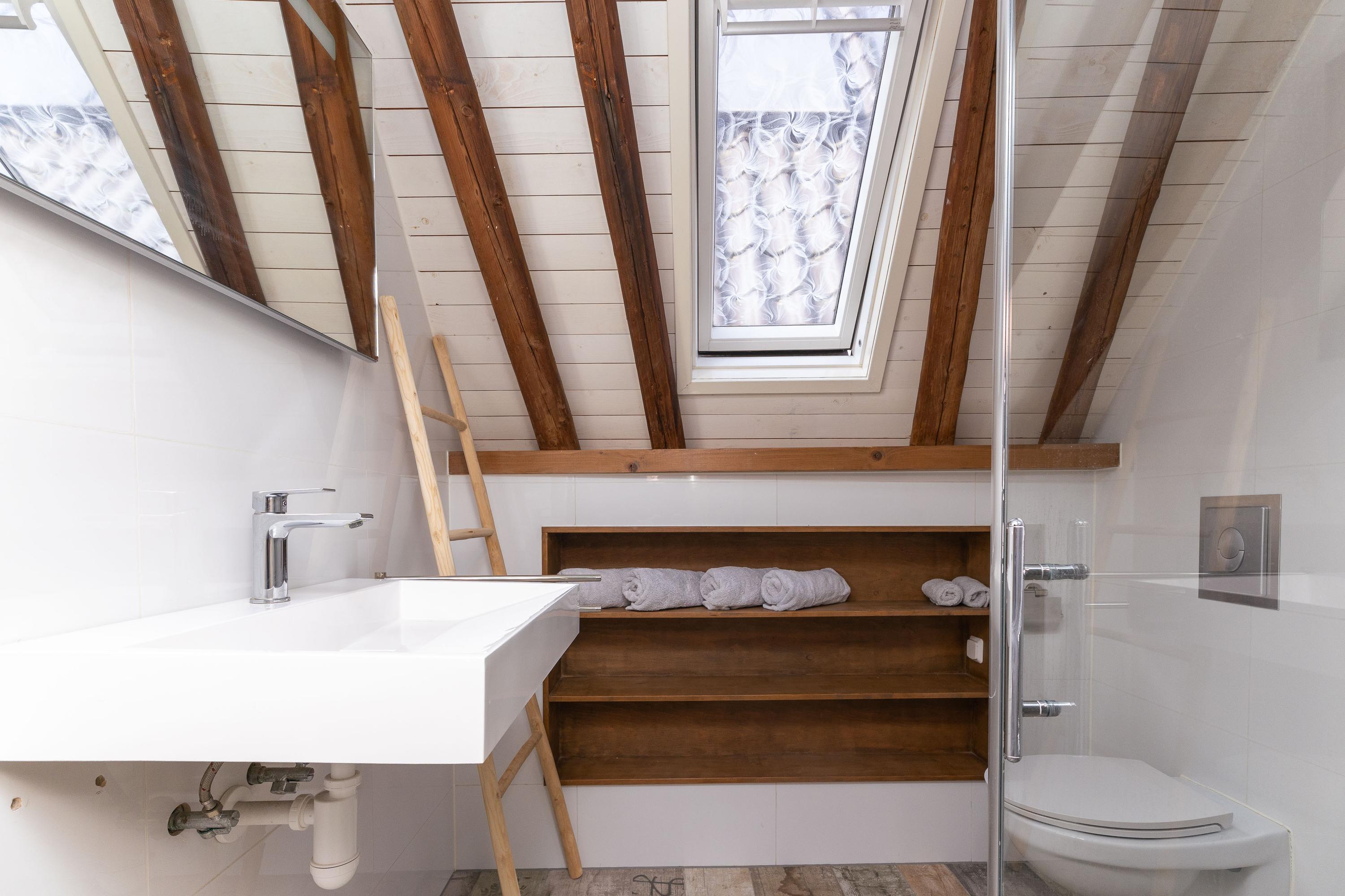De tweede verdieping is in gebruik als open slaapverdieping met hoge nok en badkamer ensuite. Echt prachtig! De badkamer met inloopdouche, tweede toilet en wastafel is volledig betegeld en verwarmd middels vloerverwarming. Vanaf de verdieping heb je toegang tot de bergvliering, waar tevens de opstelling van de CV-ketel (2025) staat. Het appartement heeft energielabel D.